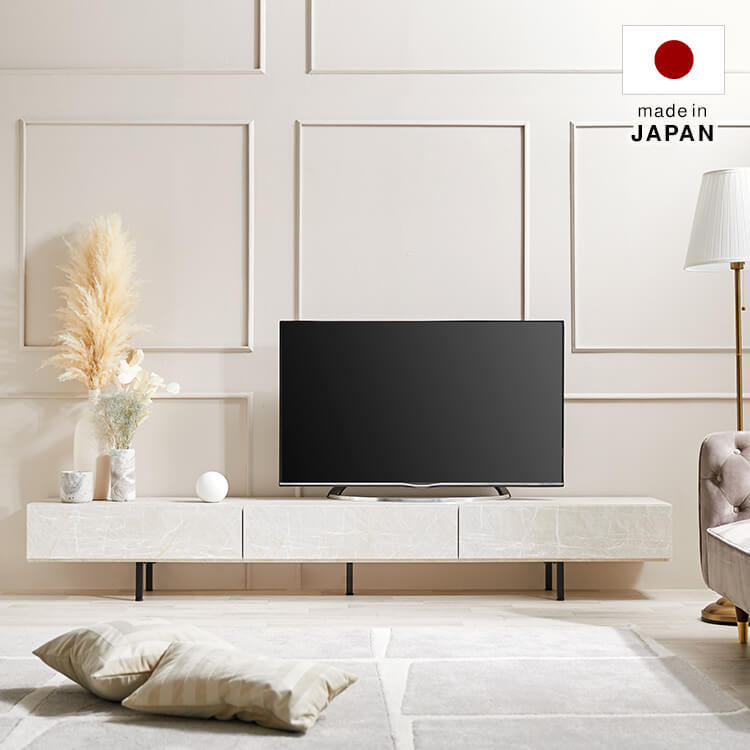 置くだけでお部屋の雰囲気を格上げしてくれる日本製テレビボード。「大理石柄」や「モルタル柄」のお洒落な柄を纏ったデザインとこだわりの機能性で、長く使っていただける逸品です。こちらの商品は、当社デザイナーが独自のこだわりを持って完成させたオリジナル商品。シンプルで洗練されたデザインで使い勝手の良いテレビボードをカタチにしました。テレビボードの本体には、「大理石柄」と「モルタル柄」を採用。高い技術を持つ職人がこだわりを持ってつくったこの柄は、近くで見ても柄素材だと分からないほど、リアルな素材感です。こちらのテレビボードは、470余年にわたる家具づくりの歴史を持つ「家具の街・大川」でつくられています。熟練の家具職人が一つ一つ丁寧に、匠のプライドと情熱を詰め込んだ完成度の高い商品です。