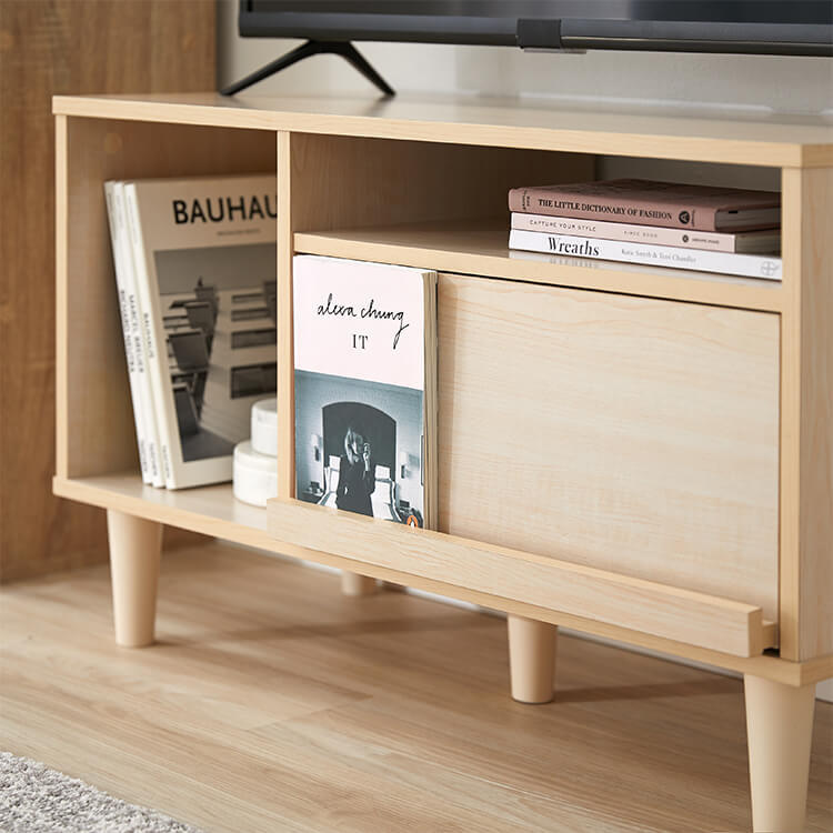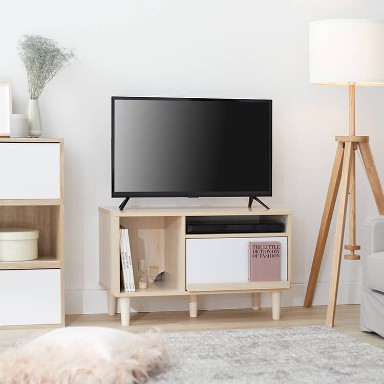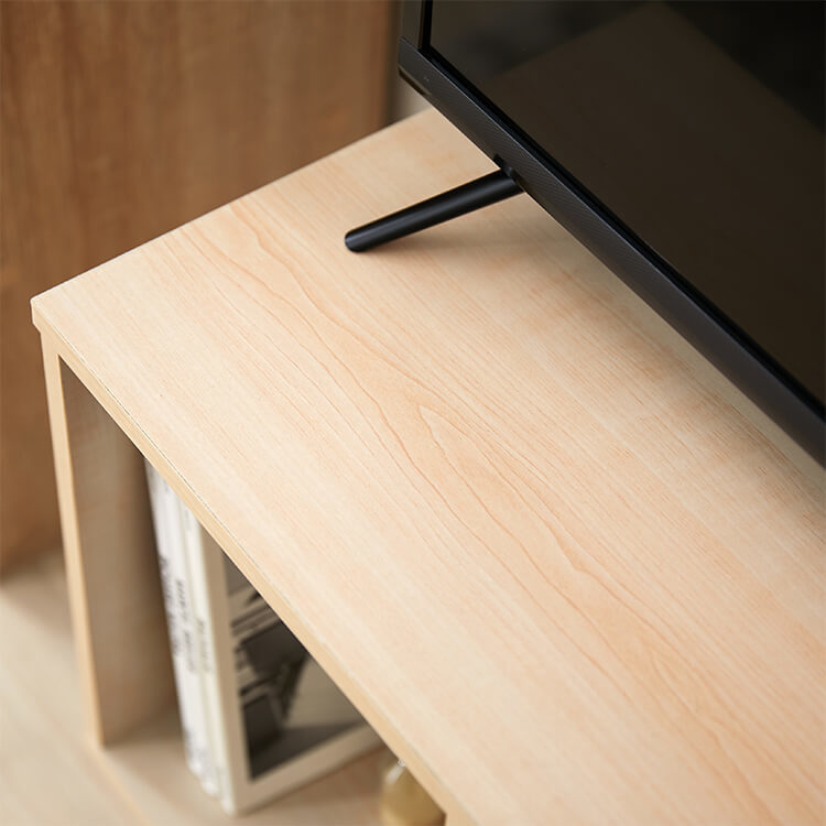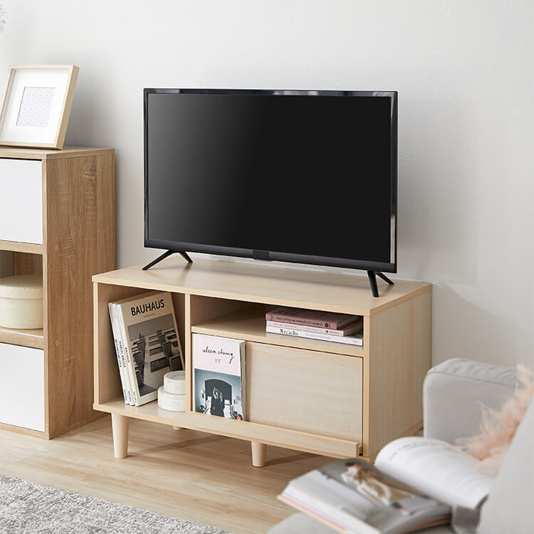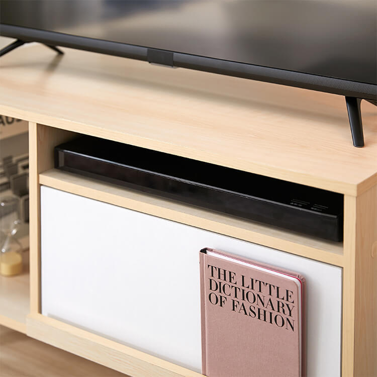 ひとり暮らしやワンルームなど、テレビ台であまりスペースを取りたくないという方にぴったりのコンパクトサイズ。コンパクトさの中に、使い勝手の良い収納スペースをたっぷり確保しました。ワンポイントカラーが目を引く、おしゃれさも魅力です。前板はナチュラルかホワイトのどちらかお好きなカラーを組み立て時にお選びいただけます。ワントーンでシンプルに、ポイントカラーがオシャレな2トーンにしたりと、お好みやインテリアに合わせてお楽しみください。ワンルームや、狭いお部屋にもピッタリなコンパクトなサイズがこのテレビ台の魅力。ロータイプなので、圧迫感なくお部屋になじみます。