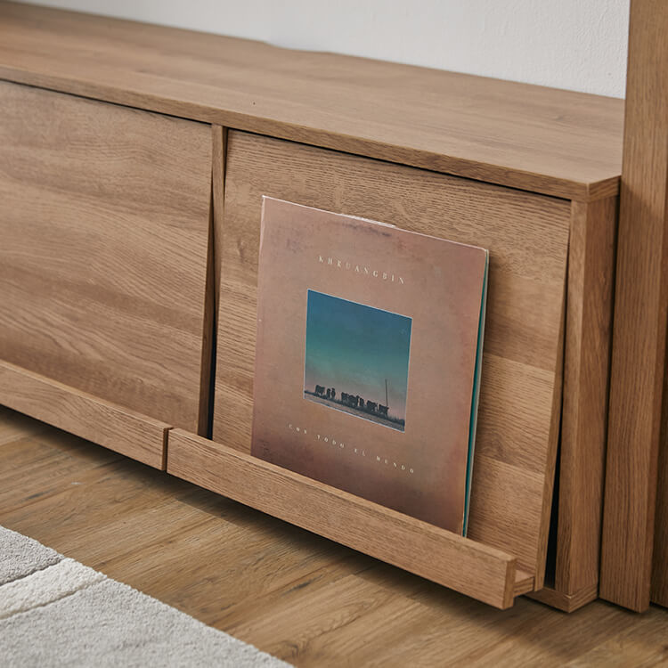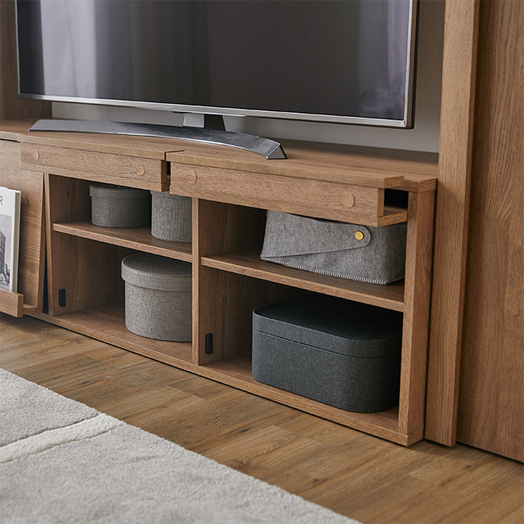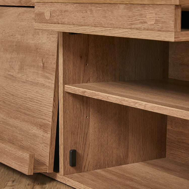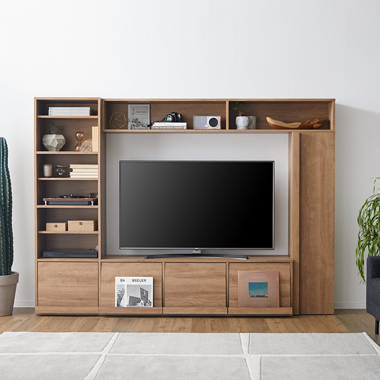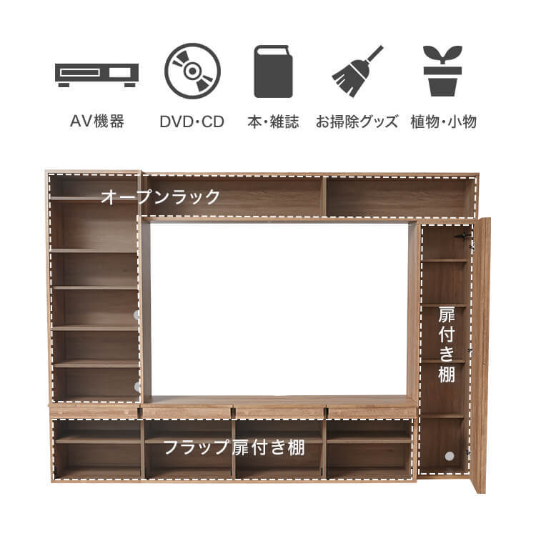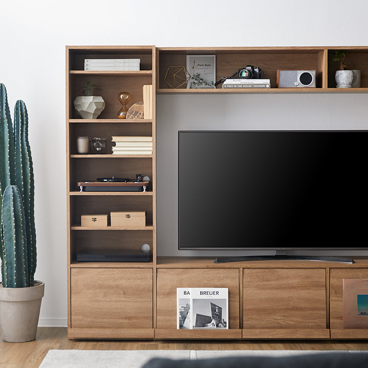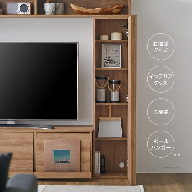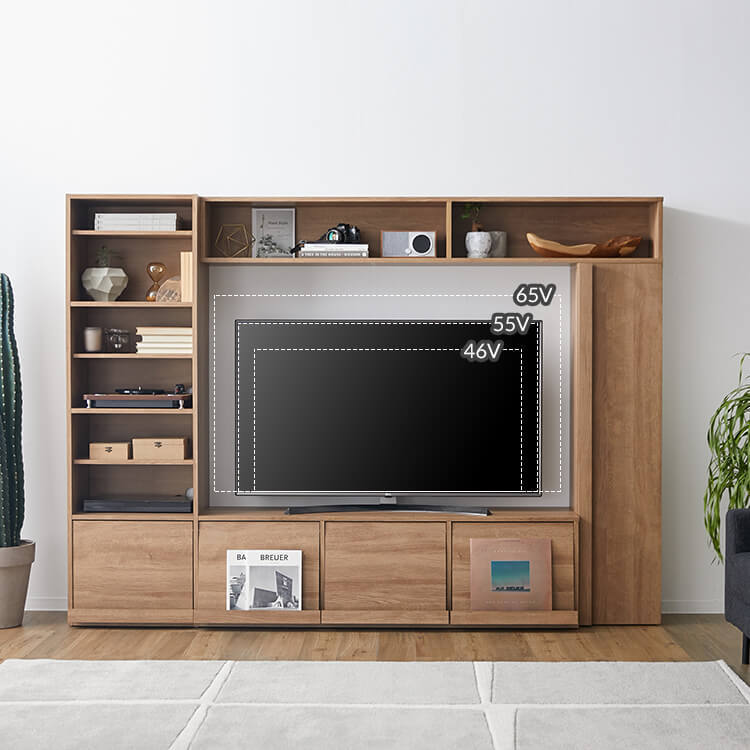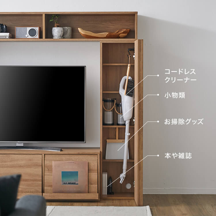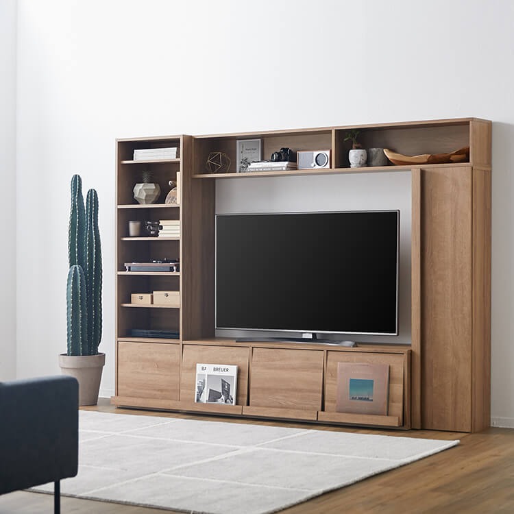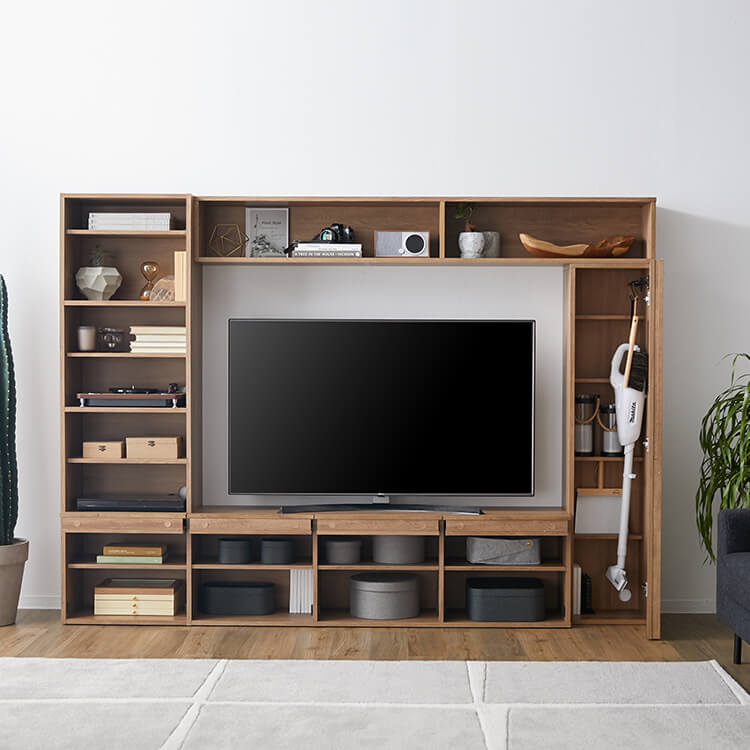 「魅せる」と「隠す」を両立させた大容量の収納力が魅力。大型テレビも置けて、掃除機の収納も叶う、おしゃれなアシンメトリーデザインのテレビボードです。壁面収納一体型ならではの大容量の収納スペースが魅力。お気に入りのモノをディスプレイしたり、すっきりと隠す収納をしたり。リビングをあなただけのお気に入り空間へと演出。自然な木目調がどんなお部屋にも馴染み、柔らかな落ち着く雰囲気に演出。リアルな木目が天然の木目を連想させてくれます。TV収納スペースには、最大65インチのテレビを置くことができる、ゆったり設計です。※設置テレビの重さは種類で異なりますので、サイズ・重量を必ずお確かめください。
