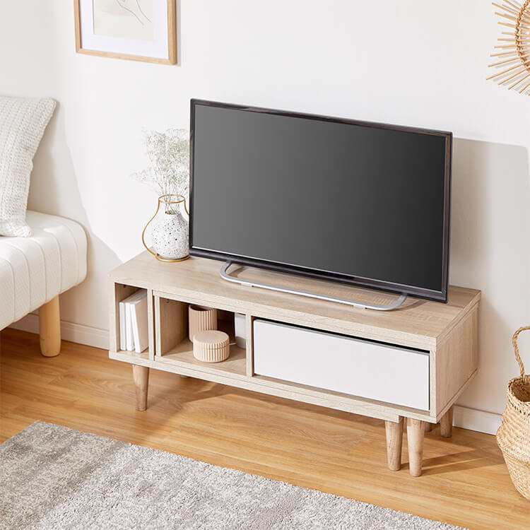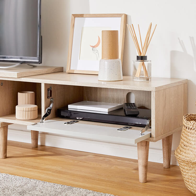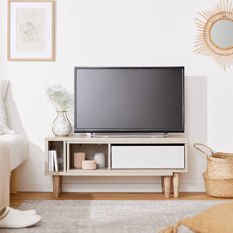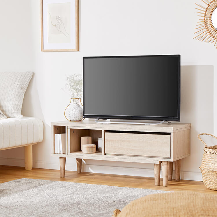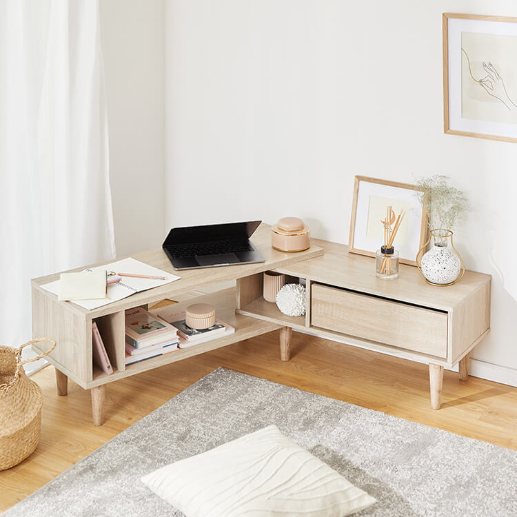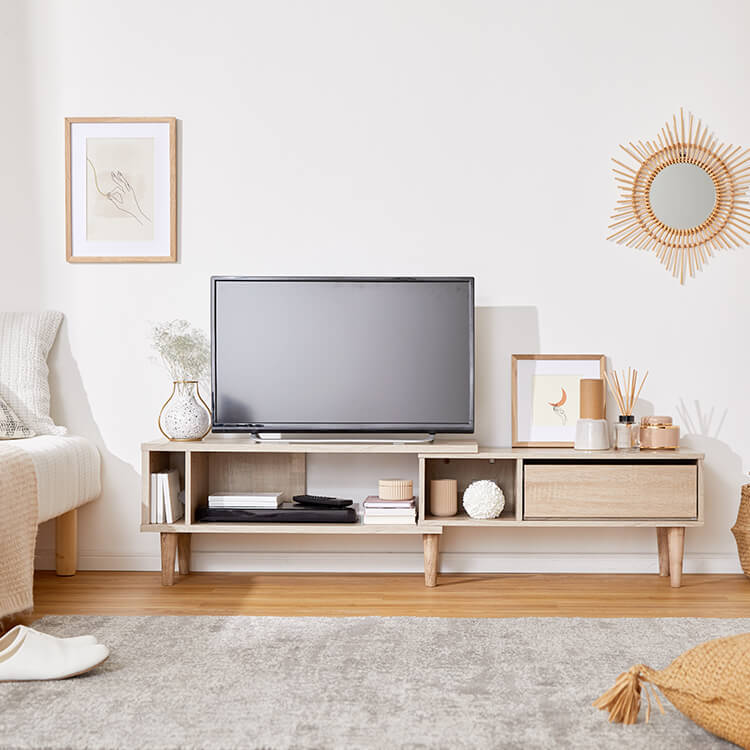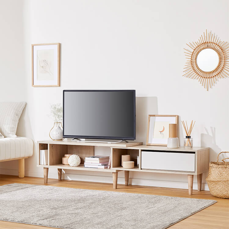 横幅の伸縮と、角度の調整ができる、自由自在なテレビ台。アクセントとして前扉のカラーをお好みで変更でき、自分だけのおしゃれな家具に仕上げることができます。場所を取らない奥行と伸縮・変形機能で、 一人暮らしやワンルームにもおすすめ。 ぴったりのサイズ感でお使いください。このロータイプのテレビ台は伸縮が可能。引っ越しや模様替えで幅を変えたくなった時にも、自在にサイズを変えられます。角度も自在に変えられるので、コーナーテレビ台としても活躍。ノートパソコンを置いて、ローデスクとしてもお使いいただけます。