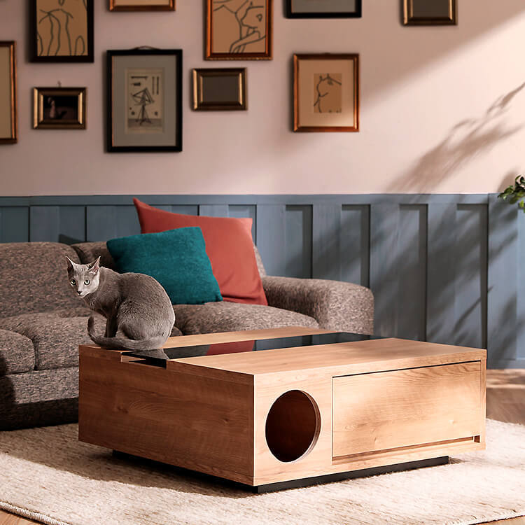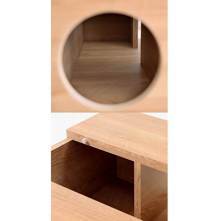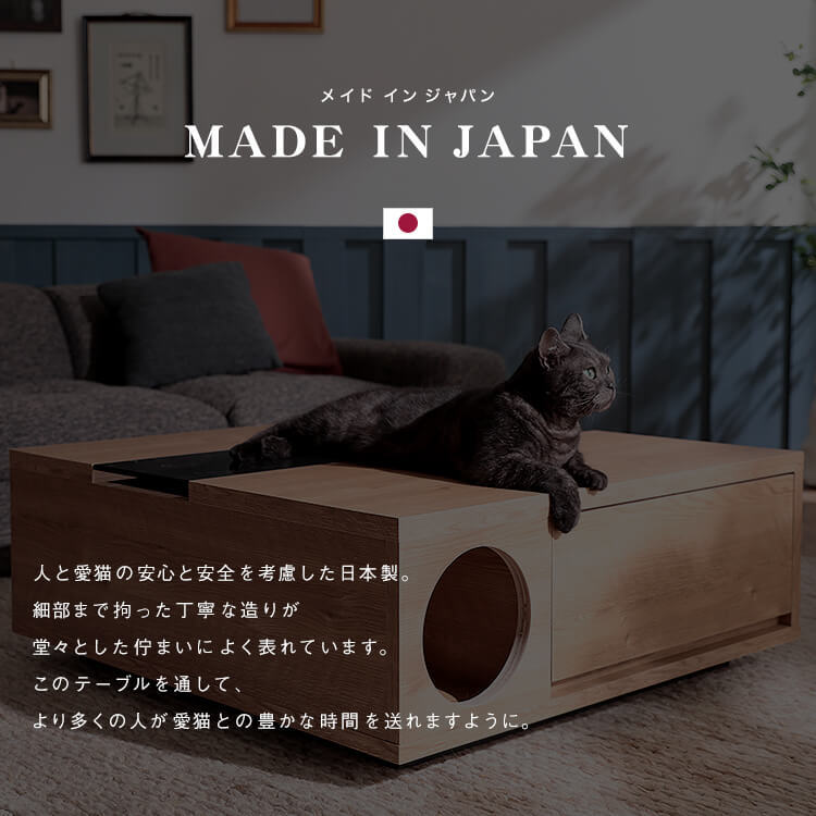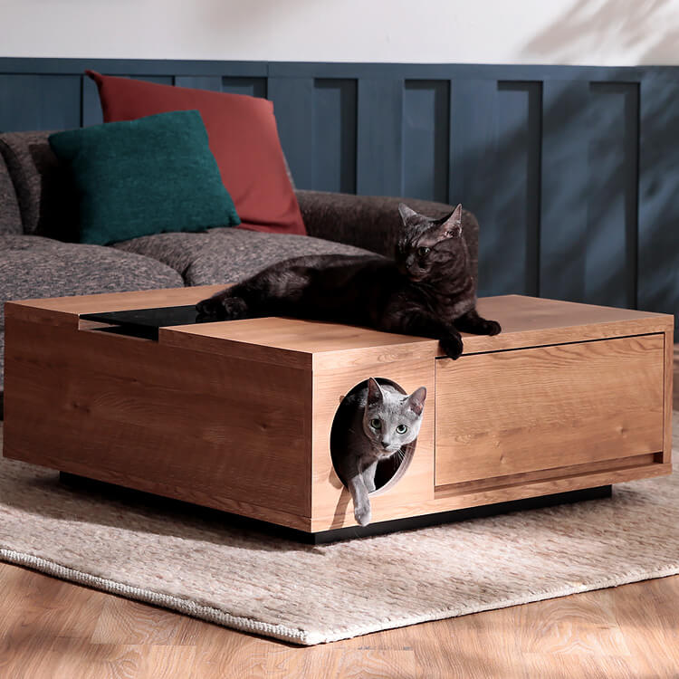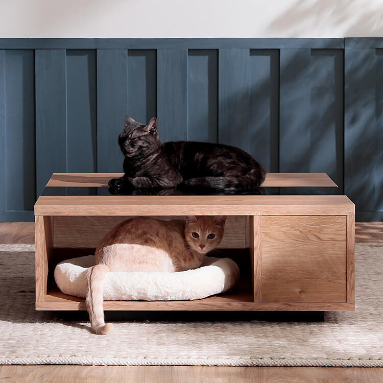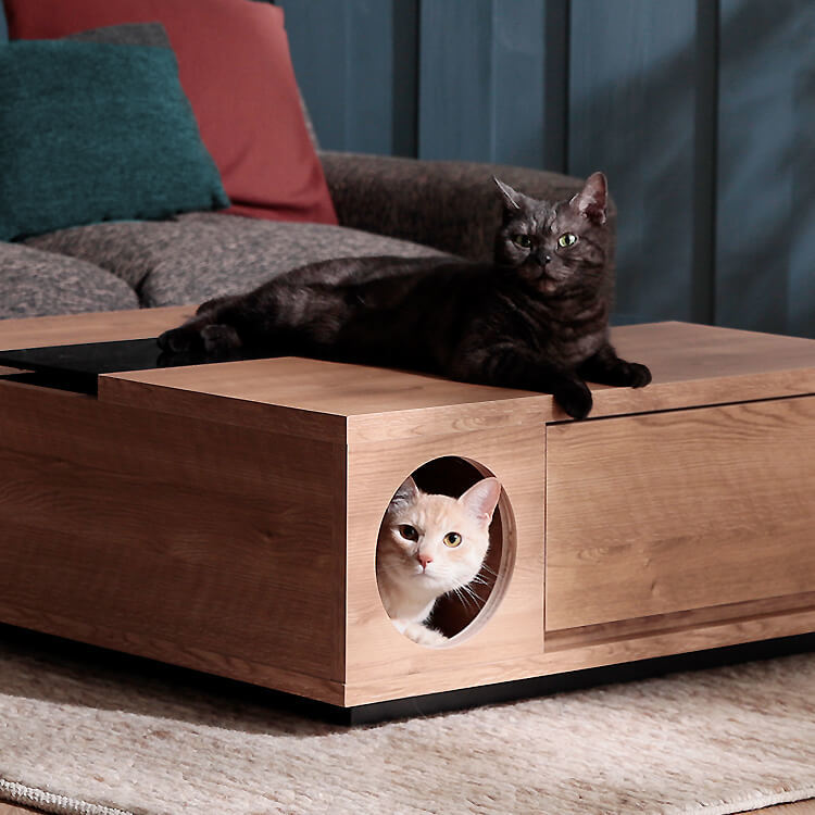 「愛猫との生活と、インテリアにこだわること。どちらも心地よく成立させることはできないだろうか。」その考えが、このプロダクトを誕生させるきっかけになりました。洗練されたリビングへ導くようなデザインを基調に。狭く薄暗い場所を好む猫の習性をヒントにひみつの地下通路のような、隠れ家のような…猫心くすぐる要素を取り入れてこのセンターテーブルが完成しました。・small room・entrance&exit・drawer