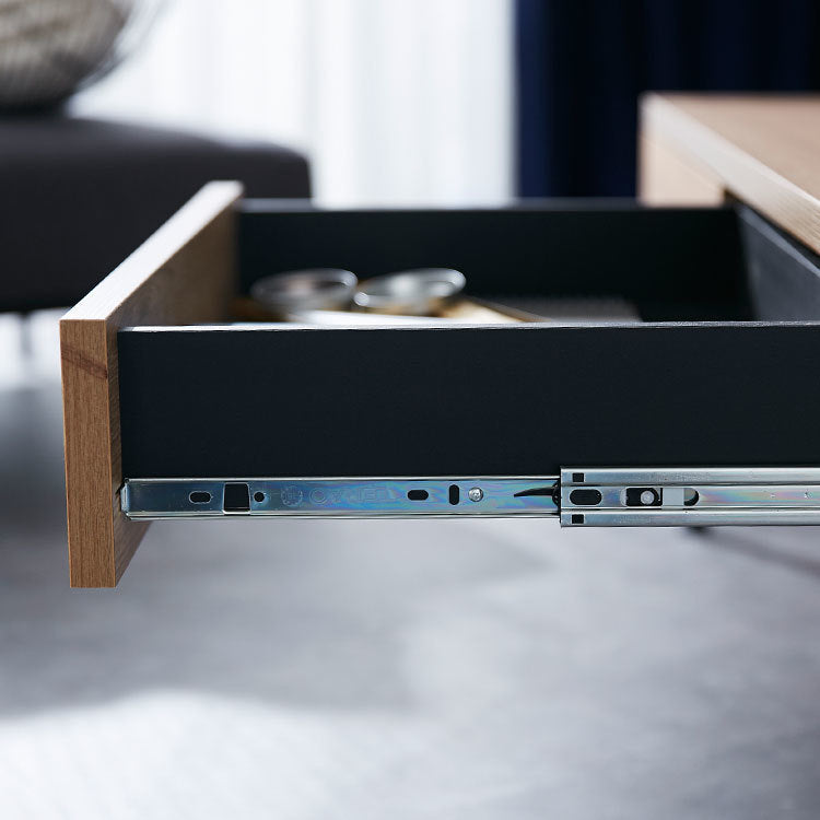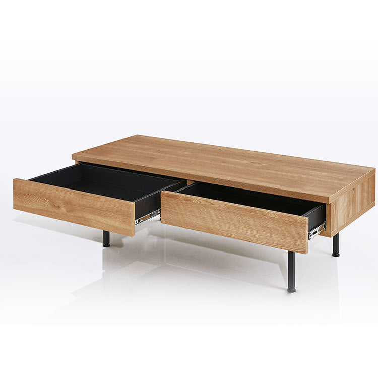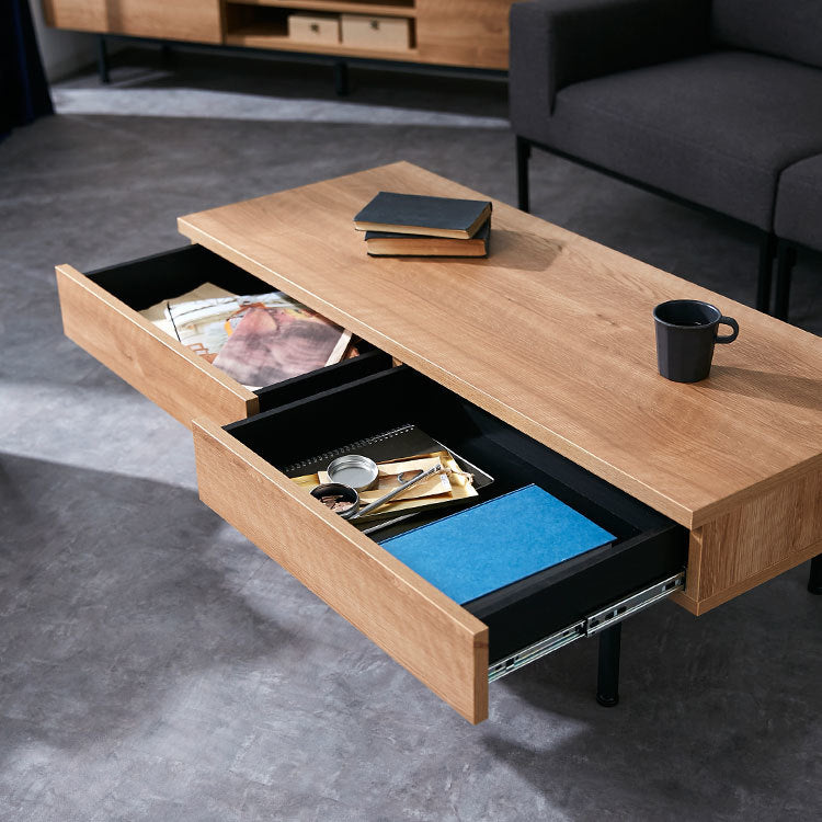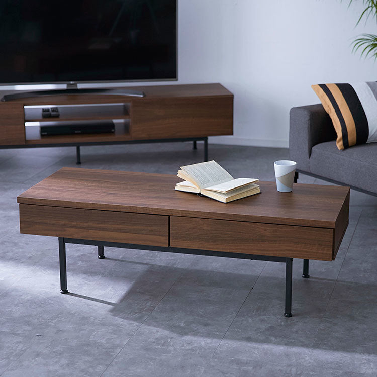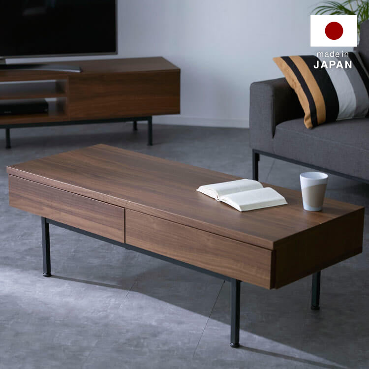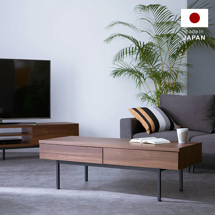 木目調 国産センターテーブル 【幅119.3cm】熟練の家具職人が一つ一つ丁寧に真心こめて作り上げました。安価な輸入品とは違い、日本製ならではの匠のプライドと情熱を詰め込んだ完成度の髙い一品です。このテーブルに使われているのは、本物の木のような木目を持つ強化プリント紙。本物の木にみられる養分や水を吸い上げる導管をイメージした、流れるような木目です。【シャビーナチュラル】時を経たような落ち着いた色合いです。【ブラウン】ローストしたコーヒーのような深い色合いと艶を楽しめます。スッキリと洗練されたリビングに見えるポイントは、取っ手の無いフラットデザインにあります。美しい木目柄を遮る取っ手を付けず、引き出しの下に溝をつけることでスタイルを選ばないシンプルなカタチに。インテリア性の高い美しいテーブルに仕上がりました。