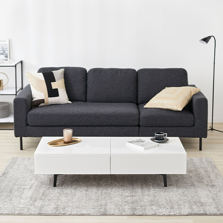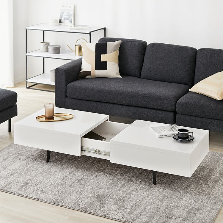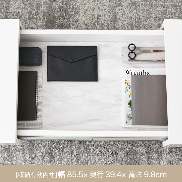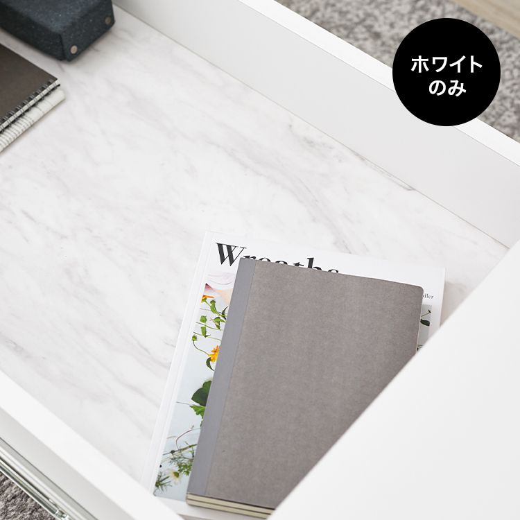 一見シンプルでありながら、独自の仕掛けがあるデザイナーズテーブル。美しいデザインと実用性を両立したテーブルが、お部屋をシンプルモダンな空間へと導きます。閉じればテーブル、開けば収納の、1台2役の省スペースなスマートデザイン。シンプルな佇まいが生活感を綺麗にカバーし、すっきりと片付いた美しいお部屋をつくります。清潔感溢れるホワイトのボディ×天板を開くと広がるシックなストーン調。木のあたたかみを感じる全面シャビ―ナチュラル。置くだけでお部屋に女性らしさが広がる、スタイリッシュなデザインです。閉めた状態の天板の広さは120×50cmと広々とした設計に。ゆとりを持って様々な物を置くことができます。