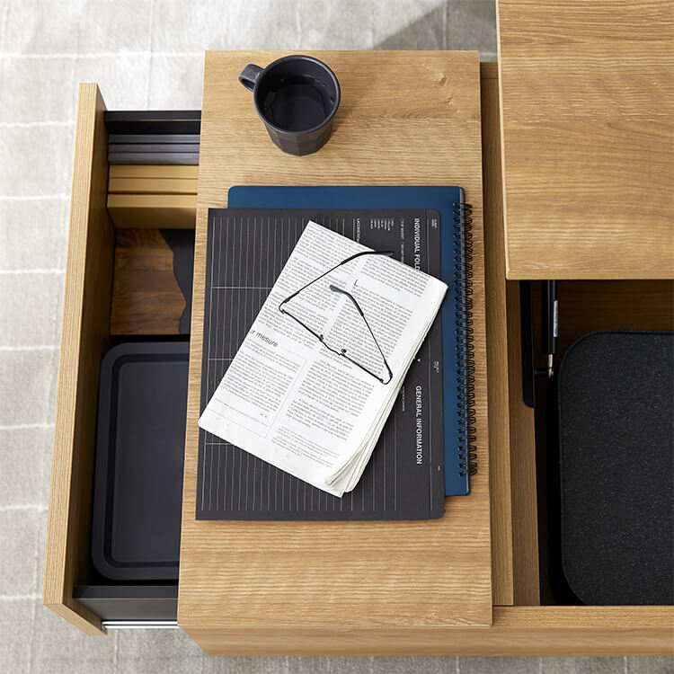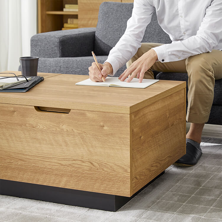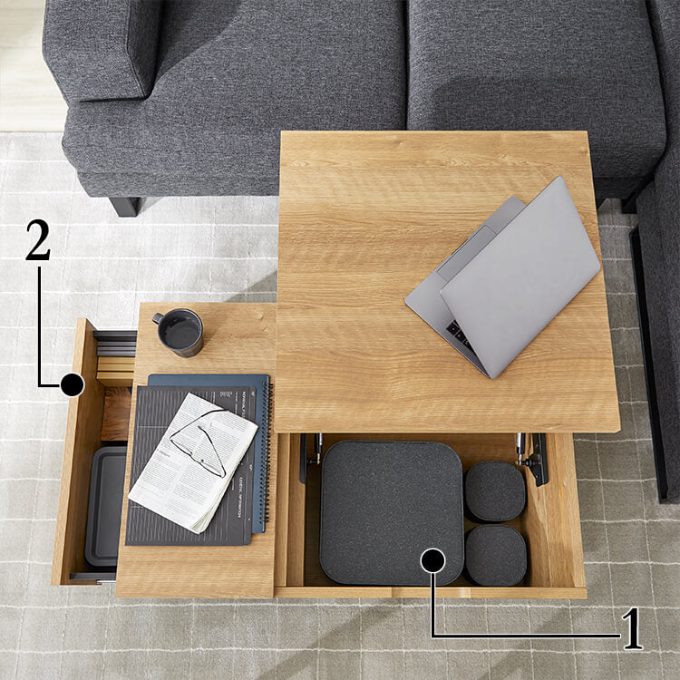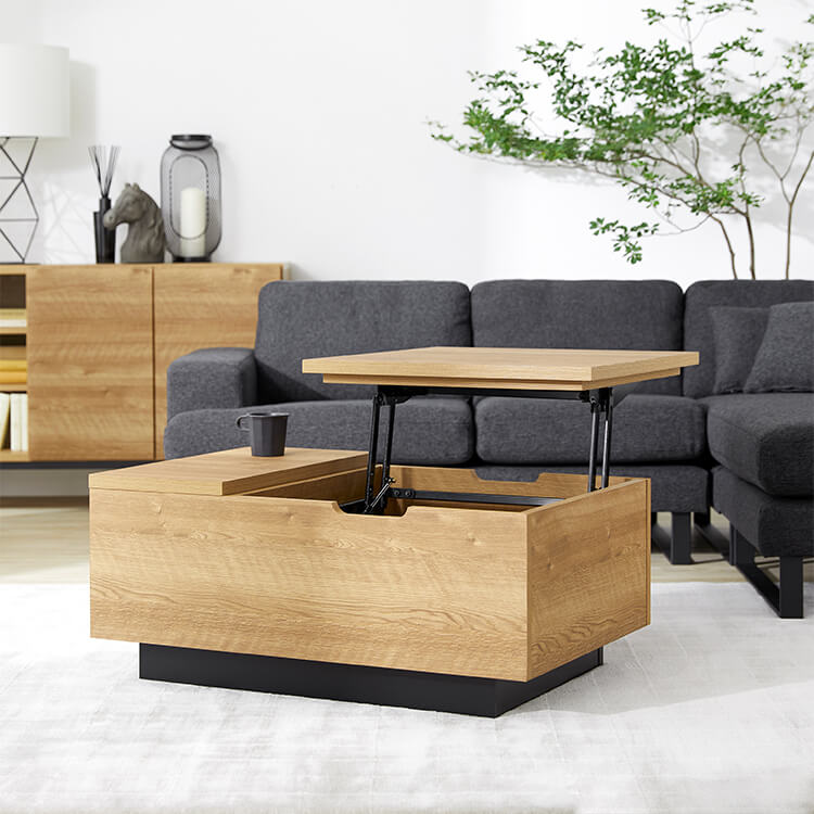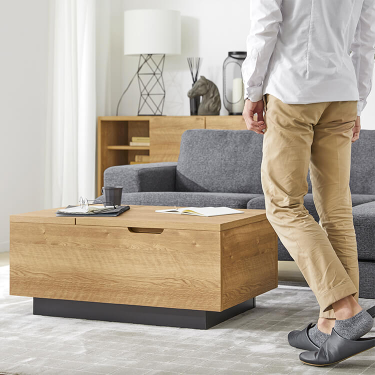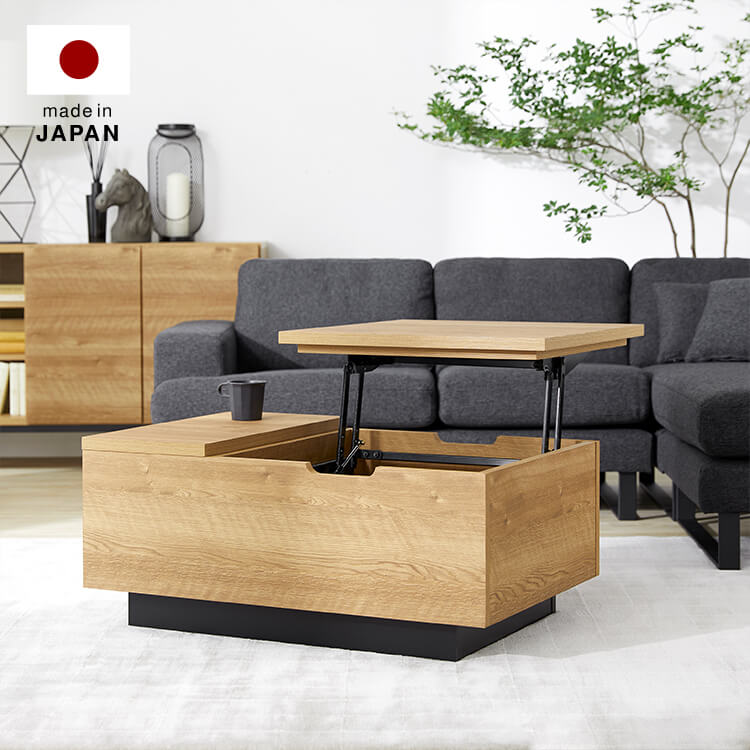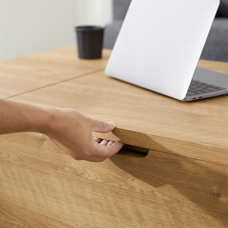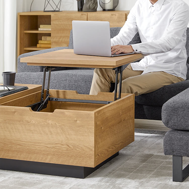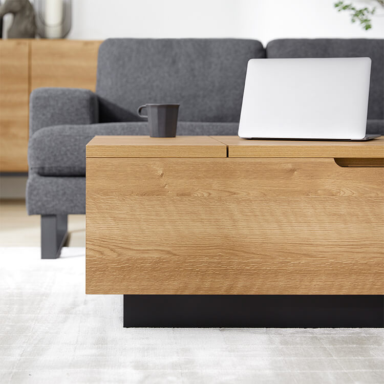 ソファに座ったまま作業ができる可動式の天板と2か所の収納スペース。使いやすさと美しさを合わせ持った国産リフティングテーブルです。無駄を省いたシンプルデザインで圧迫感を軽減。収納も兼ね備ているから、スペースの限られた一人暮らしの部屋にもおすすめです。取っ手のない直線で構成されたデザイン。どの角度から見てもスッキリとした美しいフォルムが引き立ちます。フラットデザインの中にこっそりと詰まった昇降式のテーブルと、2か所の隠し収納。ソファや床でも、様々な生活・作業パターンに合わせることが可能な機能性が特徴です。