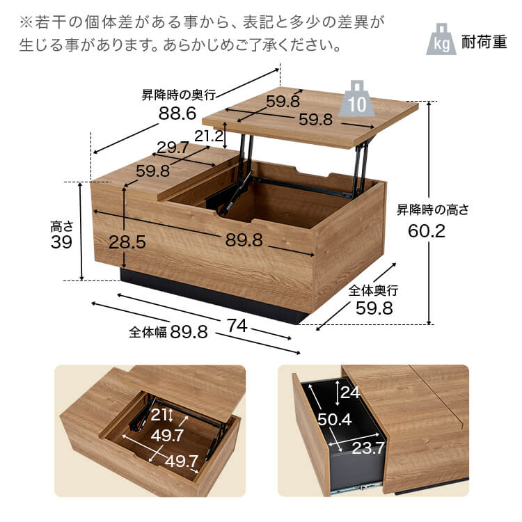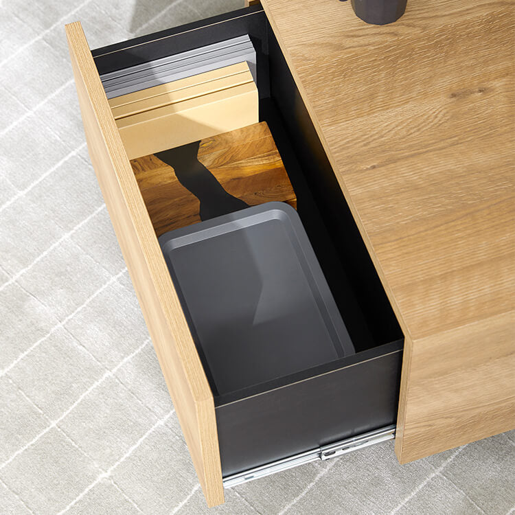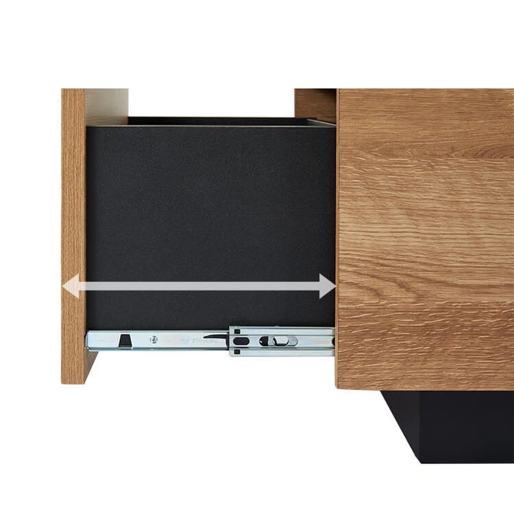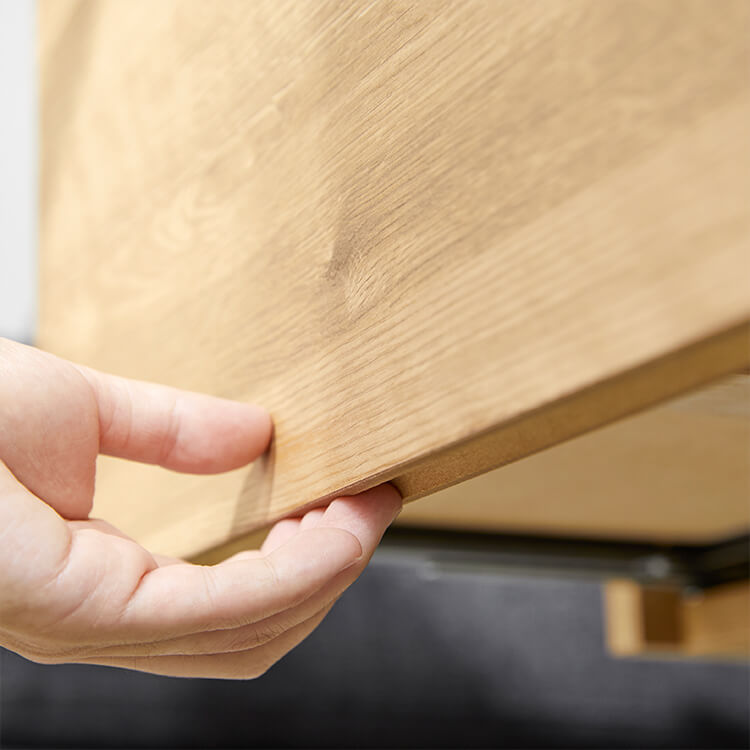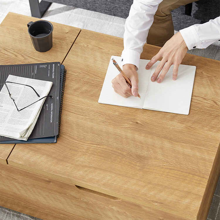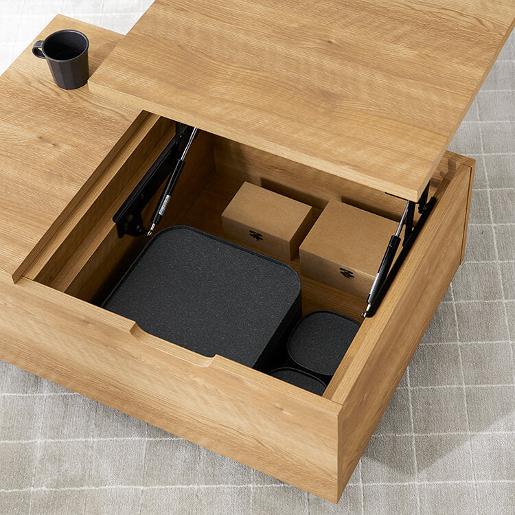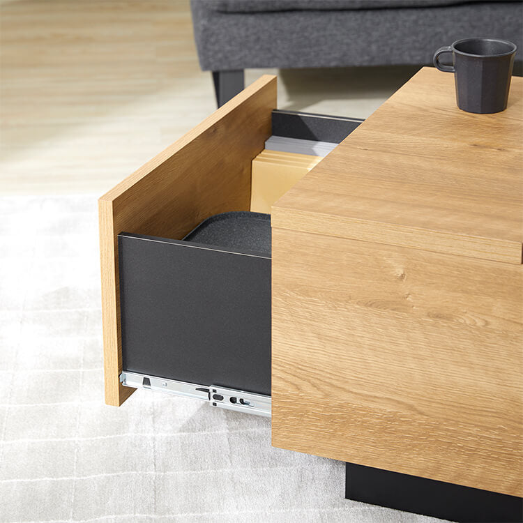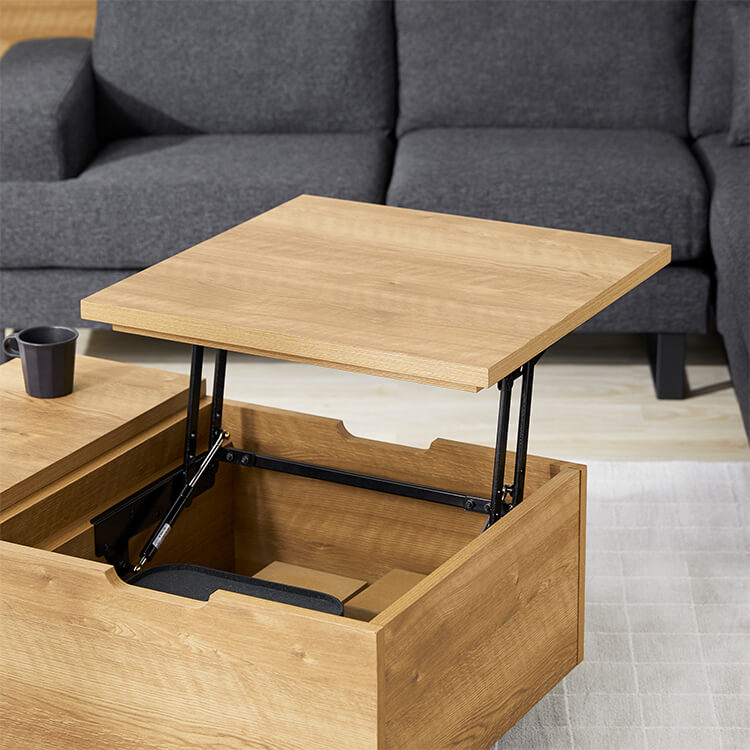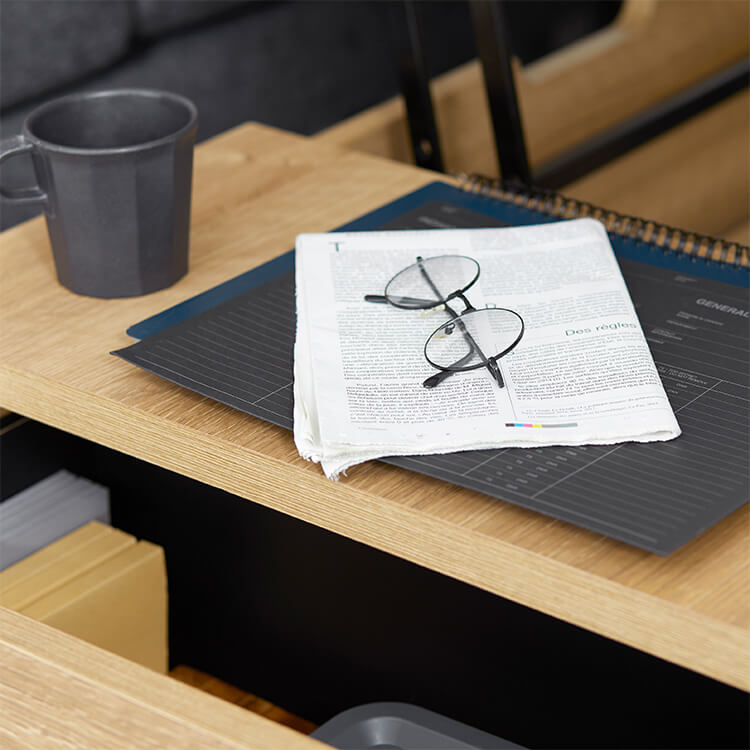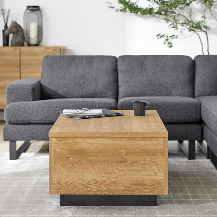 ソファに座ったまま作業ができる可動式の天板と2か所の収納スペース。使いやすさと美しさを合わせ持った国産リフティングテーブルです。無駄を省いたシンプルデザインで圧迫感を軽減。収納も兼ね備ているから、スペースの限られた一人暮らしの部屋にもおすすめです。取っ手のない直線で構成されたデザイン。どの角度から見てもスッキリとした美しいフォルムが引き立ちます。フラットデザインの中にこっそりと詰まった昇降式のテーブルと、2か所の隠し収納。ソファや床でも、様々な生活・作業パターンに合わせることが可能な機能性が特徴です。