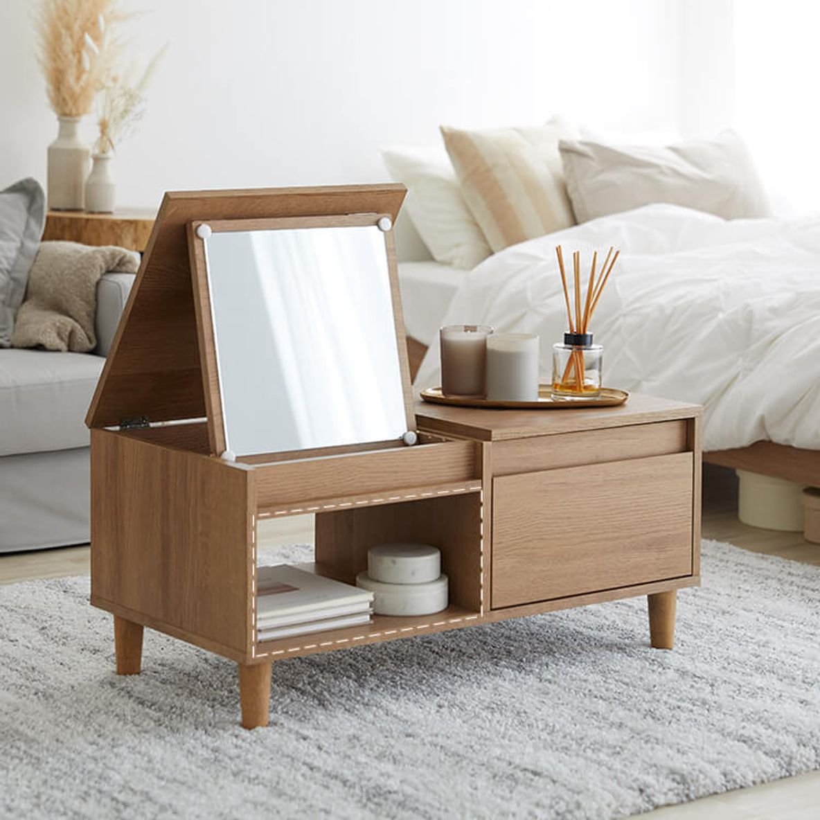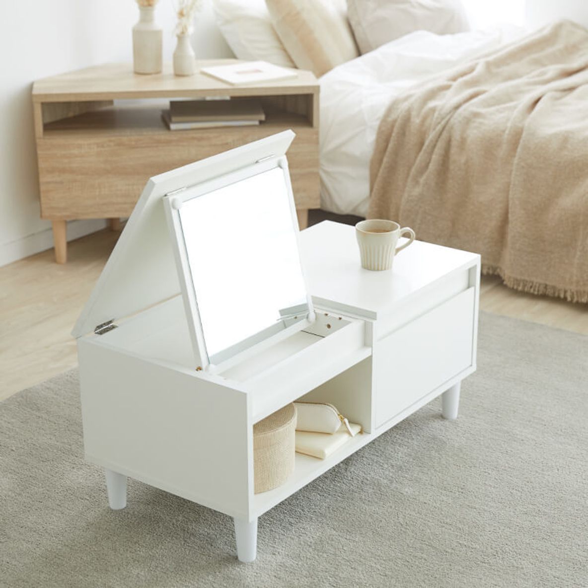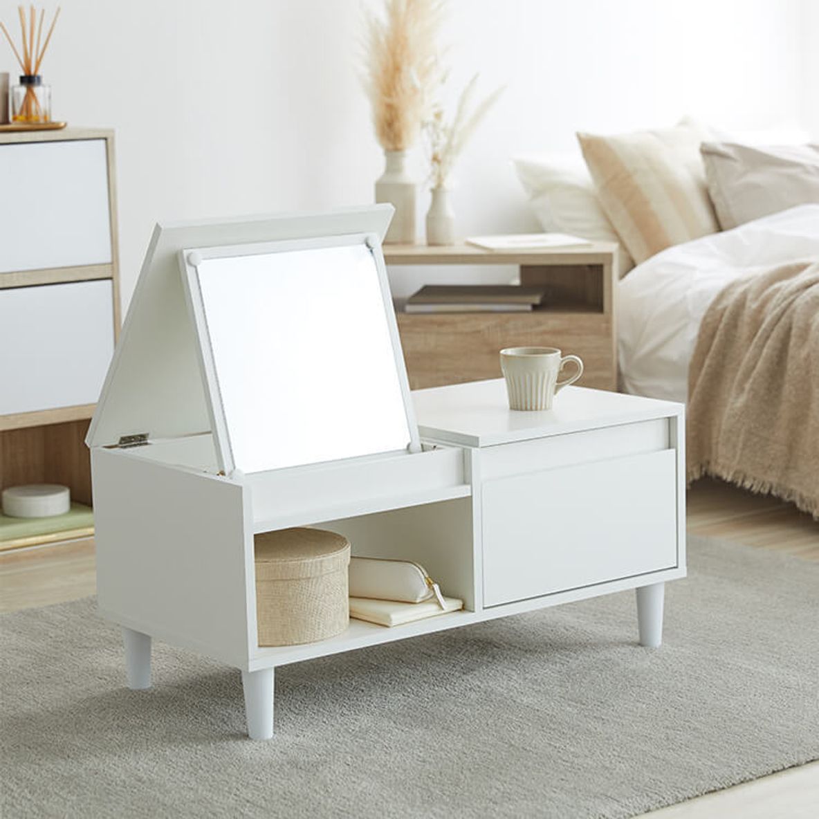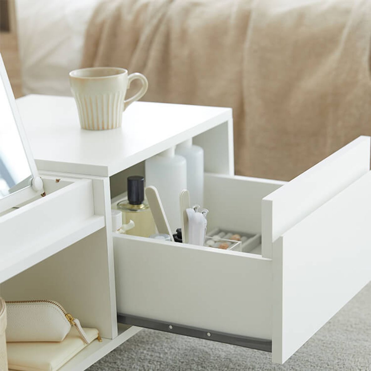 ワンルームのような狭いお部屋にドレッサーとテーブルの両方を置くのは難しい…。でも、出来る事なら両方欲しい…。その両方を叶えてくれる女子の強い味方ができました!ご飯や作業するときはおしゃれなテーブルに、メイクをするときはドレッサーに大変身!一般的によく見かけるようなテーブルにただ鏡が付いただけのテーブルドレッサーと違い、「本当にメイクのしやすいカタチ」を追求して開発しました。天板を開くと鏡が現れドレッサーに。テーブルドレッサーは、その場で直ぐにメイクができるのも魅力のひとつです。