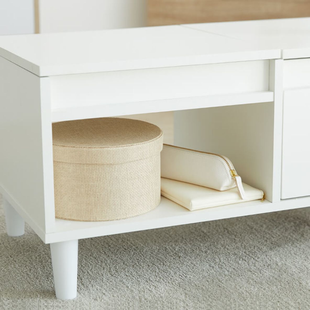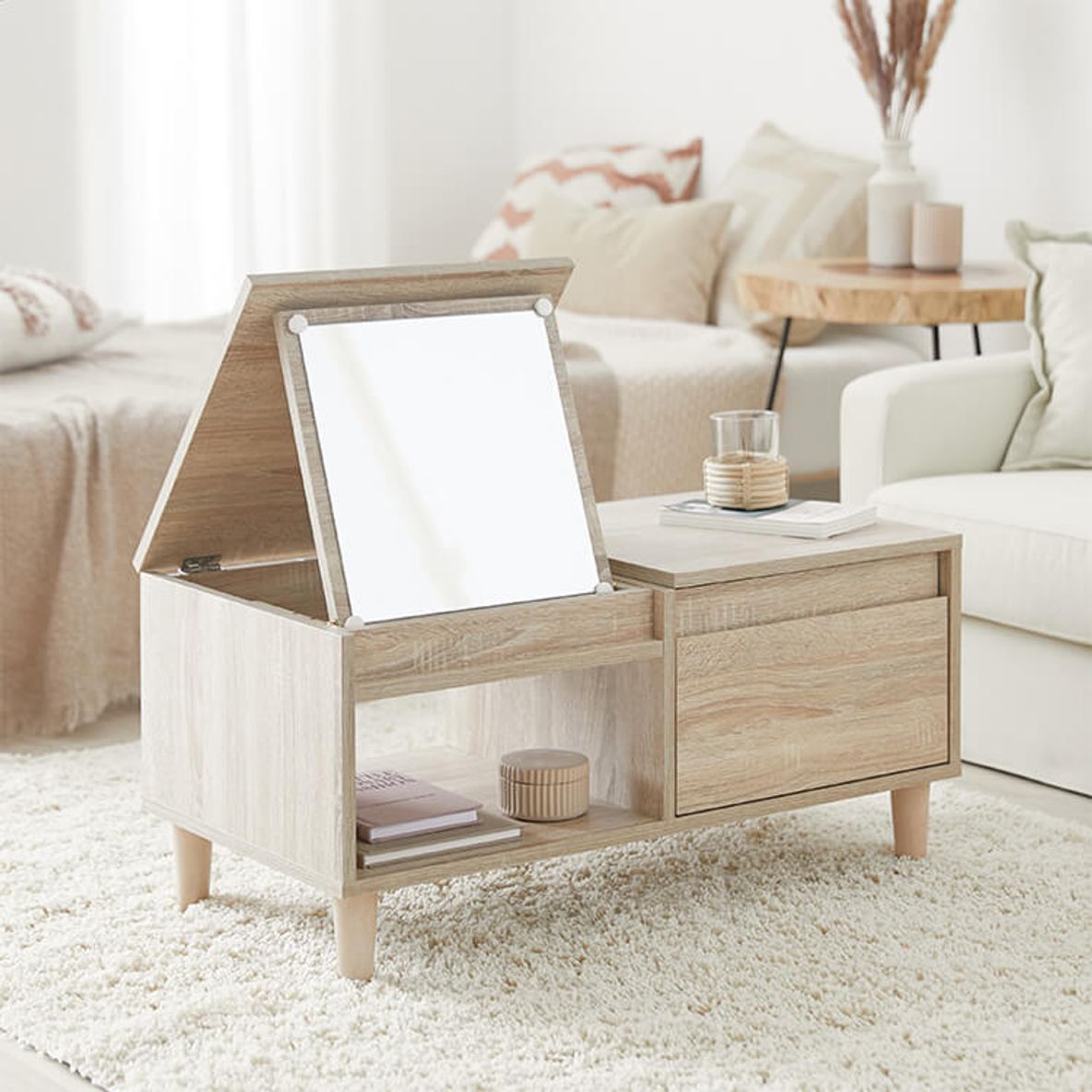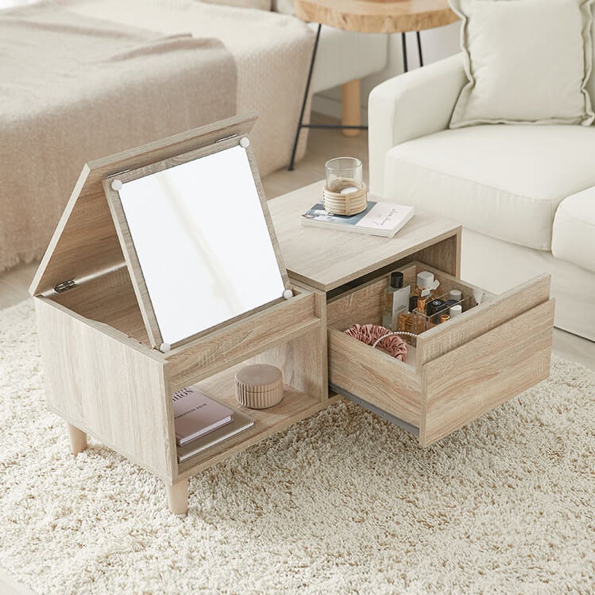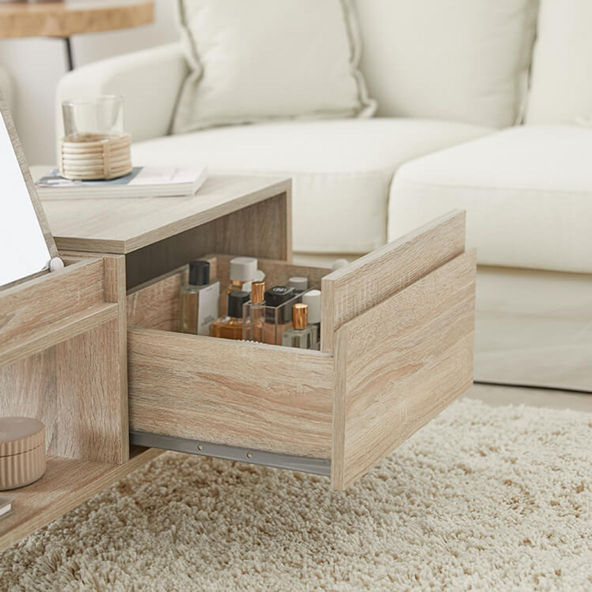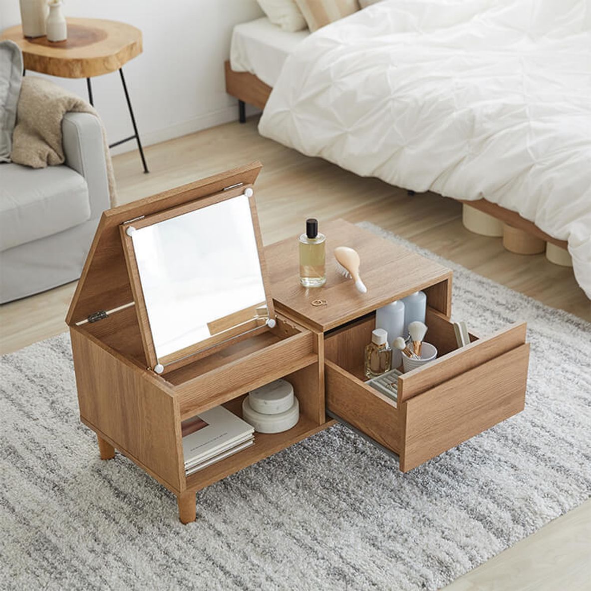 ワンルームのような狭いお部屋にドレッサーとテーブルの両方を置くのは難しい…。でも、出来る事なら両方欲しい…。その両方を叶えてくれる女子の強い味方ができました!ご飯や作業するときはおしゃれなテーブルに、メイクをするときはドレッサーに大変身!一般的によく見かけるようなテーブルにただ鏡が付いただけのテーブルドレッサーと違い、「本当にメイクのしやすいカタチ」を追求して開発しました。天板を開くと鏡が現れドレッサーに。テーブルドレッサーは、その場で直ぐにメイクができるのも魅力のひとつです。