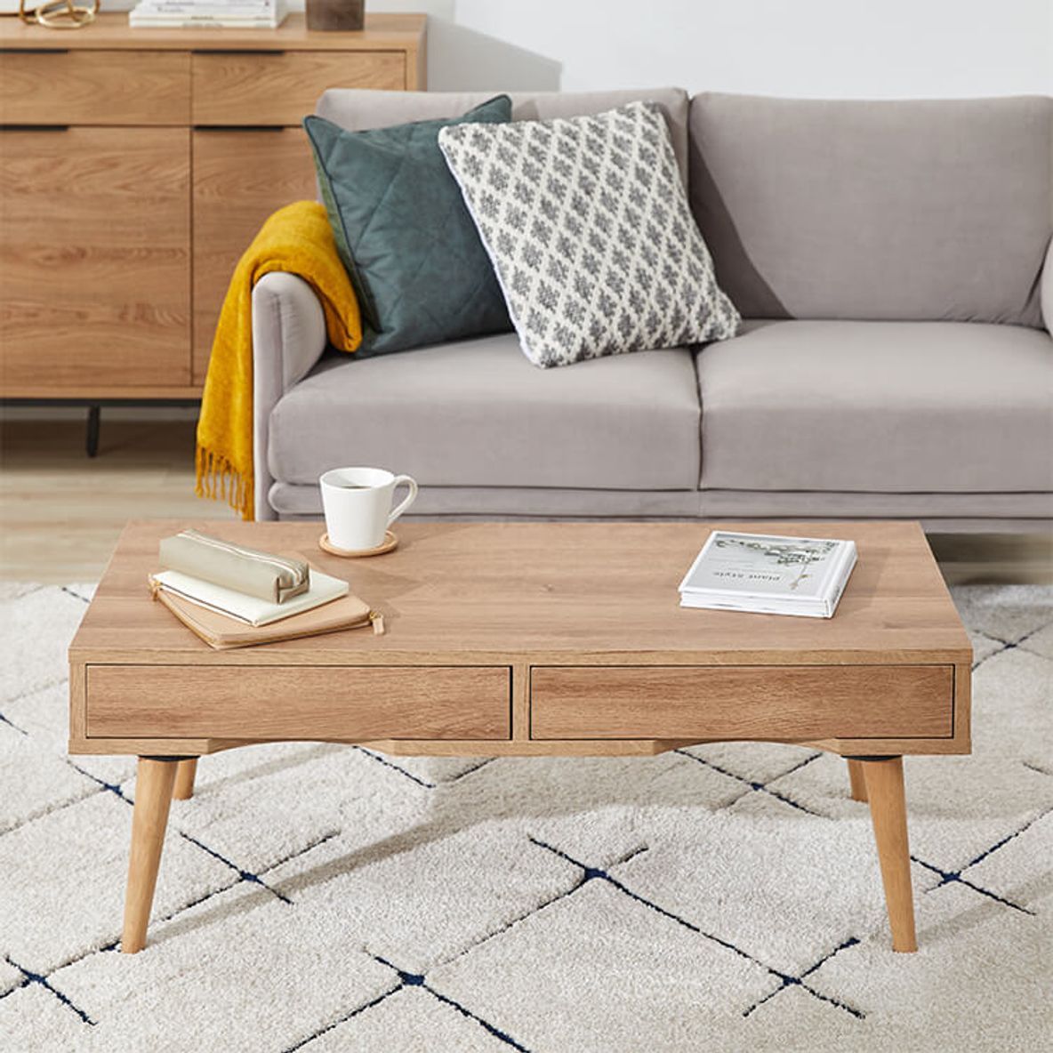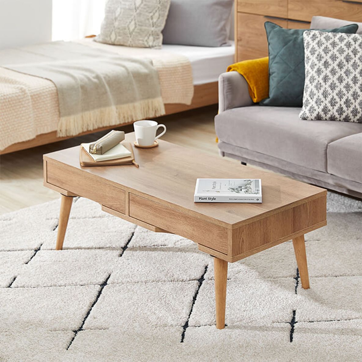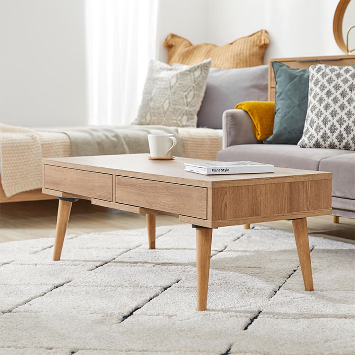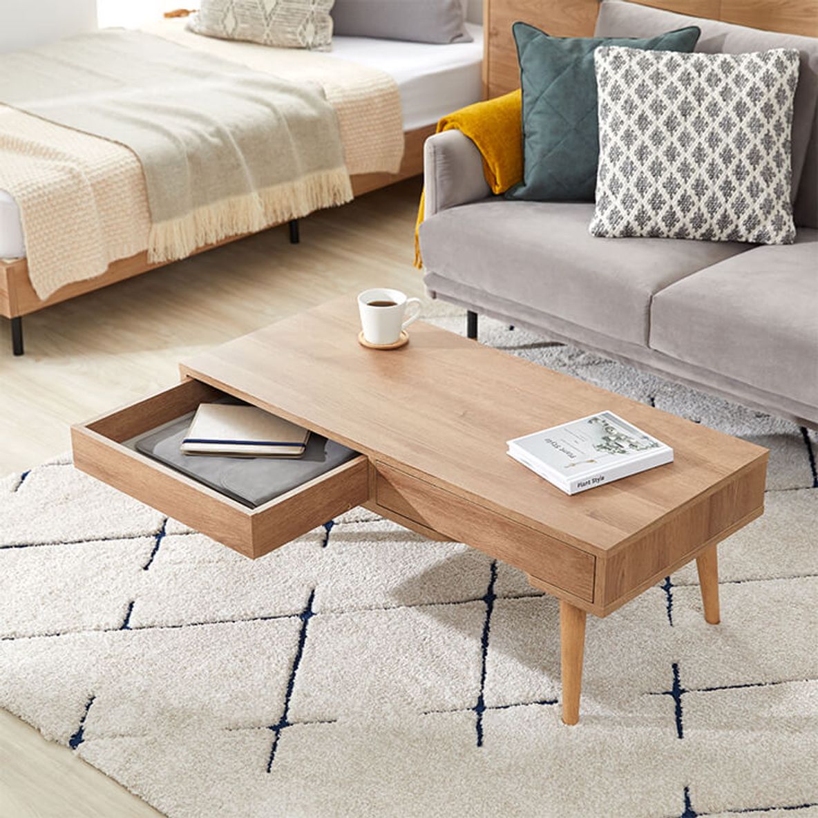 お部屋に馴染むシンプルなデザインが魅力のセンターテーブル。前後両方から引き出せる引き出し付きで、卓上をいつでもスッキリと魅せることができます。コンパクトなサイズ感の天板は、お料理を載せても小さすぎない十分な広さ。デスクワークもしやすく、テーブルであまり場所を取りたくない方にはおすすめのサイズです。しっかりとした脚の長さがあるので、テーブルの下に足を伸ばすことも可能。床座りでもソファと合わせても使いやすい、ゆとりある高さに設計しました。ゆったりとした収納スペースを確保した2杯の引き出し。そのまま置くとホコリが気になるノートパソコンも余裕で収まります。 ※お手持ちのノートPCのサイズをご確認ください。