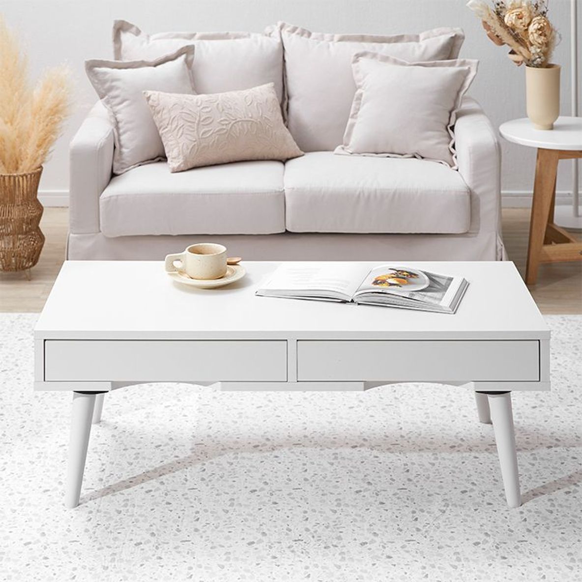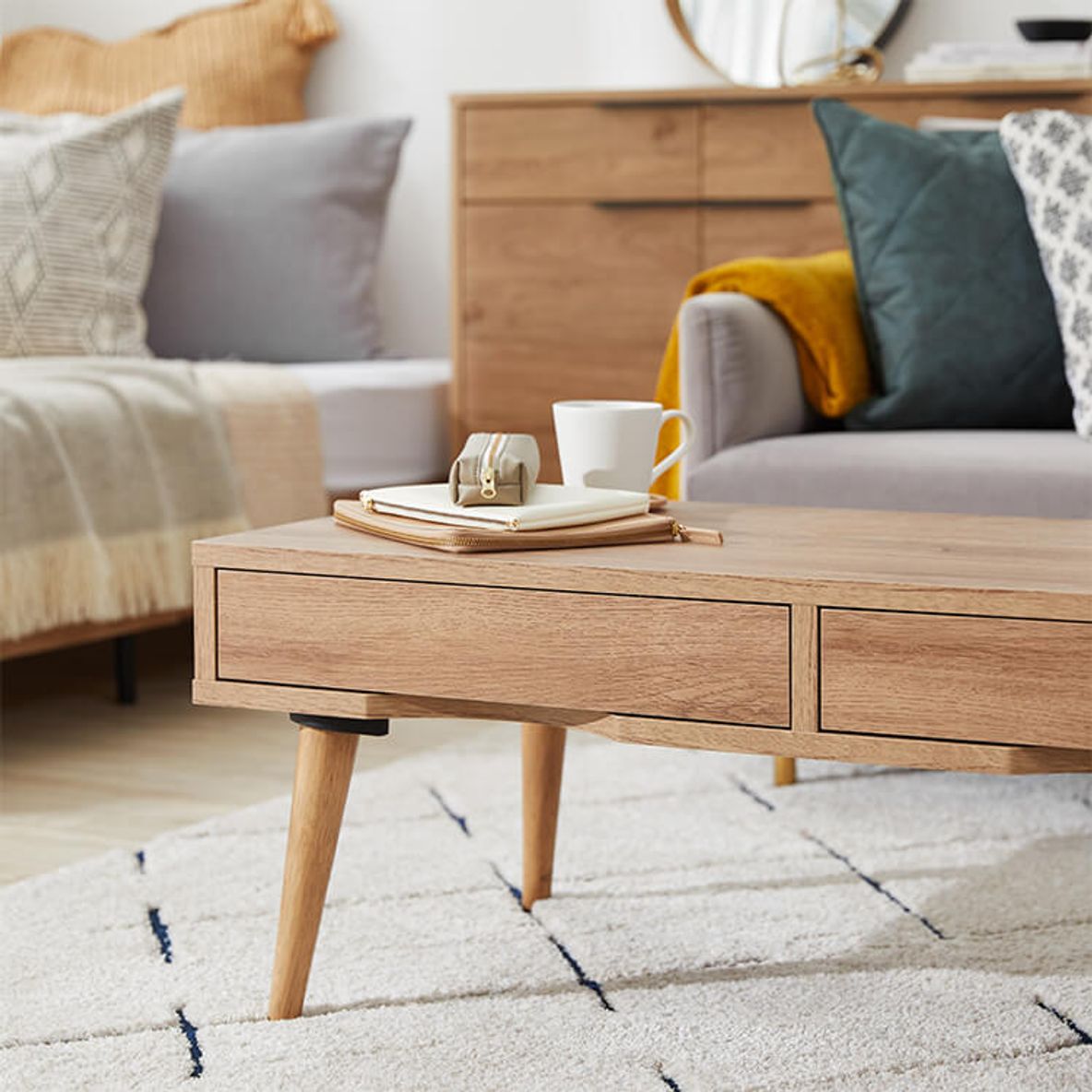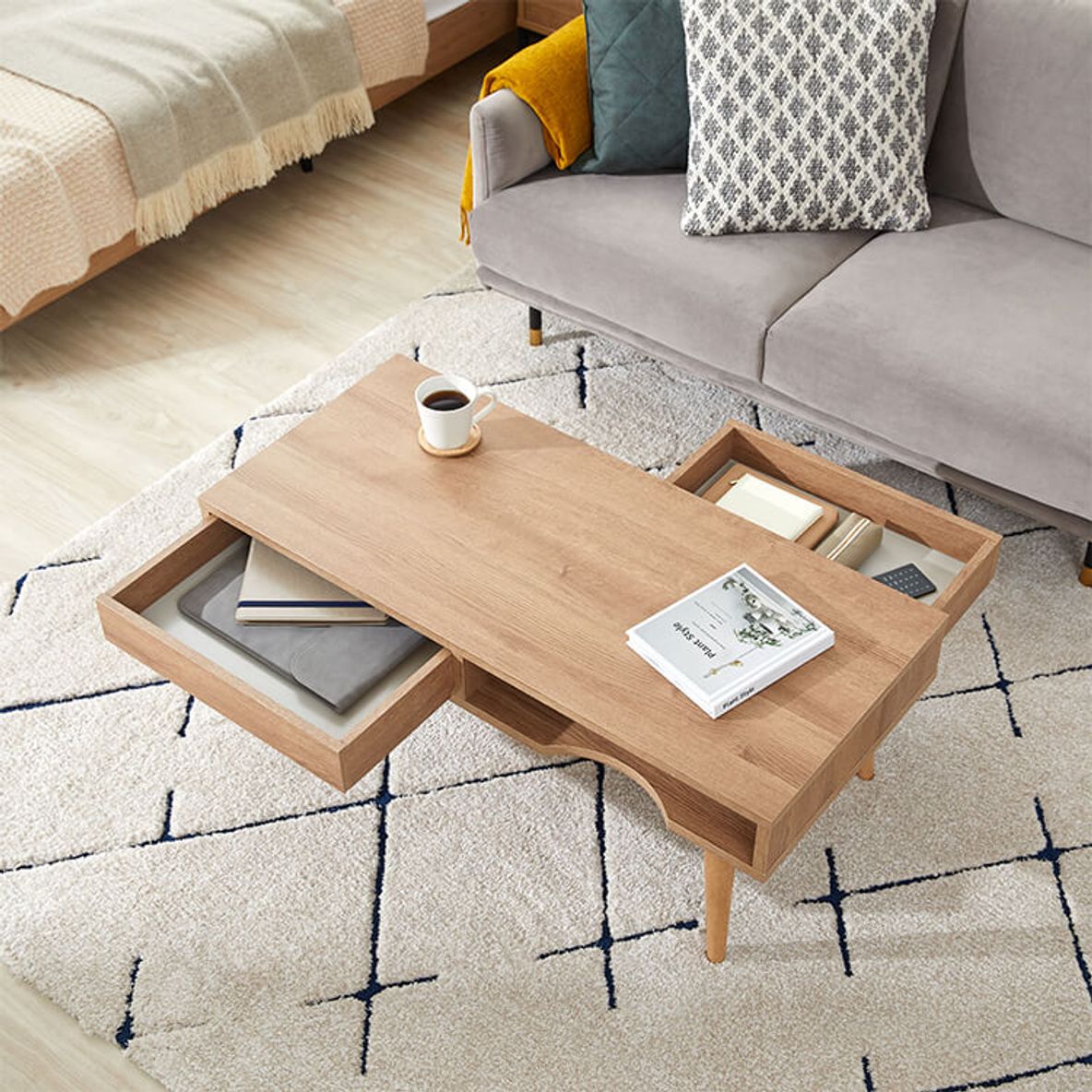 お部屋に馴染むシンプルなデザインが魅力のセンターテーブル。前後両方から引き出せる引き出し付きで、卓上をいつでもスッキリと魅せることができます。コンパクトなサイズ感の天板は、お料理を載せても小さすぎない十分な広さ。デスクワークもしやすく、テーブルであまり場所を取りたくない方にはおすすめのサイズです。しっかりとした脚の長さがあるので、テーブルの下に足を伸ばすことも可能。床座りでもソファと合わせても使いやすい、ゆとりある高さに設計しました。ゆったりとした収納スペースを確保した2杯の引き出し。そのまま置くとホコリが気になるノートパソコンも余裕で収まります。 ※お手持ちのノートPCのサイズをご確認ください。