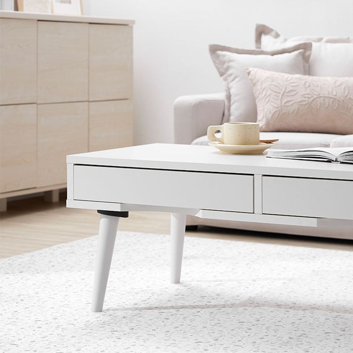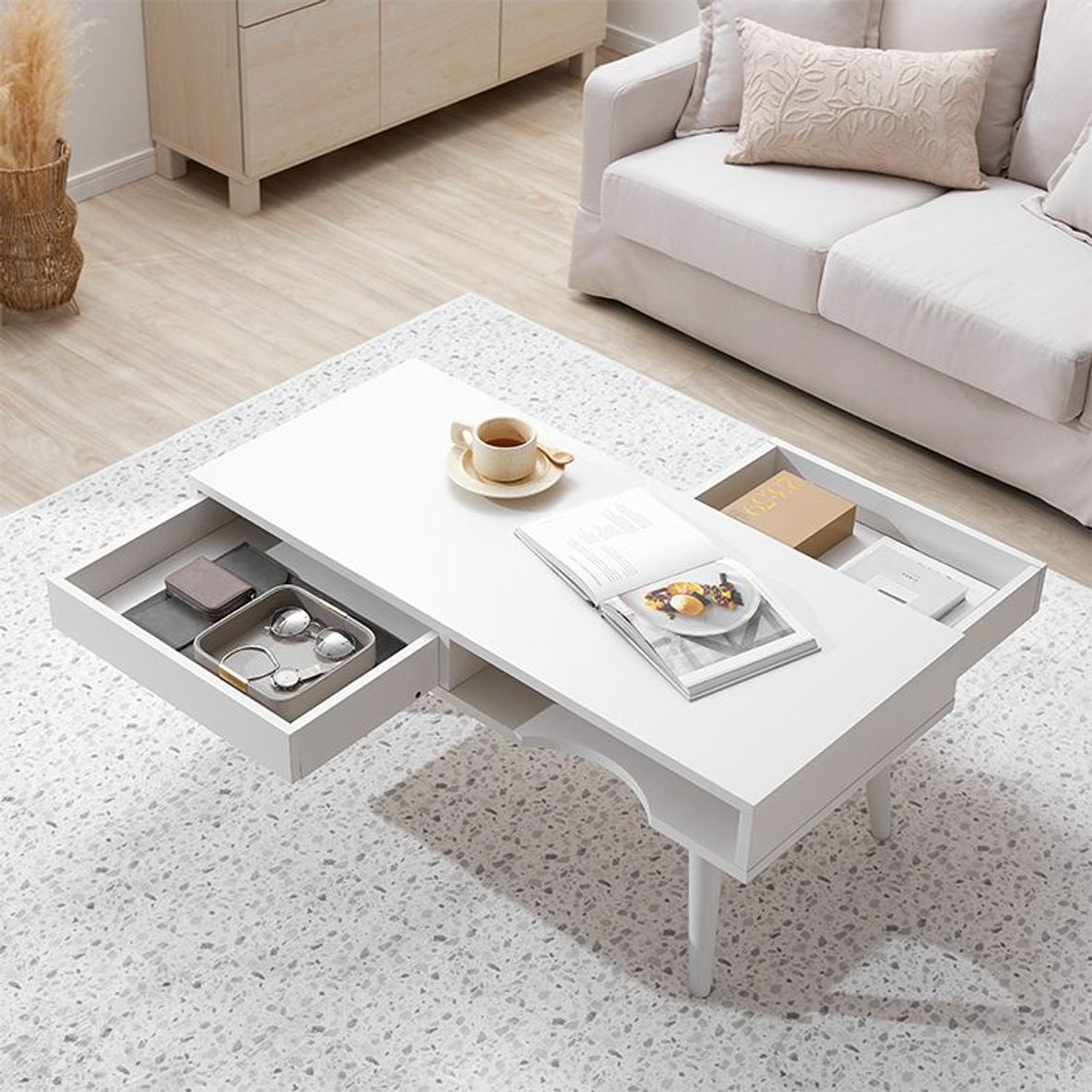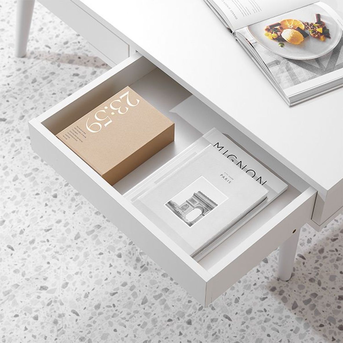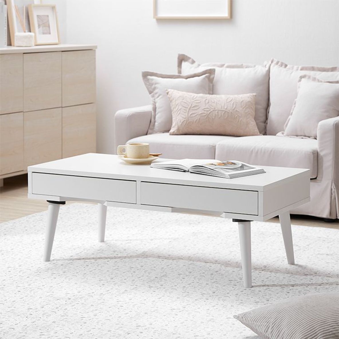 お部屋に馴染むシンプルなデザインが魅力のセンターテーブル。前後両方から引き出せる引き出し付きで、卓上をいつでもスッキリと魅せることができます。コンパクトなサイズ感の天板は、お料理を載せても小さすぎない十分な広さ。デスクワークもしやすく、テーブルであまり場所を取りたくない方にはおすすめのサイズです。しっかりとした脚の長さがあるので、テーブルの下に足を伸ばすことも可能。床座りでもソファと合わせても使いやすい、ゆとりある高さに設計しました。ゆったりとした収納スペースを確保した2杯の引き出し。そのまま置くとホコリが気になるノートパソコンも余裕で収まります。 ※お手持ちのノートPCのサイズをご確認ください。