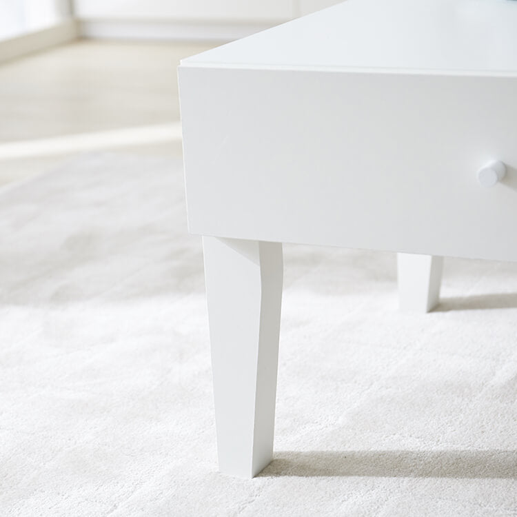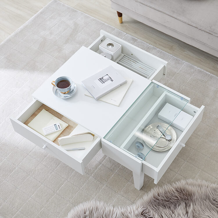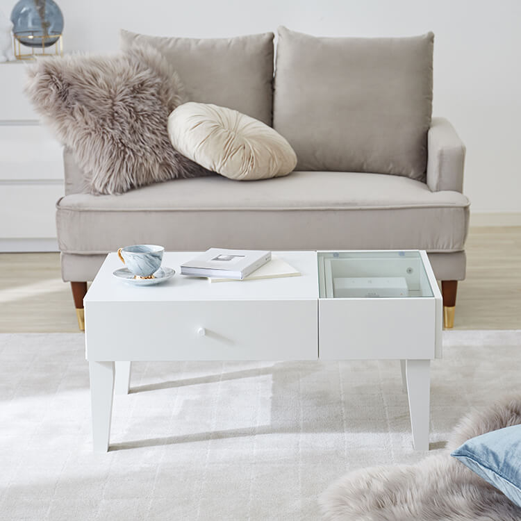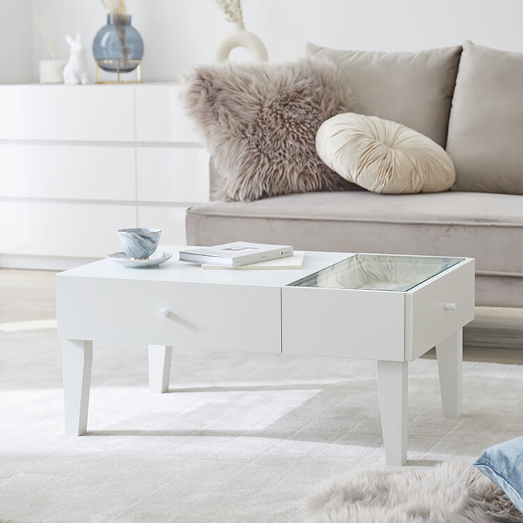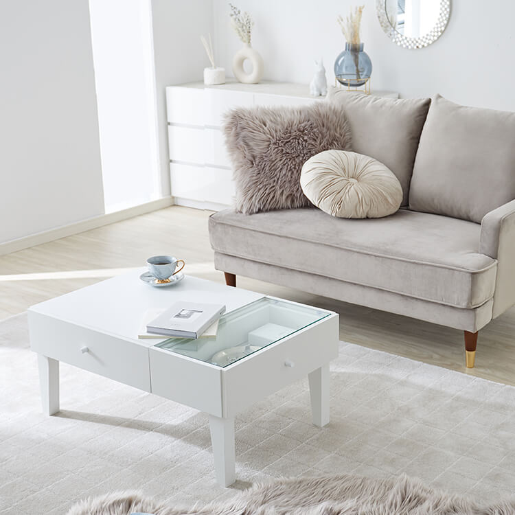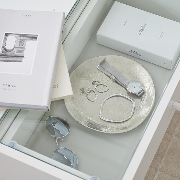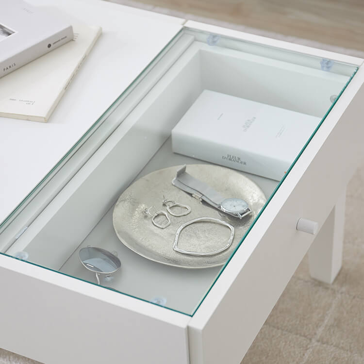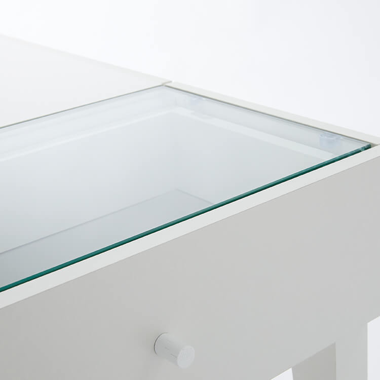 お好みで引き出しの底板のカラーチェンジが可能な魅せるテーブル。清潔感あるガラス天板のディスプレイでオシャレに見せながら、しっかりと収納も担う便利でオシャレなコンパクトテーブルです。3杯の引き出しの底板はそれぞれに違うカラーを採用。3杯とも同じサイズで、引き出しごと入れ替えが可能なので、ガラスから見せる部分を3色の好きな色に変えることができます。限られたスペースにも置きやすいコンパクトサイズ。ワンルームなど一人暮らしのお部屋でも圧迫感を与えにくくインテリアに馴染んでくれます。爽やかなホワイトは、落ち着いたマットな白。お部屋の清潔感を演出してくれるカラーです。