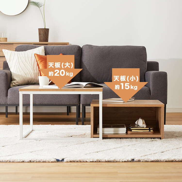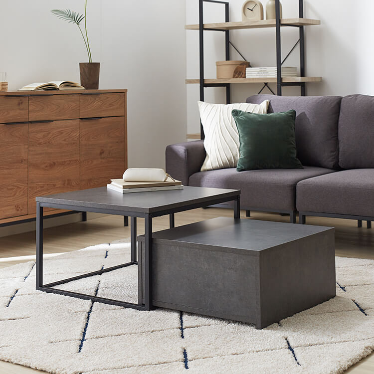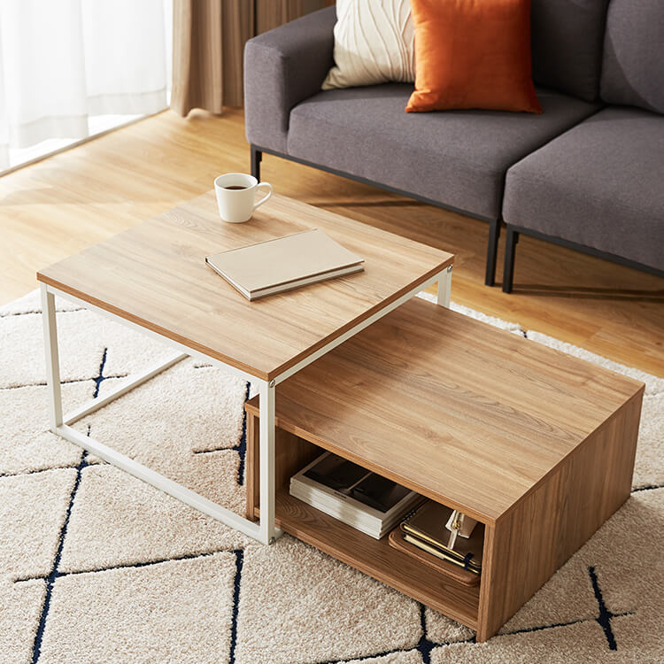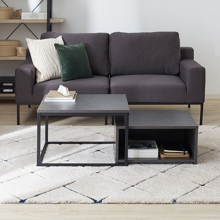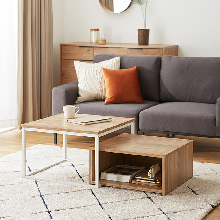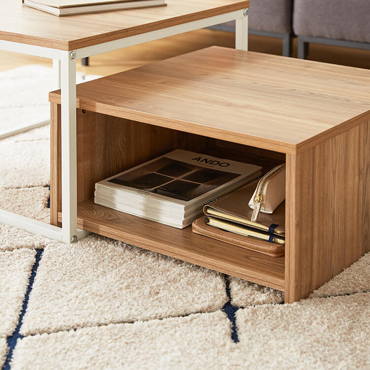 自由なスタイルが叶う機能性と、シンプルで美しいデザイン。両方を兼ね備えた収納付きのネストテーブルです。お部屋のアクセントになり、こなれた空間を演出します。あたたかみを感じる木目調のナチュラルと、スタイリッシュでモダンなダークグレー。お部屋に合わせて2カラーからお選びください。入れ子にすると、ワンルームや一人暮らしにピッタリな幅60cmのコンパクトサイズ。圧迫感を与えにくく省スペースに置けるので、リビング使いや寝室にもおすすめです。ネストテーブルとは、同じデザインのサイズが違うテーブルを「入れ子」のように組み合わせて収納できるテーブルのこと。用途に合わせてスペースを広くしたり、縮めたりと機能的で美しいデザインが魅力です。