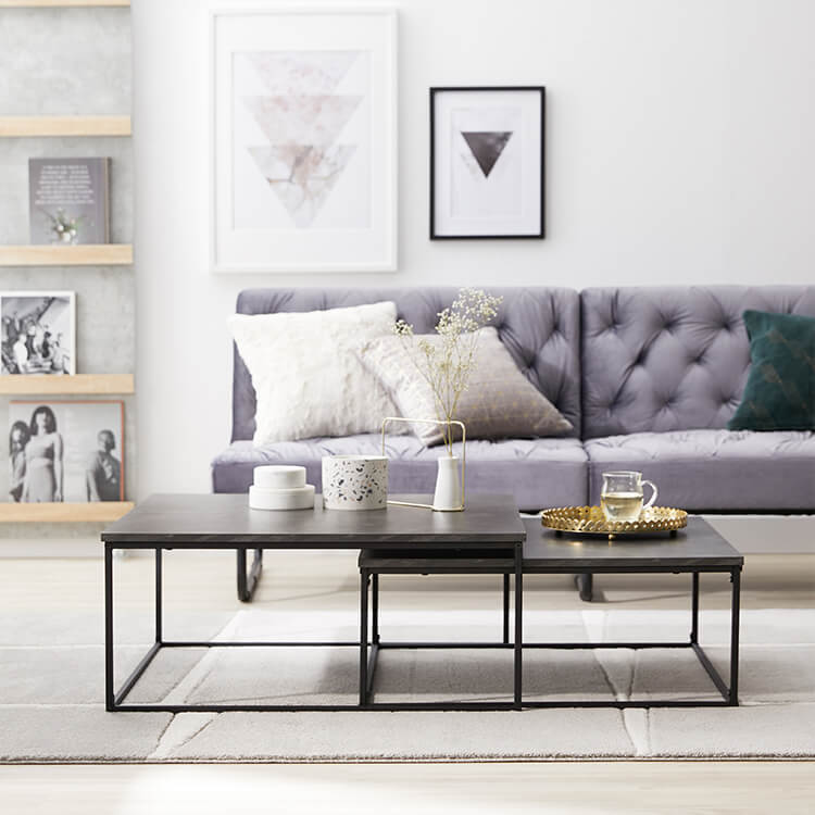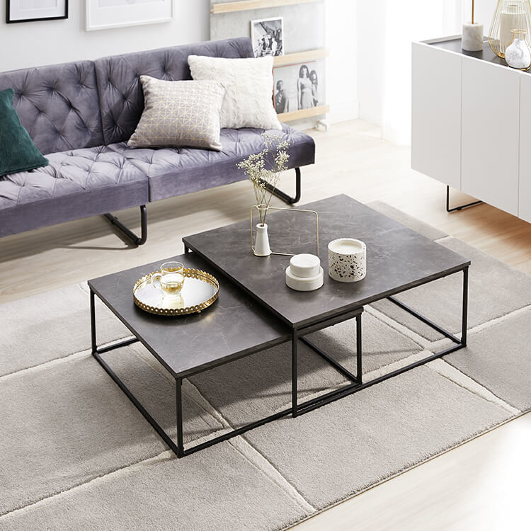 自由な使用スタイルが叶う機能性と、細身の脚にこだわったシンプルでいて美しいデザイン。両方を兼ね備えたネストテーブルが、インテリアをお洒落に引き立て、こなれた空間を演出します。憧れの海外風インテリアのような、大理石柄の天板と細いスチール脚を組み合わせたネストテーブル。シンプルで洗練されたデザインが、インテリアのアクセントとなり理想のお部屋へと導いてくれます。本物のようなリアルさと高級感があり、置いた物までお洒落に魅せる大理石柄の天板。ホワイト、ブラック、ダークグレーの3種類からお選びいただけます。ネストテーブルとは、同じデザインのサイズが違うテーブルを、「入れ子」のように組み合わせて収納できるテーブルのこと。機能的で美しいデザインが魅力です。