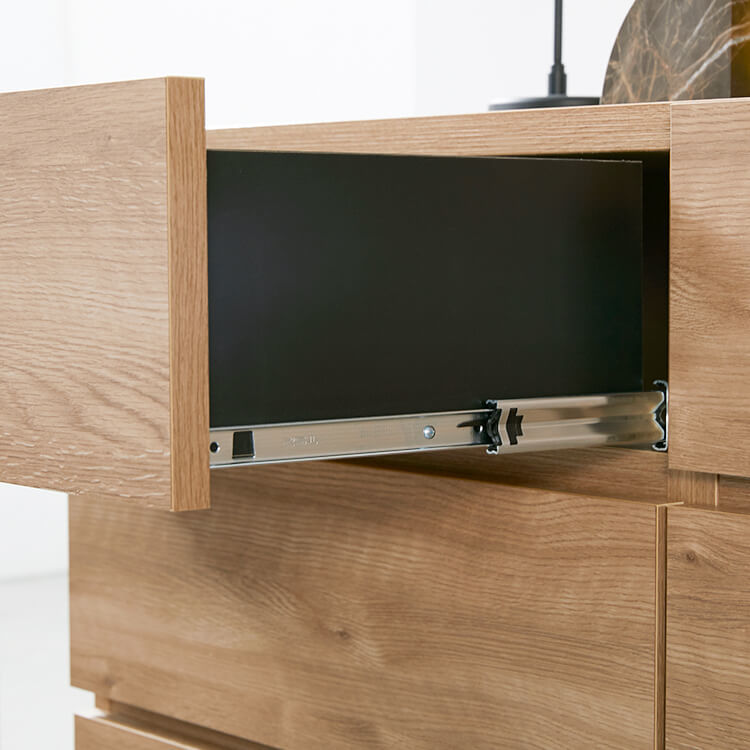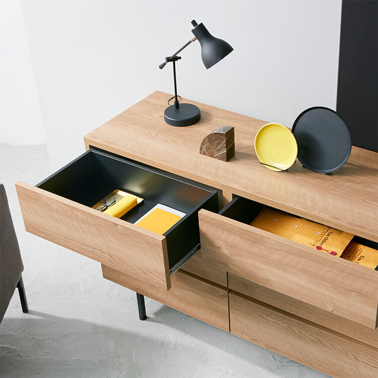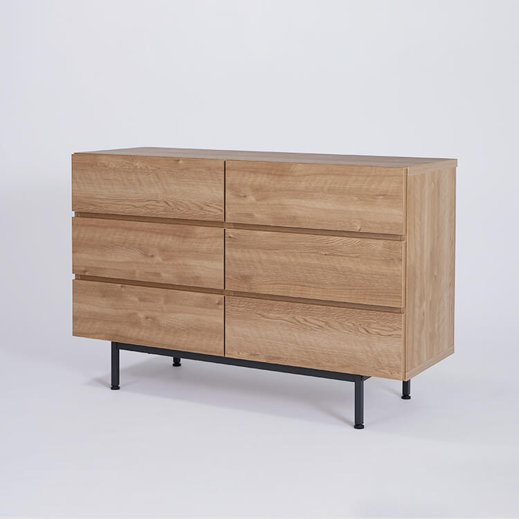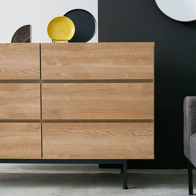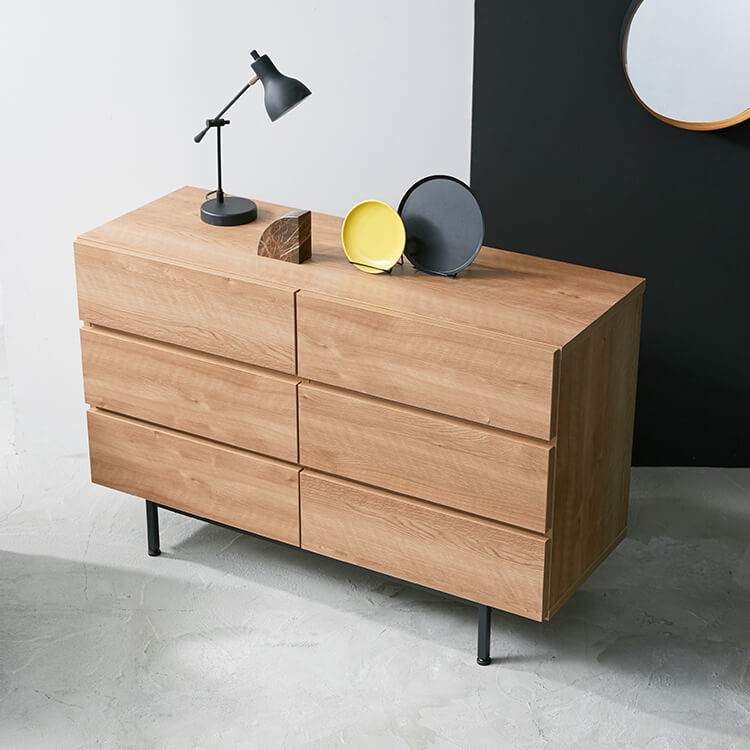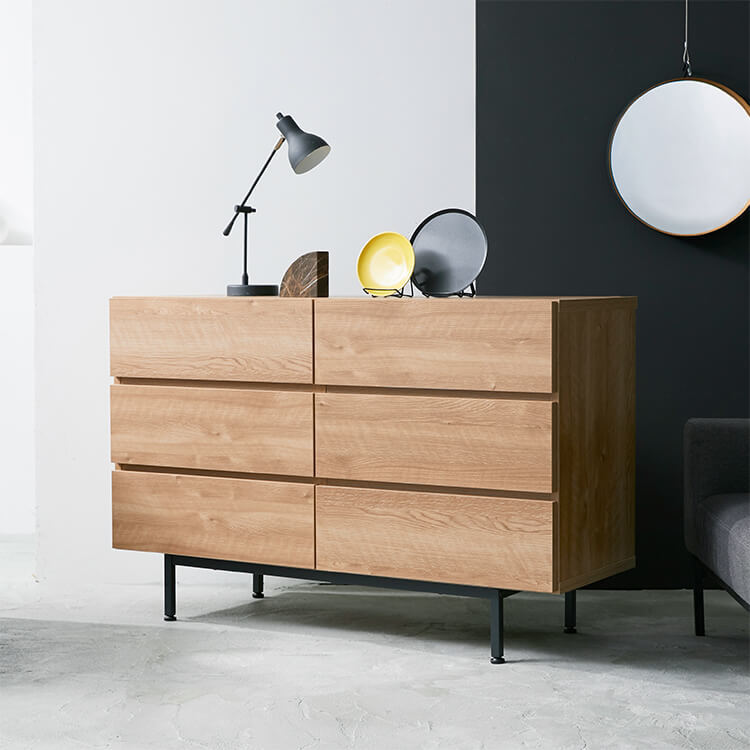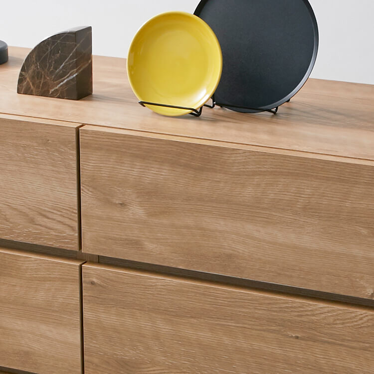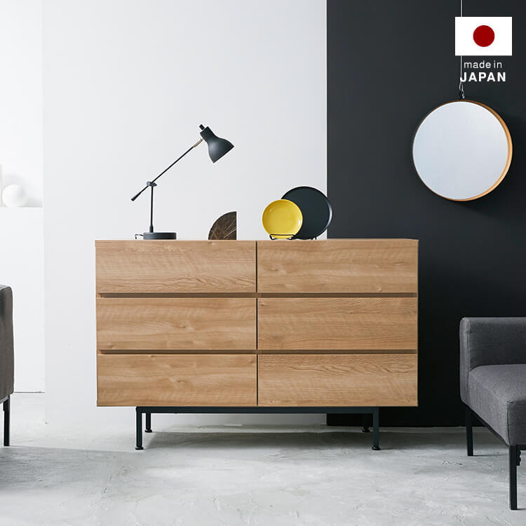 落ち着いた大人のリビング空間をつくる。木目調が映える、シンプルな造形と機能美を備えた国産ローチェストです。熟練の家具職人が一つ一つ丁寧に真心こめて作り上げました。安価な輸入品とは違い、日本製ならではの匠のプライドと情熱を詰め込んだ完成度の高い一品です。美しい木目柄を遮る取っ手を付けないことで、スタイルを選ばないシンプルなカタチに。インテリア性の高い美しいローチェストに仕上がりました。細かく仕分けができる引き出しが6杯付いたデザインになっています。きちんと左右で仕分けして収納ができる上、1杯の横幅が約50cmと洋服もゆったりと収納することができます。