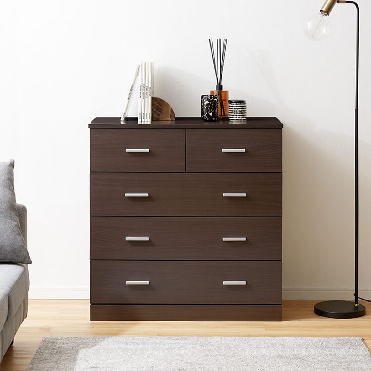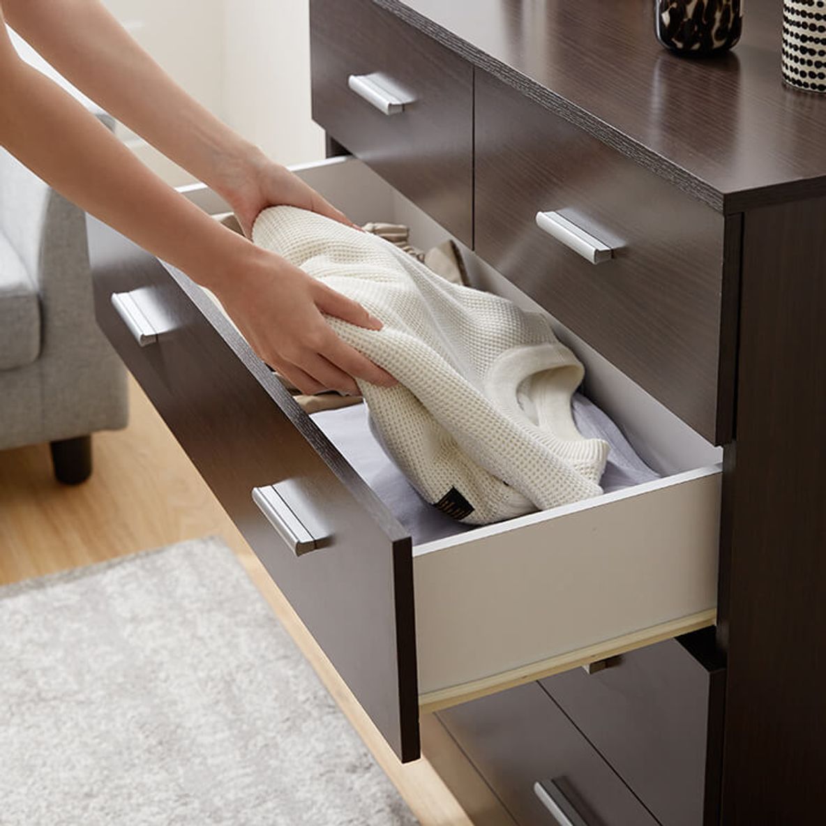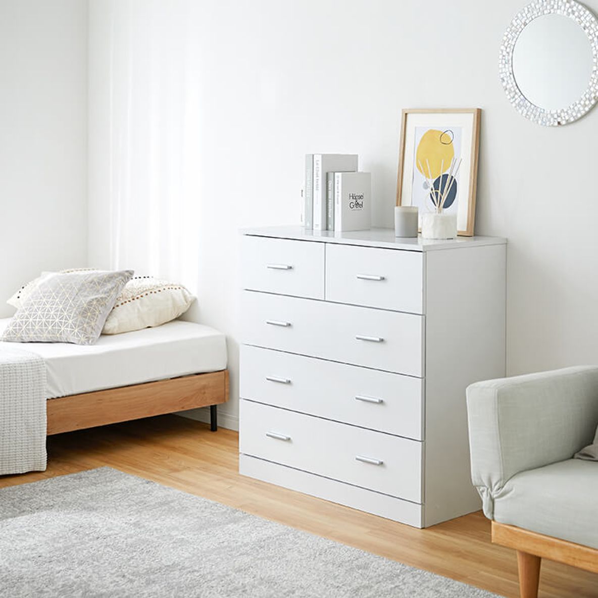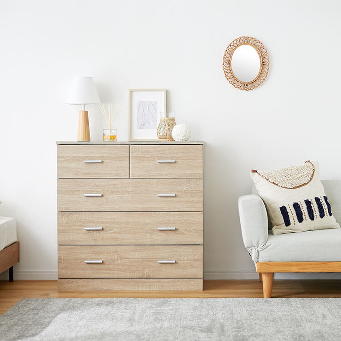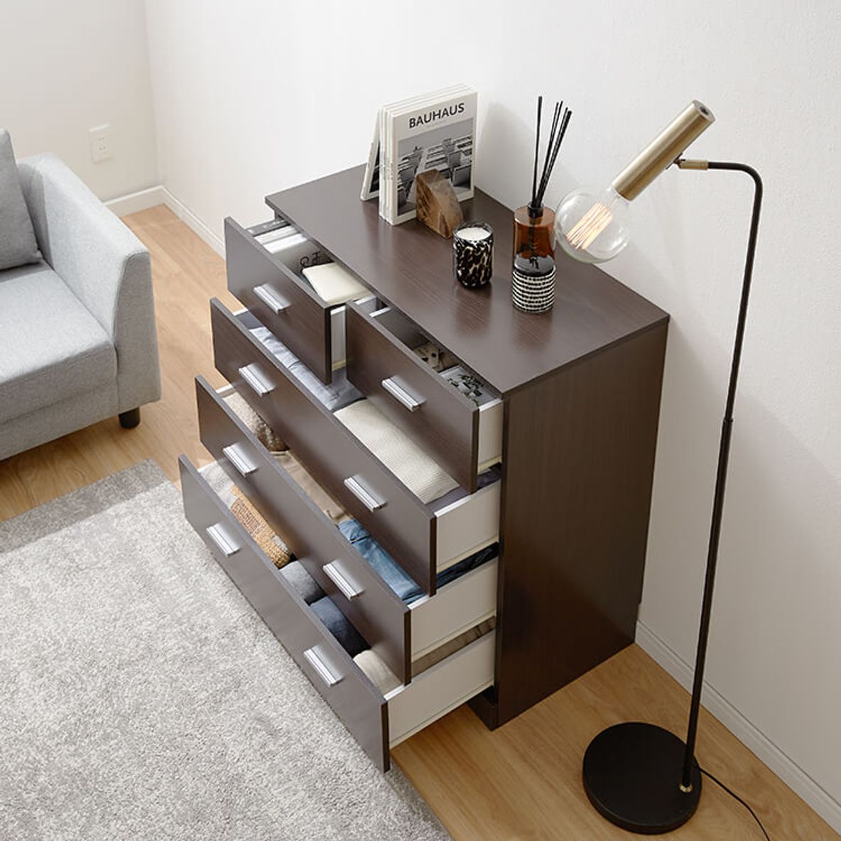 シンプルなデザインに加え収納力たっぷりのこのチェスト。お部屋に散乱していた衣類や道具類をスッキリ整理整頓できます。あらゆるシーンでの使用を想定して考えられたシンプルで美しいカタチ。無駄をそぎ落とした、どんなお部屋にも合うデザインです。収納するだけでなく、天板にお気に入りの物を飾ればオシャレな小物置きとしても大活躍。飾るものをさらにオシャレに引き立ててくれます。チェストといえば一番大事なのは収納力。設置スペースはコンパクトに抑えつつ、収納力をしっかり確保できるように考えられたサイズ設計です。