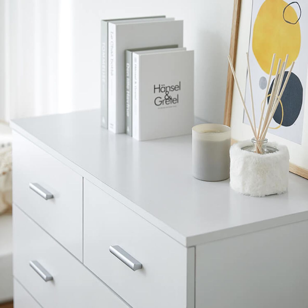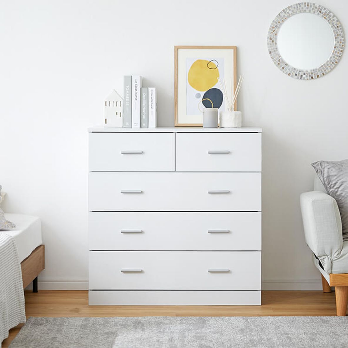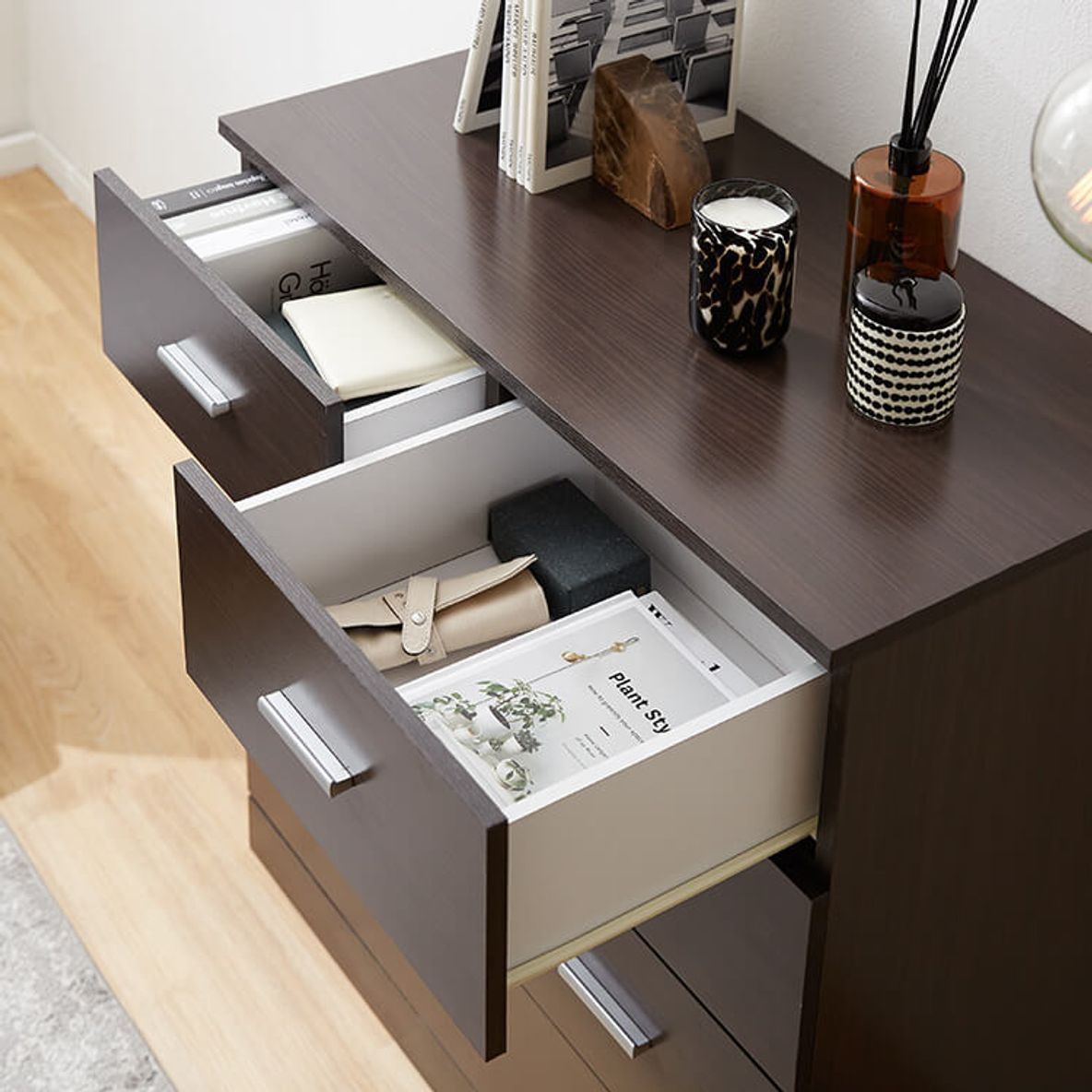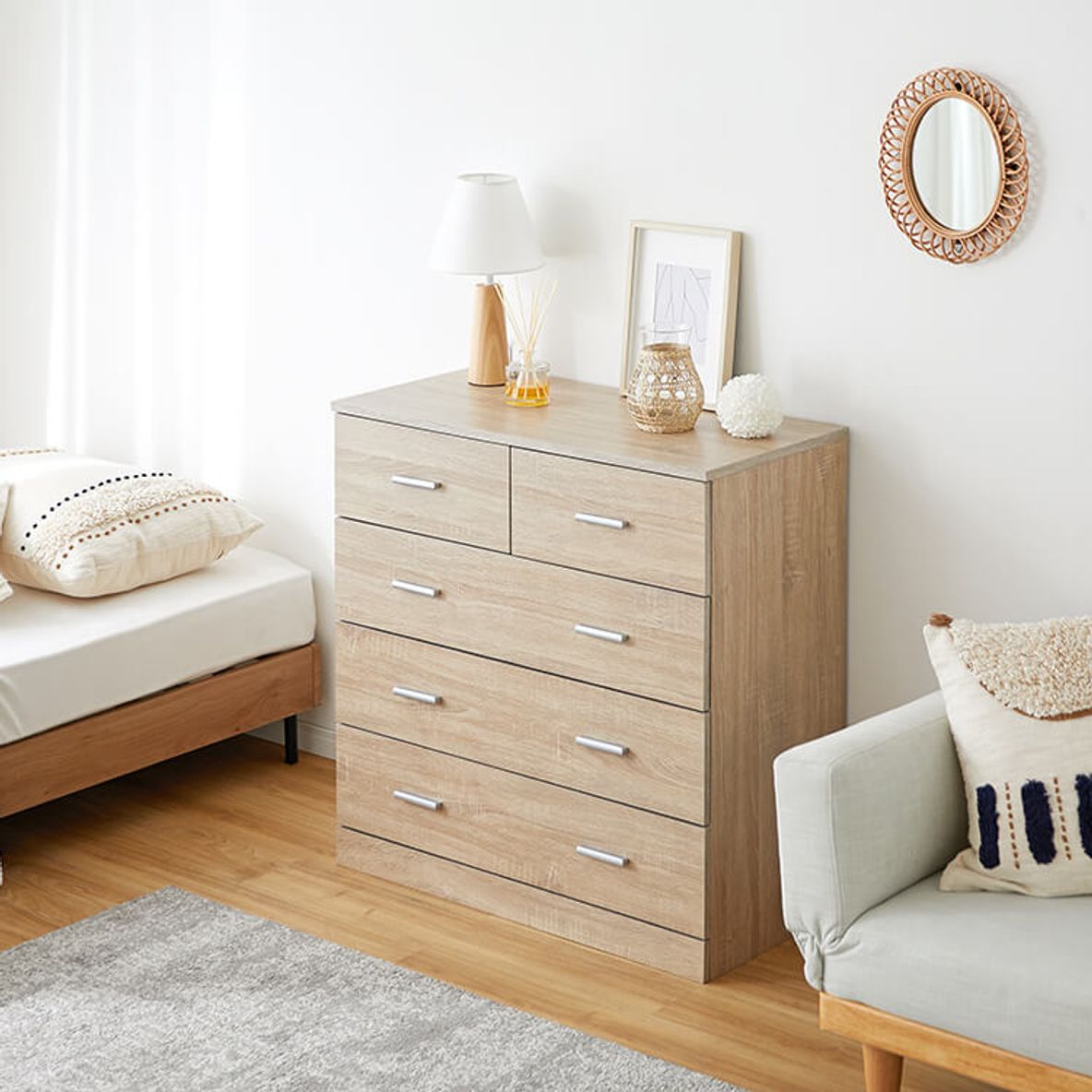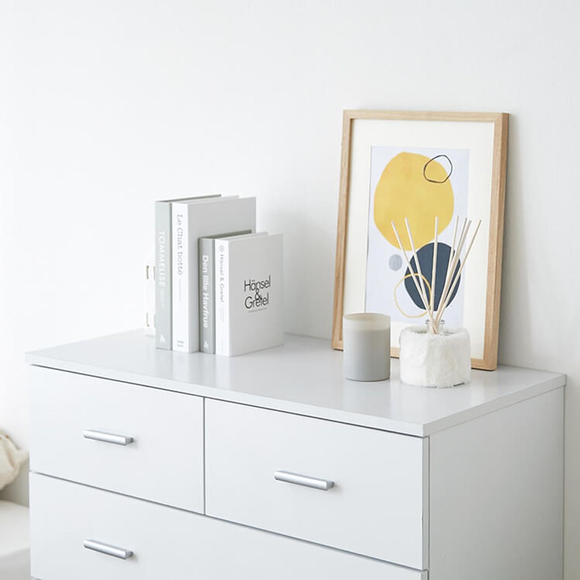 シンプルなデザインに加え収納力たっぷりのこのチェスト。お部屋に散乱していた衣類や道具類をスッキリ整理整頓できます。あらゆるシーンでの使用を想定して考えられたシンプルで美しいカタチ。無駄をそぎ落とした、どんなお部屋にも合うデザインです。収納するだけでなく、天板にお気に入りの物を飾ればオシャレな小物置きとしても大活躍。飾るものをさらにオシャレに引き立ててくれます。チェストといえば一番大事なのは収納力。設置スペースはコンパクトに抑えつつ、収納力をしっかり確保できるように考えられたサイズ設計です。