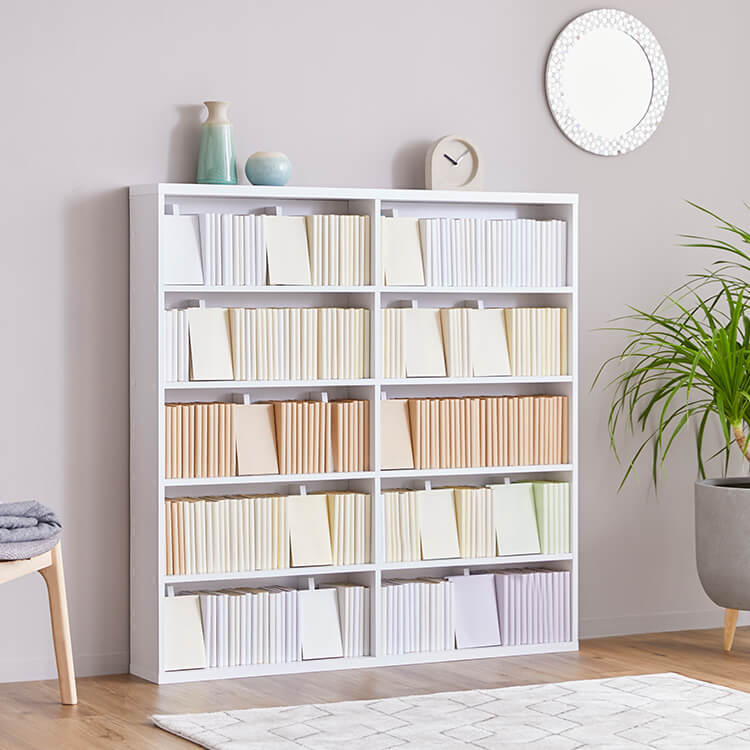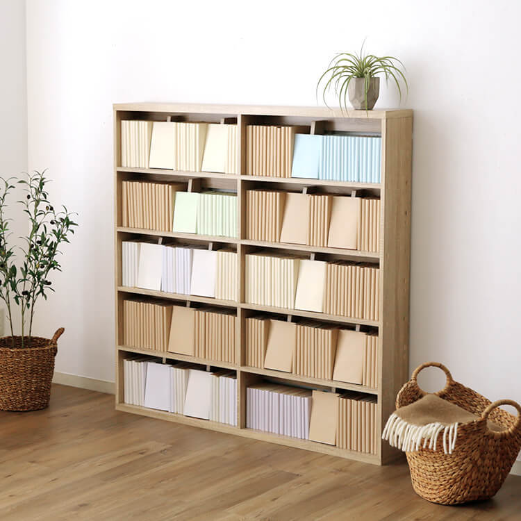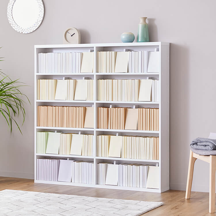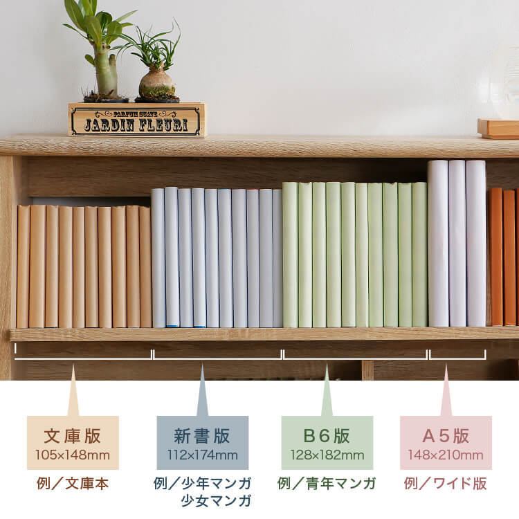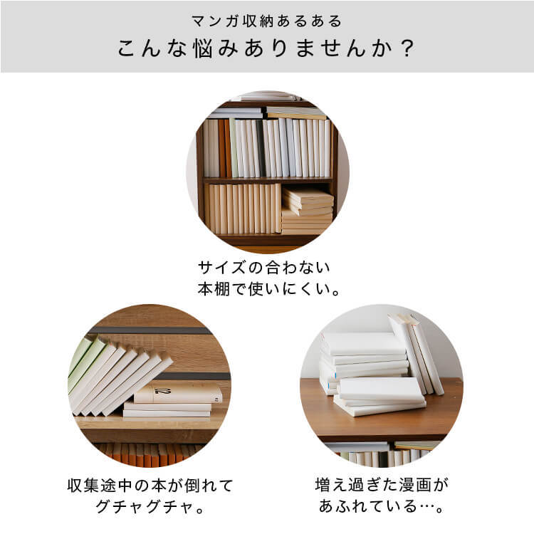 「文庫版」「新書版」「B6版」「完全版」全てOK。図書室のようにマンガを陳列できる、おしゃれなコミック収納のワイドタイプです。当社のマンガ好きが集まって企画したコミック収納の理想型です。2列収納をやめて、きれいで取り出しやすく、さらに省スペース設計に。転倒防止金具付きで、万一の揺れにも備えます。マンガ収納時にこんなことはありませんか?企画時に声の多かったマンガ収納のお悩み。当商品はこれらの問題を解消し、気持ちよくマンガを収納できる仕掛けがたくさん。文庫版~完全版までがピッタリ入るよう奥行と高さを設計しました。ムダなスペースを使わず美しく陳列。簡単出し入れの使いやすさがポイントです。