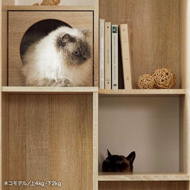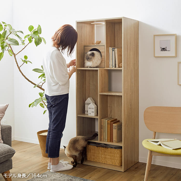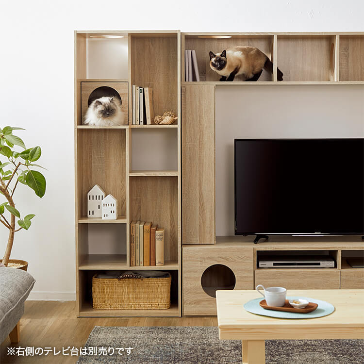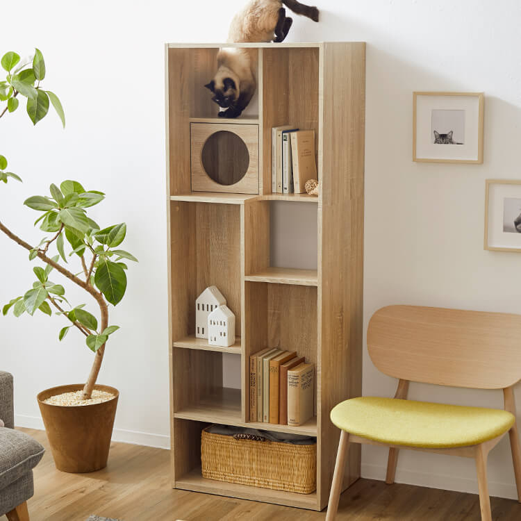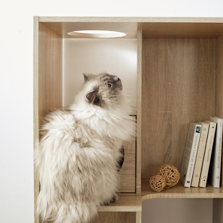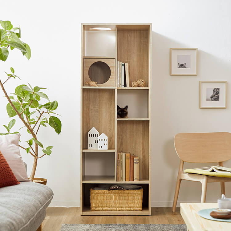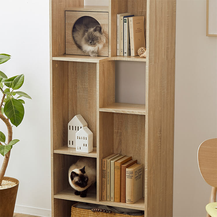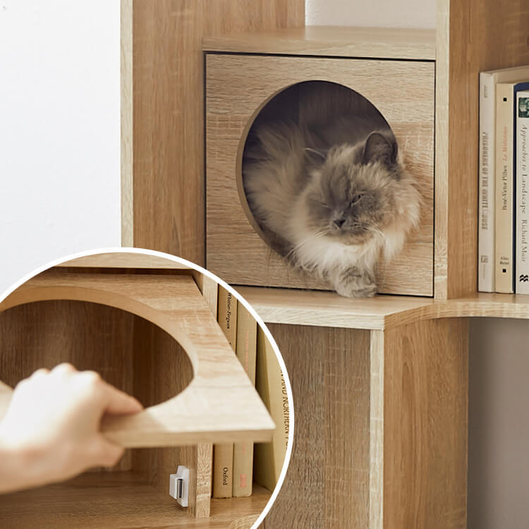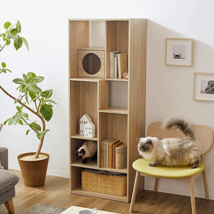 全国の猫好きに届けたい「猫と暮らすインテリア」。大人気キャットウォーク付き壁面テレビ台と並べて使うこともできる、本棚ができました。部屋の景観はきれいでおしゃれに保ちつつ愛猫を愛でる、幸せな時間をお届けします。最近では猫が暮らしやすいようリフォームやDIYの話もよく聞きますが、実際難しいという人がほとんど。だったら、猫と一緒に暮らすための家具を作ってしまえば?ということで生まれたシリーズです。猫たちのスムーズな動線を確保しつつ、本棚としても活躍できるよう、収納力も兼ね備えました。猫が休憩できるスペースも多く確保しています。(丸印部分)