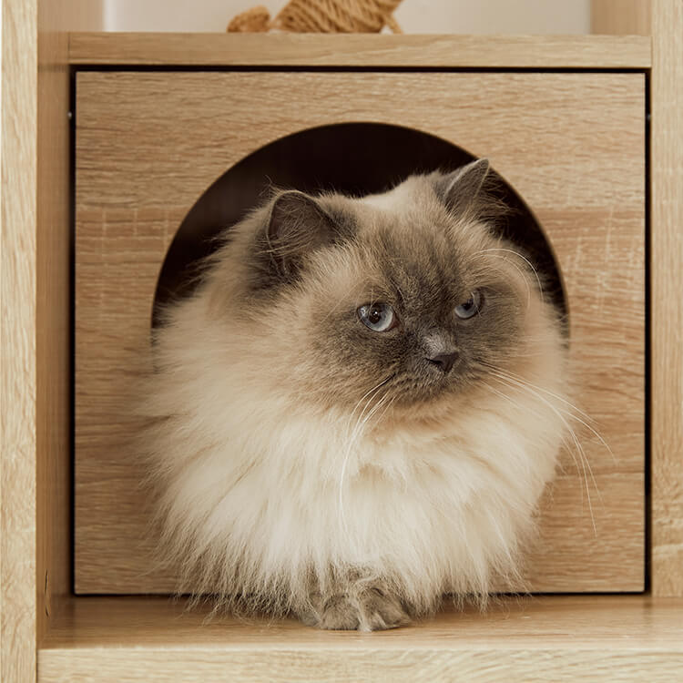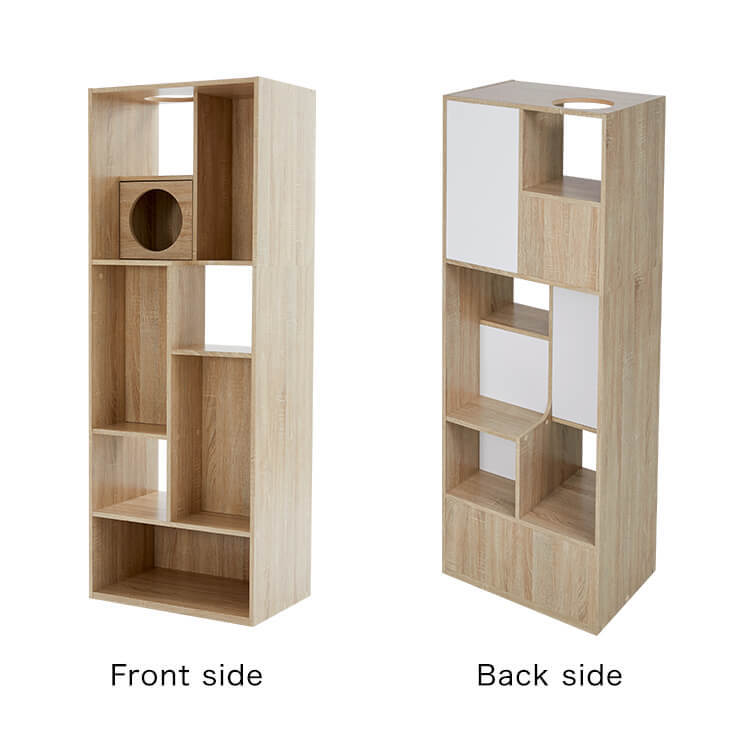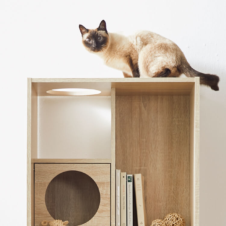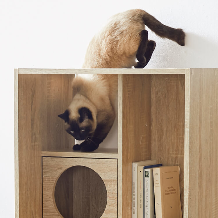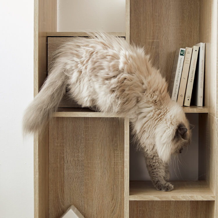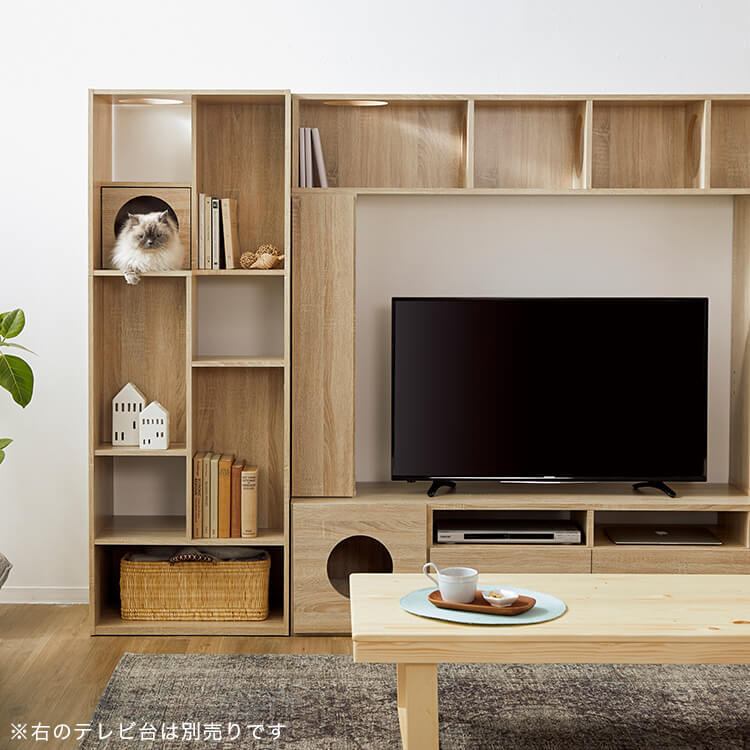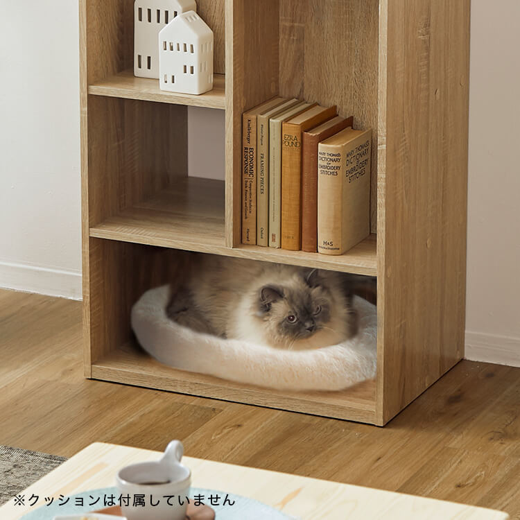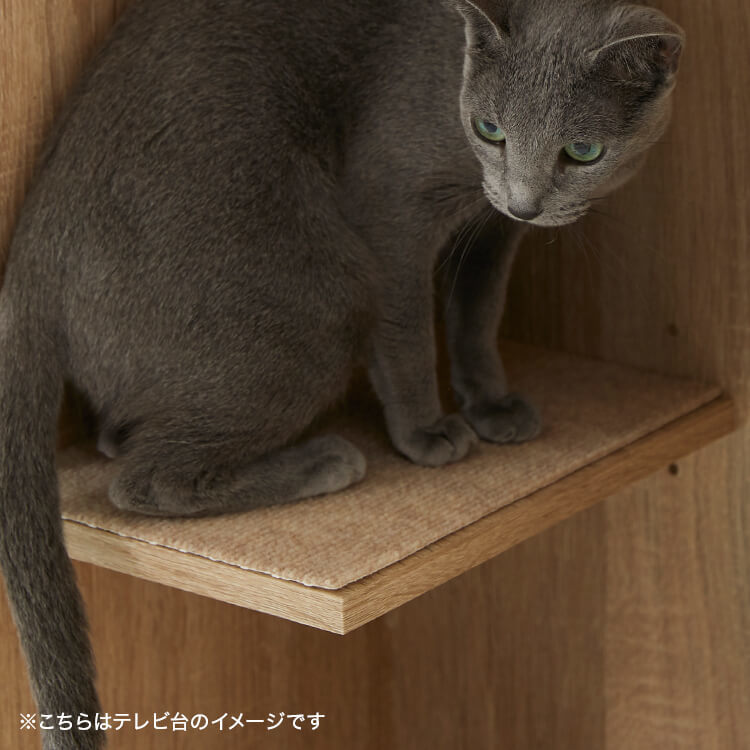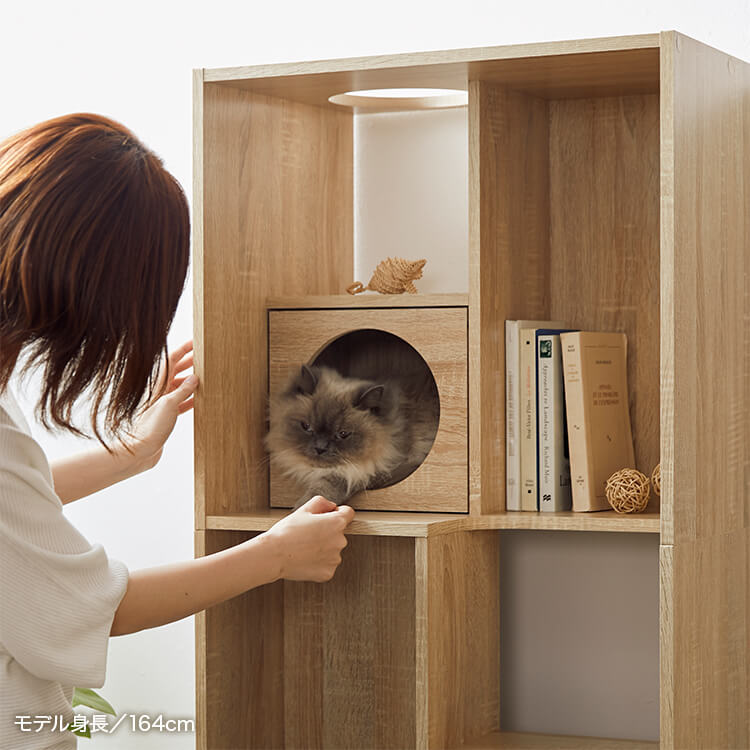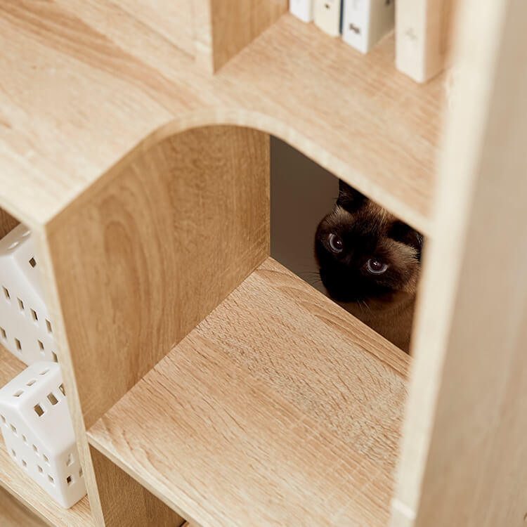 全国の猫好きに届けたい「猫と暮らすインテリア」。大人気キャットウォーク付き壁面テレビ台と並べて使うこともできる、本棚ができました。部屋の景観はきれいでおしゃれに保ちつつ愛猫を愛でる、幸せな時間をお届けします。最近では猫が暮らしやすいようリフォームやDIYの話もよく聞きますが、実際難しいという人がほとんど。だったら、猫と一緒に暮らすための家具を作ってしまえば?ということで生まれたシリーズです。猫たちのスムーズな動線を確保しつつ、本棚としても活躍できるよう、収納力も兼ね備えました。猫が休憩できるスペースも多く確保しています。(丸印部分)