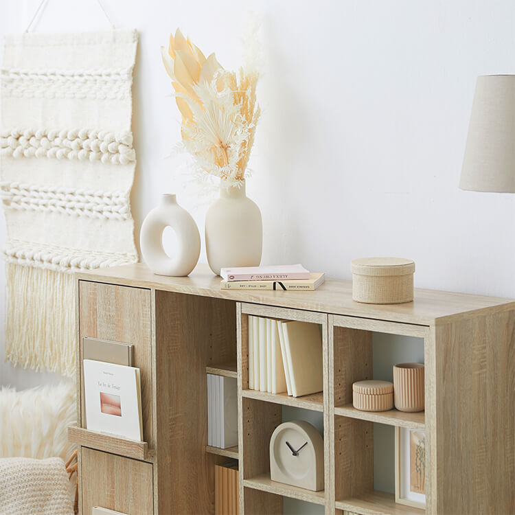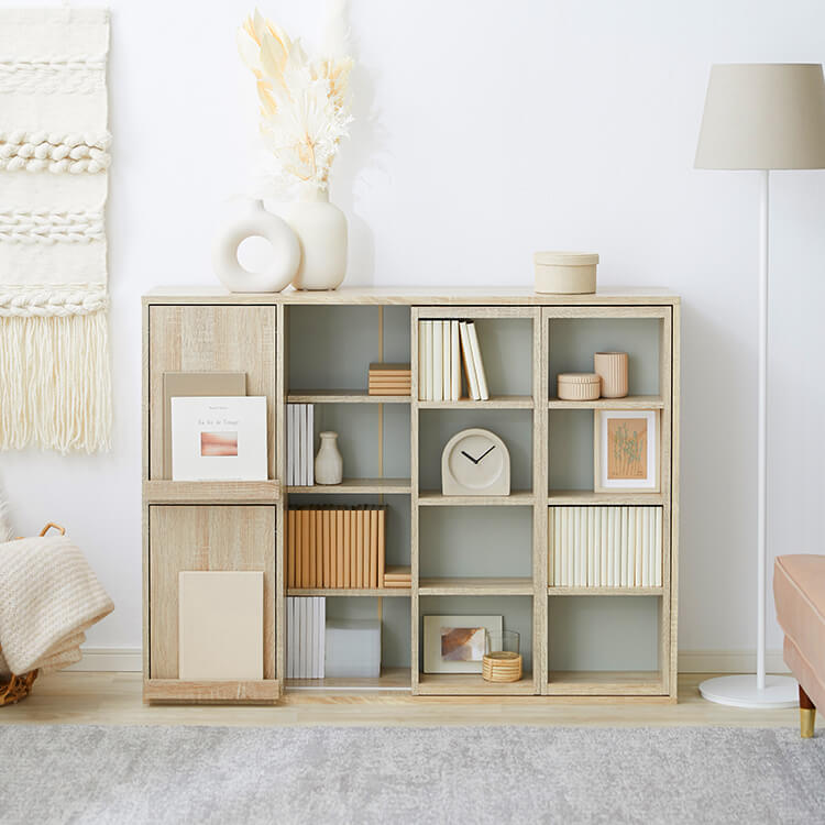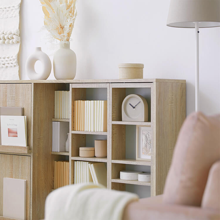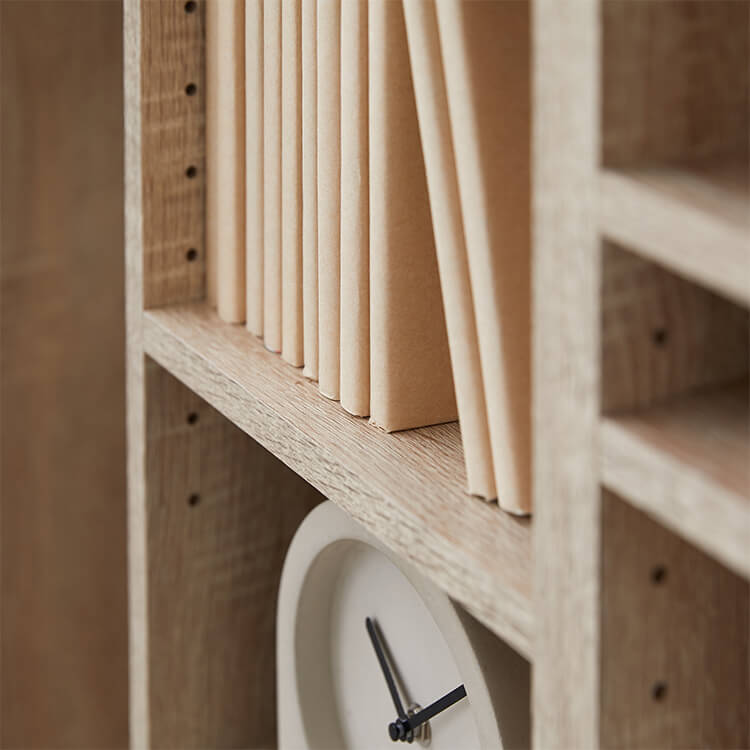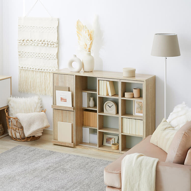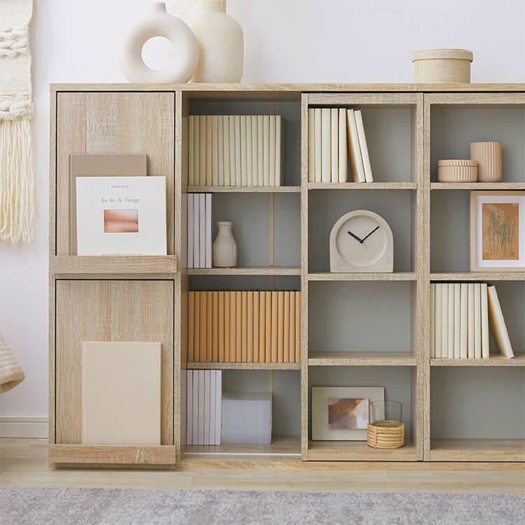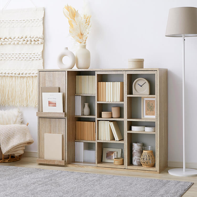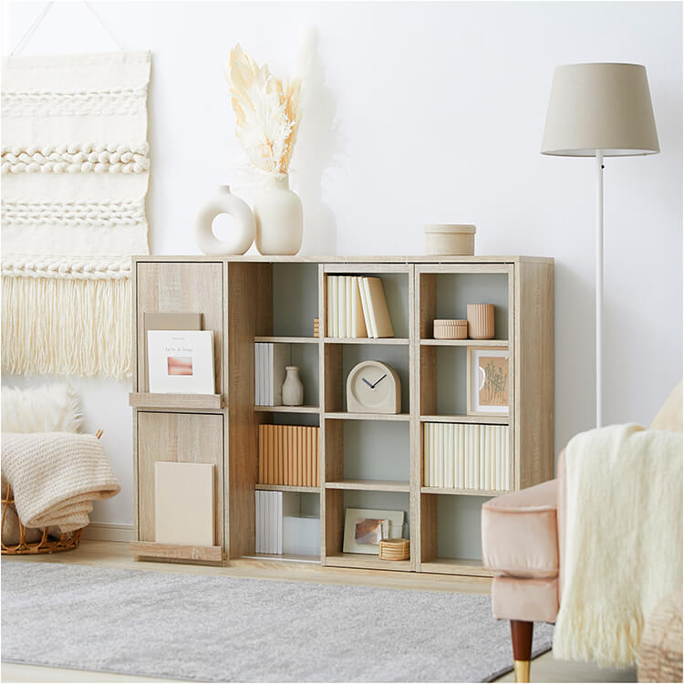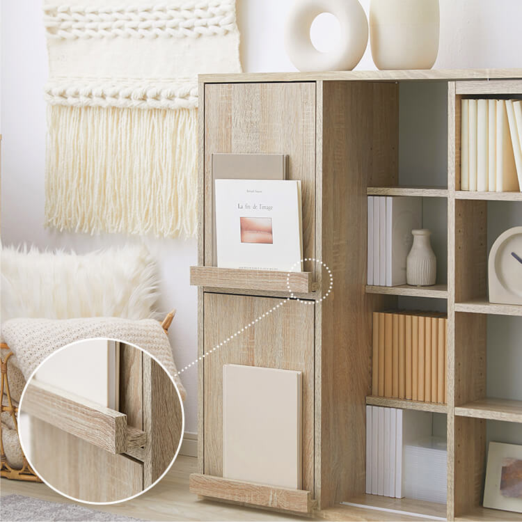 気づけば家中にあふれる様々なサイズの雑誌やコミックに、CD・DVD。まとめて収納したいけど使い勝手も重視したい。そんな方にピッタリの本棚ができました。文庫本から新書・単行本・A5ワイド本を始め、CDやトールケースのDVDなど幅広いサイズを収納可能。種類別に分けて収納すれば見た目にも美しく、出し入れもしやすいのがポイントです。新しく買ったDVDや、よく読む本はここに。いつでもサッと取り出せて使いやすく、お気に入りの小物を置けば、魅せる収納スペースに。スライド棚の上部には脱線を防ぐピンがあり、下部にはキャスターをつけているので、収納量が増えてもスッとスライドできます。
