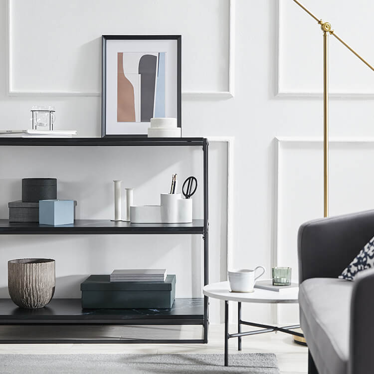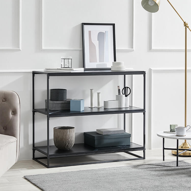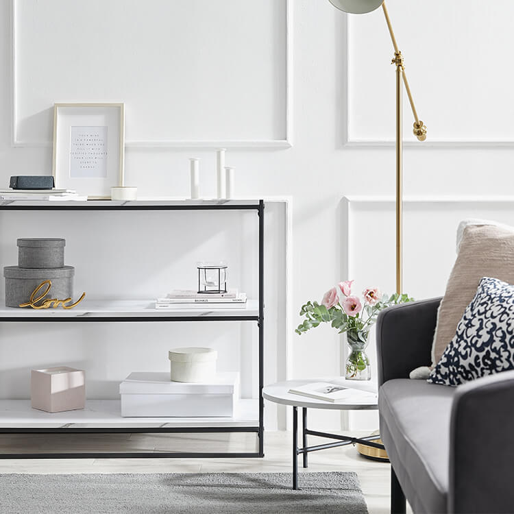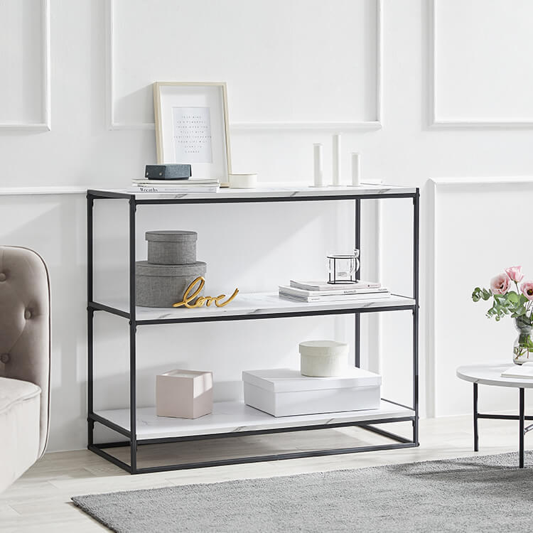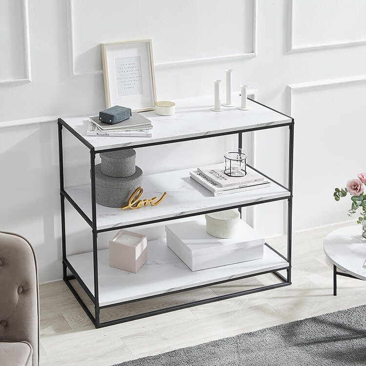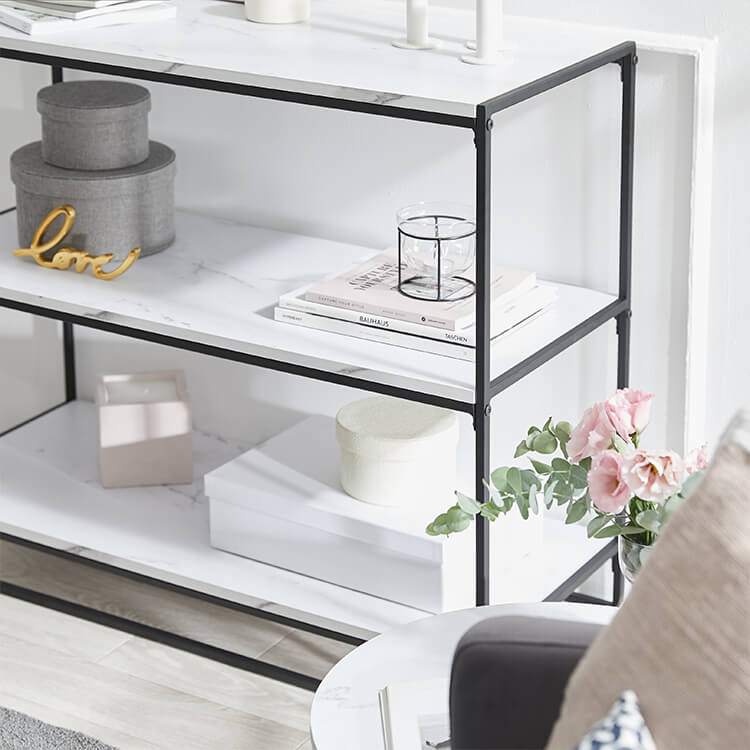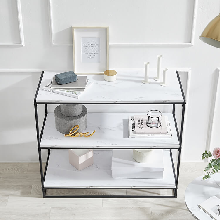 上品さを感じる大理石柄に、細身のスチールをMIXした、シンプルで美しい3段デザインラック。お気に入りのアイテムを飾って、自分らしさが光るディスプレイをお楽しみください。憧れの海外風インテリアのような、大理石柄の天板と細いスチール脚を組み合わせたディスプレイラック。シンプルで洗練されたデザインが、インテリアのアクセントとなり理想のお部屋へと導いてくれます。こちらの商品は、当社デザイナーが独自のこだわりを持って完成させました。この商品が買えるのは日本全国で当社だけです。本物のようなリアルさと高級感があり、置いたモノまでお洒落に魅せる大理石柄の天板。美しい模様を描く柄は、プレミアム感がありワンランク上の空間を演出してくれます。