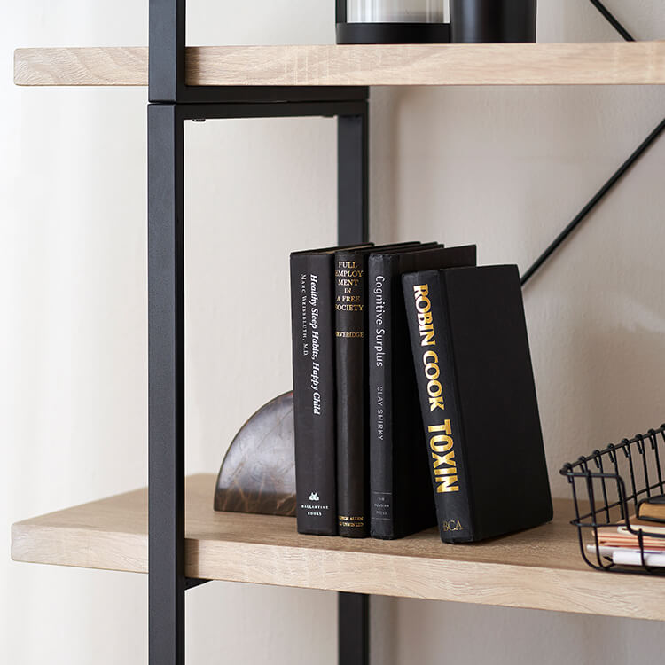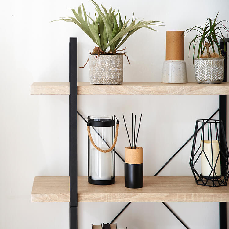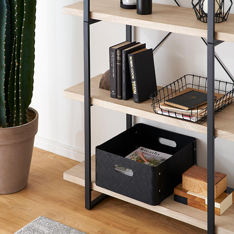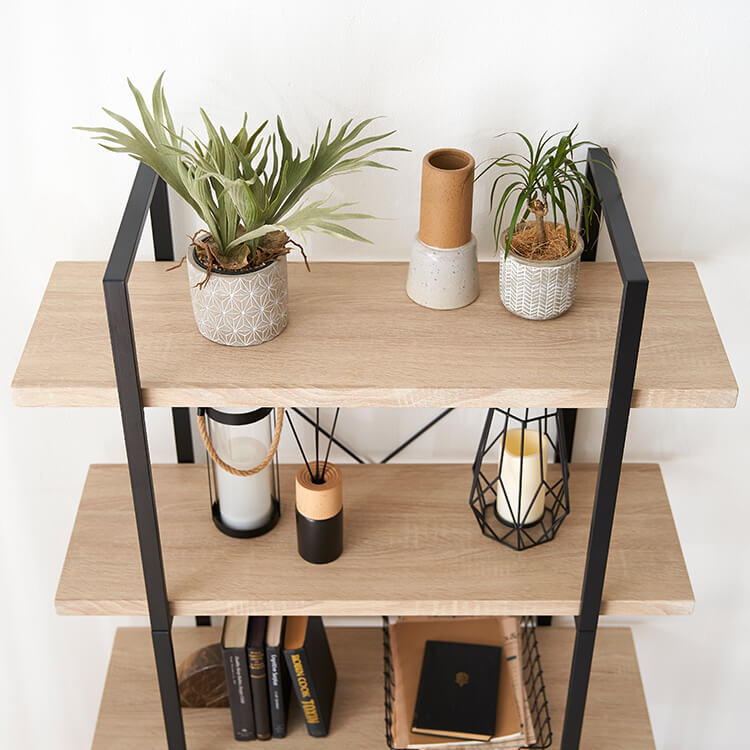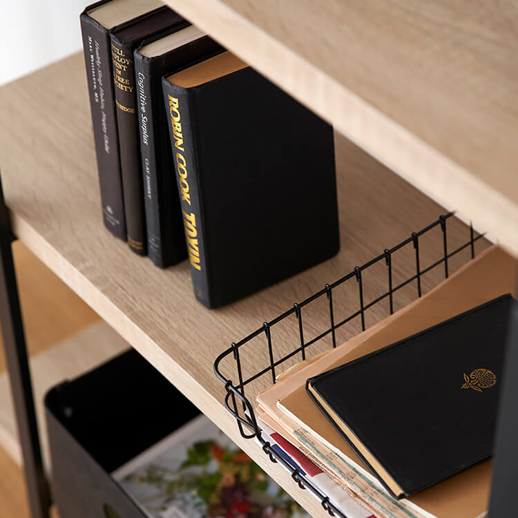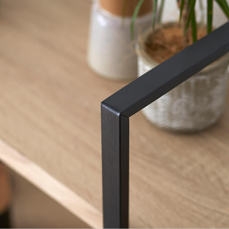 お気に入りのアイテムをディスプレイすれば、自分のコレクションスペースが完成します。黒いスチールとナチュラルな木目調を組み合わせたナチュラルモダンなデザイン。ただ置くだけで、アイテムをお店のディスプレイのように引き立ててくれます。天然の木目を連想させるナチュラルな色と柄を再現し、リアルな木目調に仕上げました。表面は水や傷にも強いPVC(塩ビ化粧)仕上げなので、汚れたらさっと布でふき取るだけ。※完全防水ではありませんので、劣化防止のため、水分は早めに拭き取ってください。