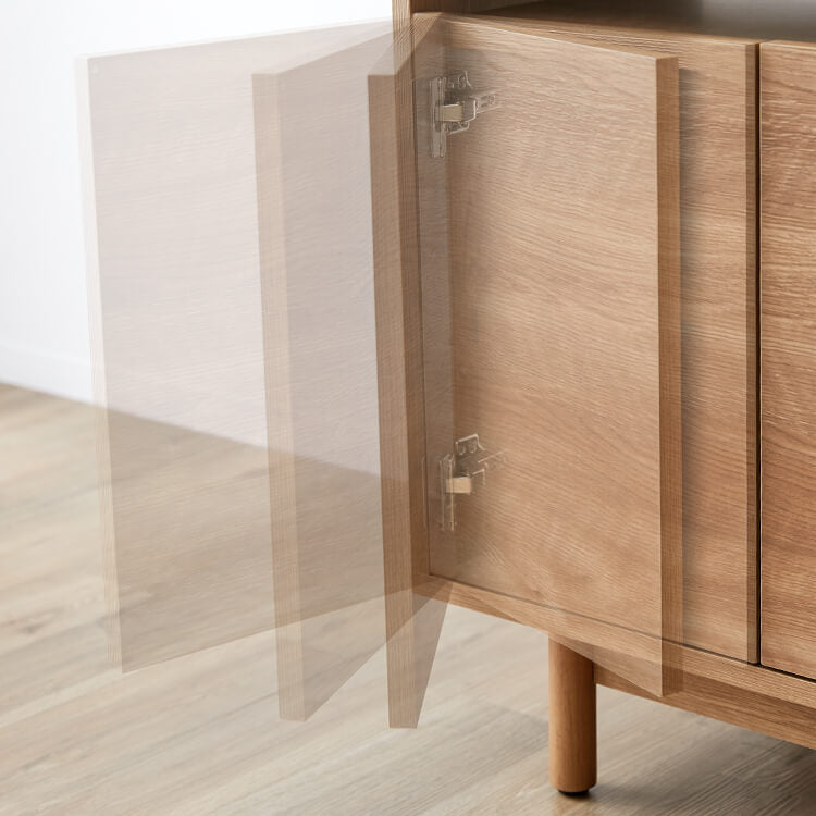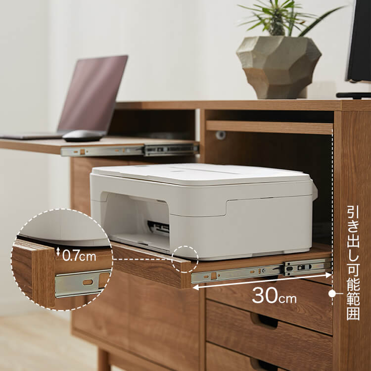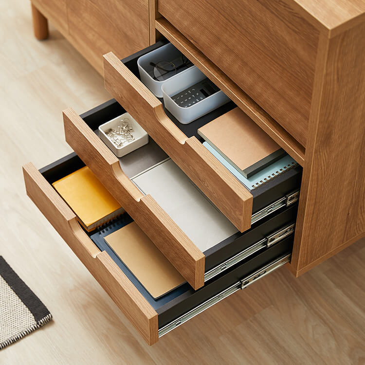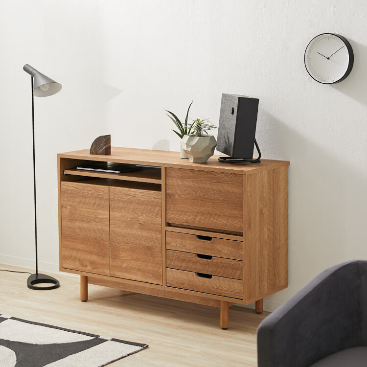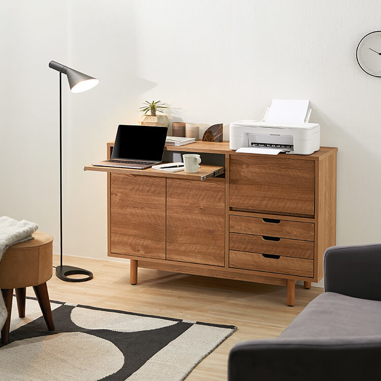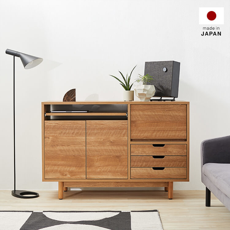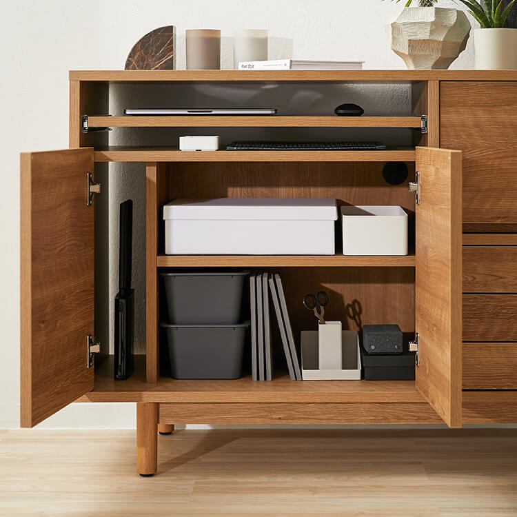 PC、プリンター、電話などの家電から、小物類や書類まで、リビングに溢れるモノをスッキリしまえる大容量の収納スペースを備えた、北欧テイストのサイドボードです。それぞれの生活スタイルにあわせて、収納がたっぷりできるよう工夫をこらしました。どう使うかはあなた次第、すっきり美しいリビングづくりに一役買う頼もしい収納力です。まるで、本物の木目のような美しい木目調が特徴のこのサイドボード。みんなが集いたくなるような、ナチュラルで落ち着いた空間をつくります。木目調の美しさを印象づけるため、取っ手を付けるなどの余計な装飾をしない、フラットデザインで仕上げました。シンプルなサイドボードだからこそ、生活感が美しくしまえます。