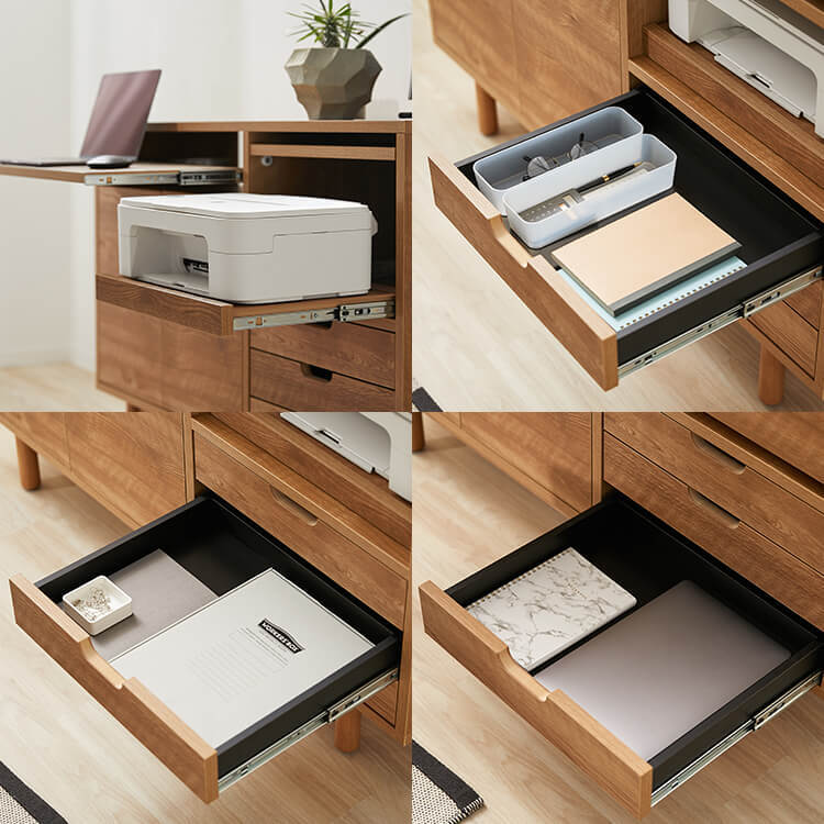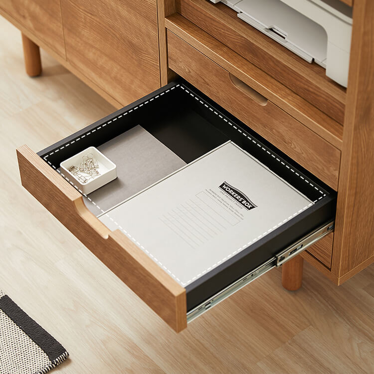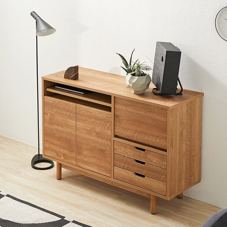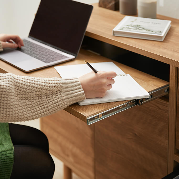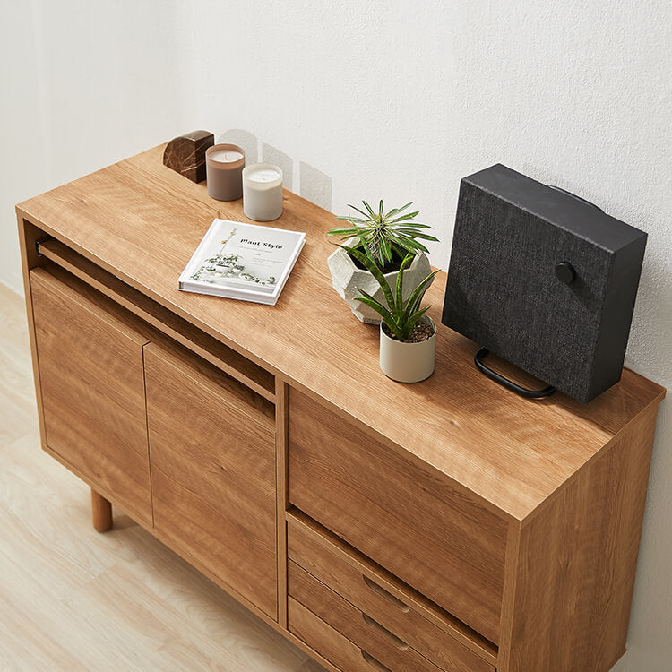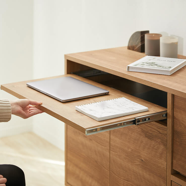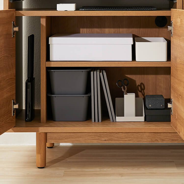 PC、プリンター、電話などの家電から、小物類や書類まで、リビングに溢れるモノをスッキリしまえる大容量の収納スペースを備えた、北欧テイストのサイドボードです。それぞれの生活スタイルにあわせて、収納がたっぷりできるよう工夫をこらしました。どう使うかはあなた次第、すっきり美しいリビングづくりに一役買う頼もしい収納力です。まるで、本物の木目のような美しい木目調が特徴のこのサイドボード。みんなが集いたくなるような、ナチュラルで落ち着いた空間をつくります。木目調の美しさを印象づけるため、取っ手を付けるなどの余計な装飾をしない、フラットデザインで仕上げました。シンプルなサイドボードだからこそ、生活感が美しくしまえます。