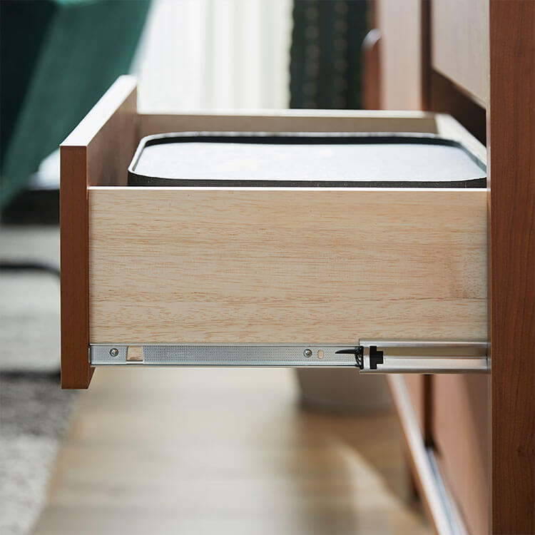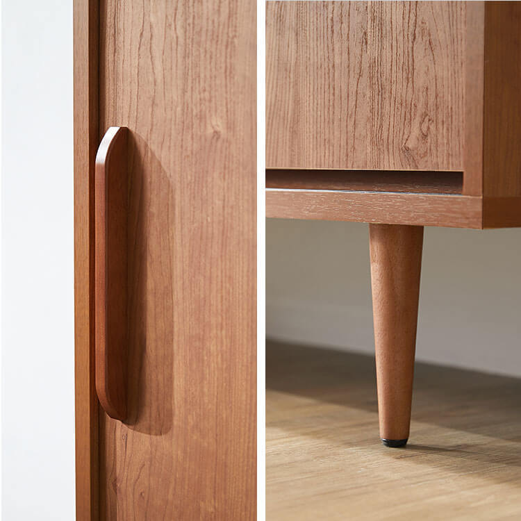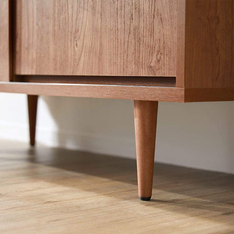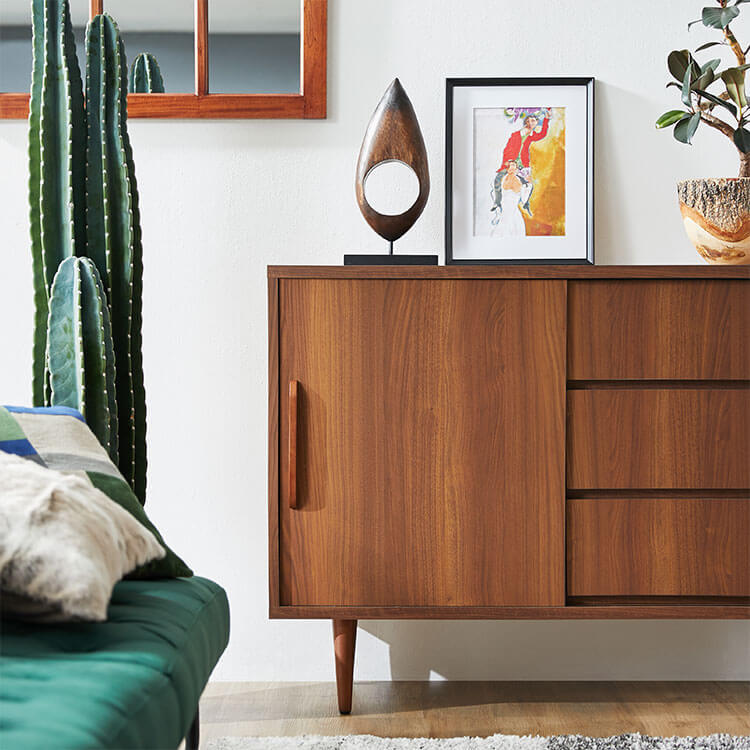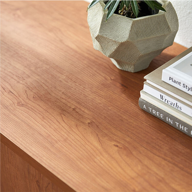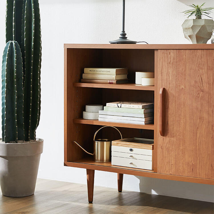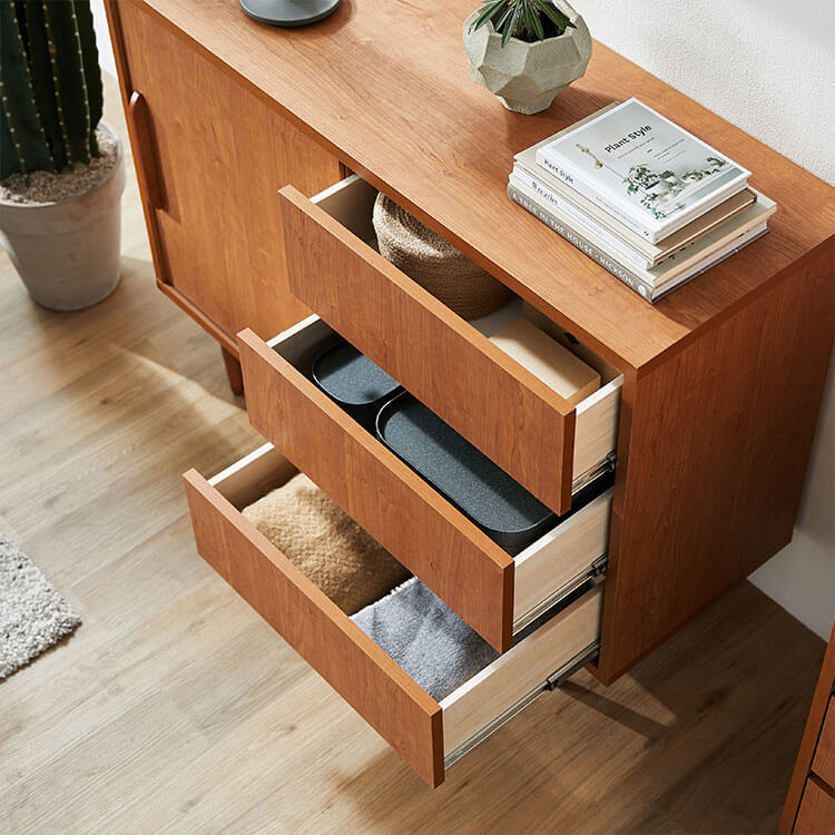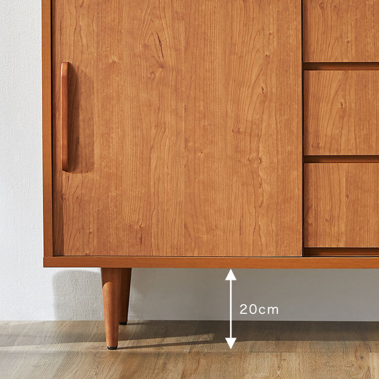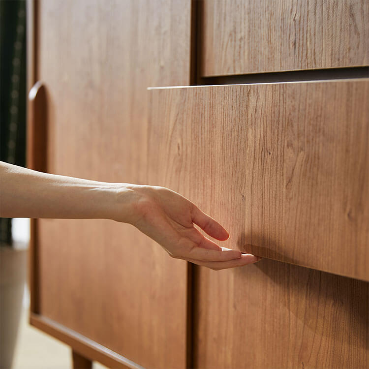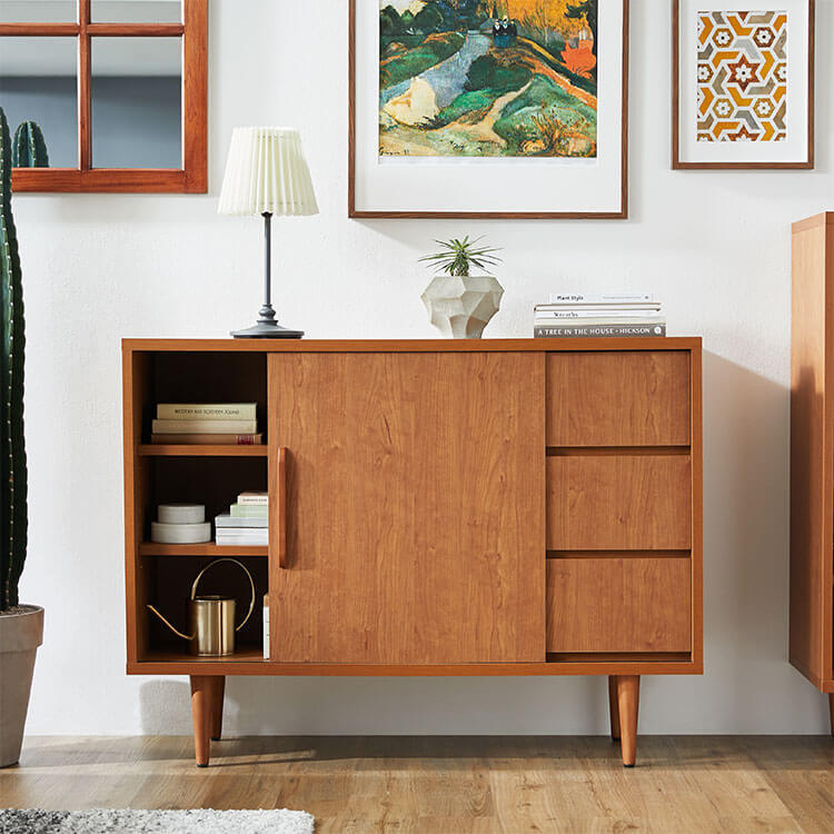 フラットなフォルムが美しいデザインに、たっぷり仕舞える収納。北欧ヴィンテージのような、やさしく味のある木目が魅力のサイドボードです。こちらの商品は当社デザイナーが独自のこだわりを持って完成させたオリジナル商品です。余計な装飾は取り除き、北欧風テイストのお部屋に似合う美しくシンプルなシルエットにこだわりました。ほっとする丸みを帯び、やや内側にきゅっと収まった脚が特徴のシルエット。強度を確保しつつ重くなり過ぎない、絶妙なバランスです。フラットなデザインを際立たせるため、引き出しには取っ手のないデザインを採用しました。