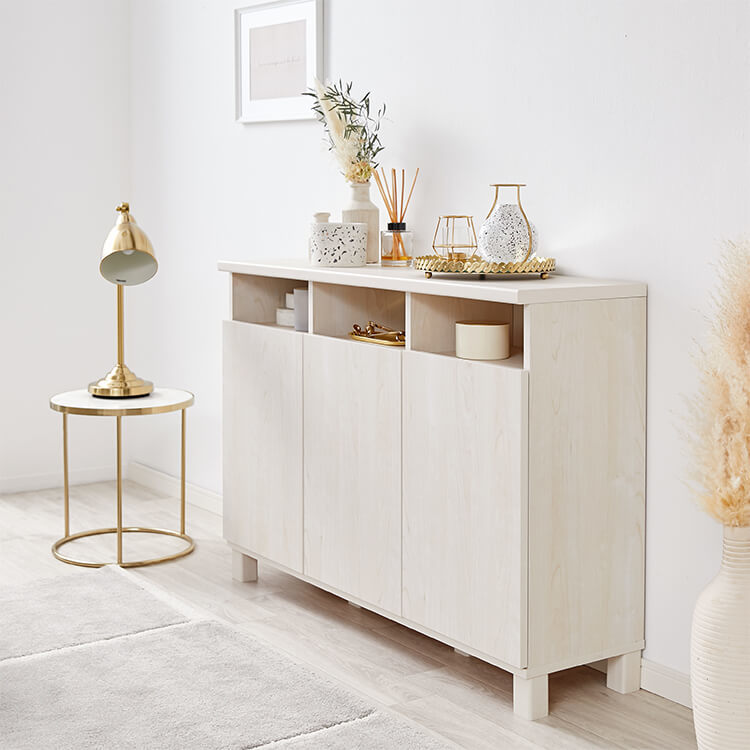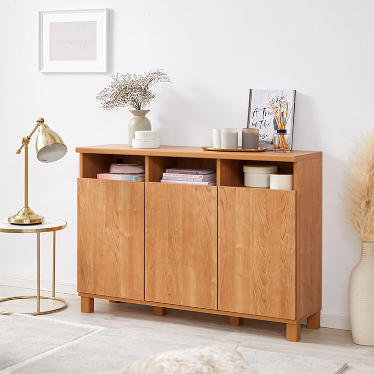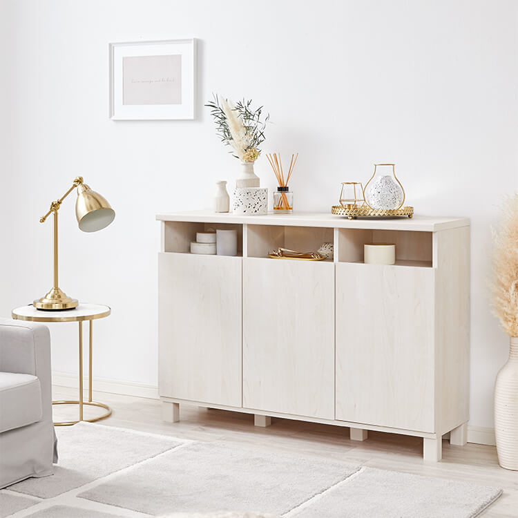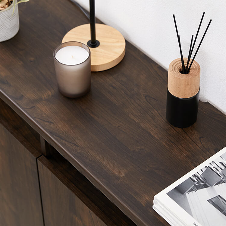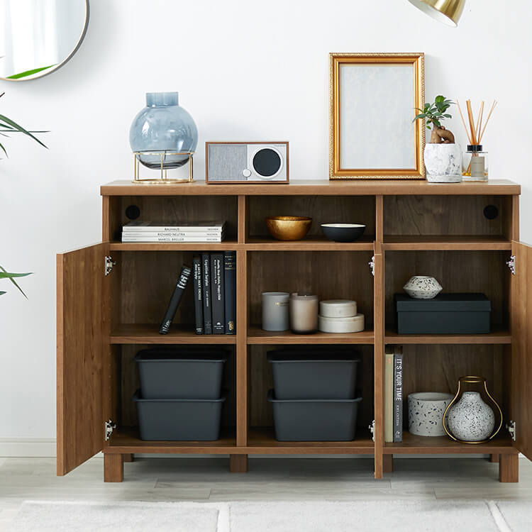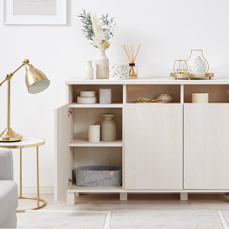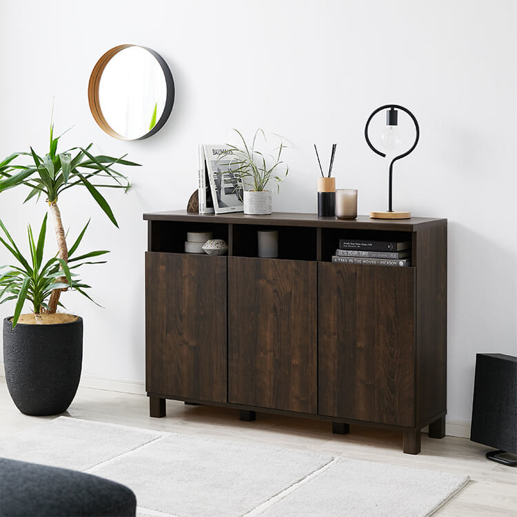 部屋にあるものを収納して生活感を隠せる扉収納。でも普通の収納棚は大きすぎて圧迫感がある…。そんなお部屋にも置きやすく、使い勝手の良いサイズ感の収納カウンターができました。出し入れが楽なオープンスペースと、隠せる扉収納が一体になった便利なカタチ。魅せると隠すの両立が叶います。部屋が散らかる原因のひとつに「物の定位置を決めていない」というものがあります。こちらはそんな問題に寄り添えるシンプルで収納に特化した大容量のキャビネット。こまごまとしたものをスッキリと片付けることができます。奥行は約32.5cm。扉を開けても約66.5cmという一般的なキャビネットよりもスリムサイズなので、お部屋に圧迫感を与えません。シックハウス症候群を引き起こす原因のひとつとされる化学物質「ホルムアルデヒド」の発散量を示す等級。当商品は、その中で最も発散量が少ない「F☆☆☆☆」相当の低ホルムアルデヒド材料を、本体のMDFと接着剤に使用しています。