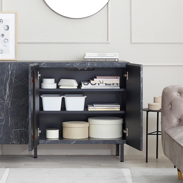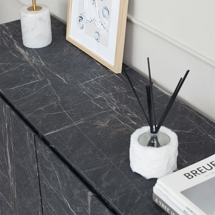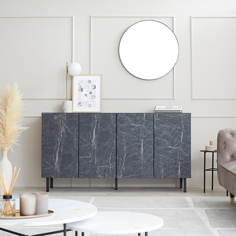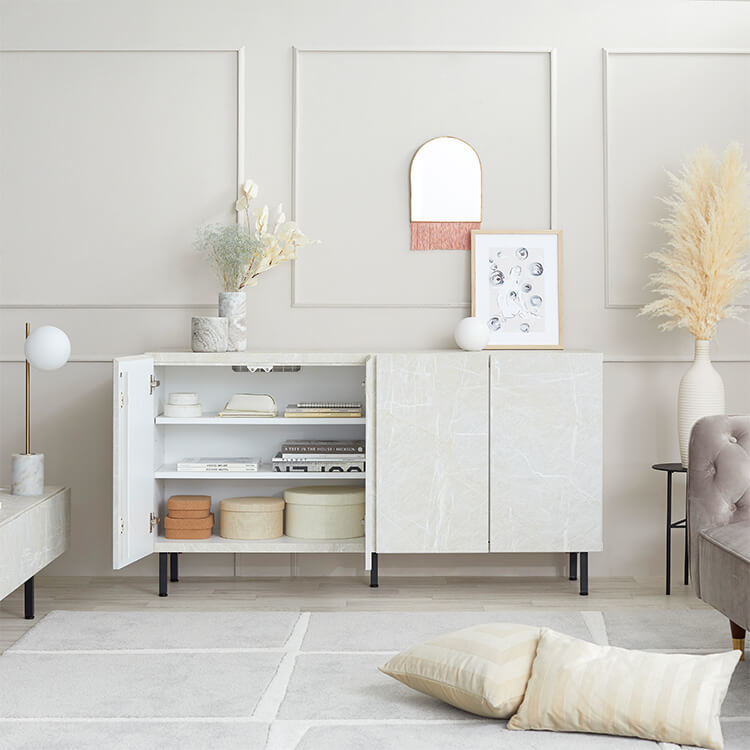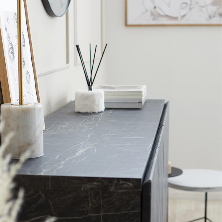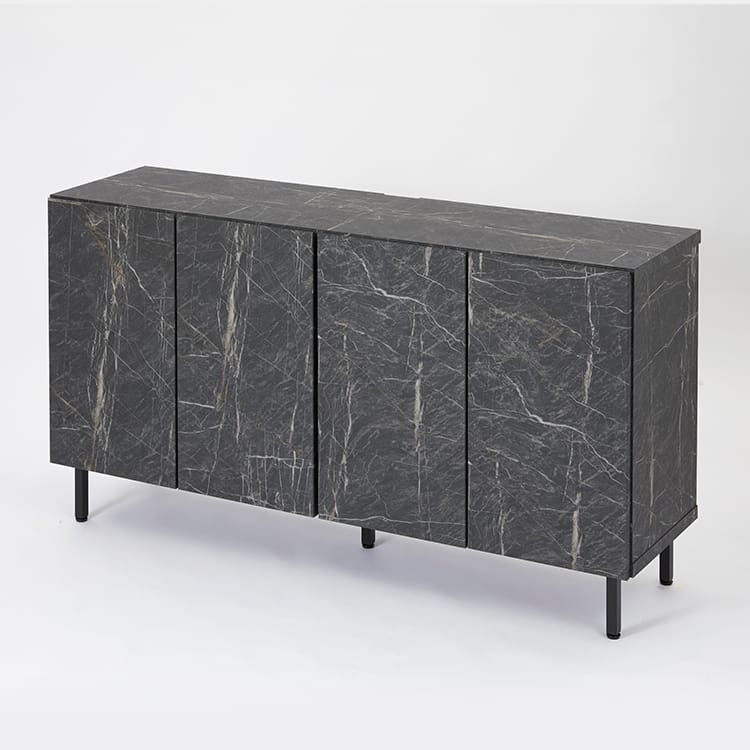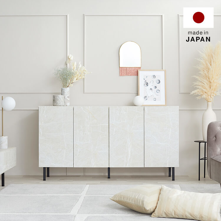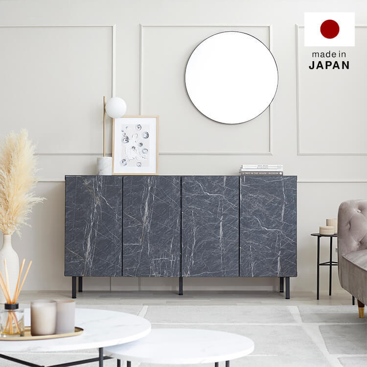 まるで本物の石のような「ストーン調」の素材と、すっきりとしたスチール脚。置くだけでお部屋をたちまちラグジュアリーな空間へと変身させる、ワンランク上のサイドボードが出来ました。美しいストーン柄を遮る取っ手をつけないことで、スタイルを選ばないシンプルなカタチに。インテリア性の高い美しいサイドボードに仕上がりました。シンプルなデザインを保つために、取っ手を無くしたフラットなデザインにこだわりました。扉の上部分を手掛かりにスムーズに開閉できます。高い技術を持つ職人がこだわりを持って作った「ストーン柄」は、まるで本物の石のようなリアルさが魅力の素材。ランダムに入り混じる躍動的な模様と自然を感じさせるカラーは、近くで見ても柄素材だと分からないほどの高いクオリティーです。