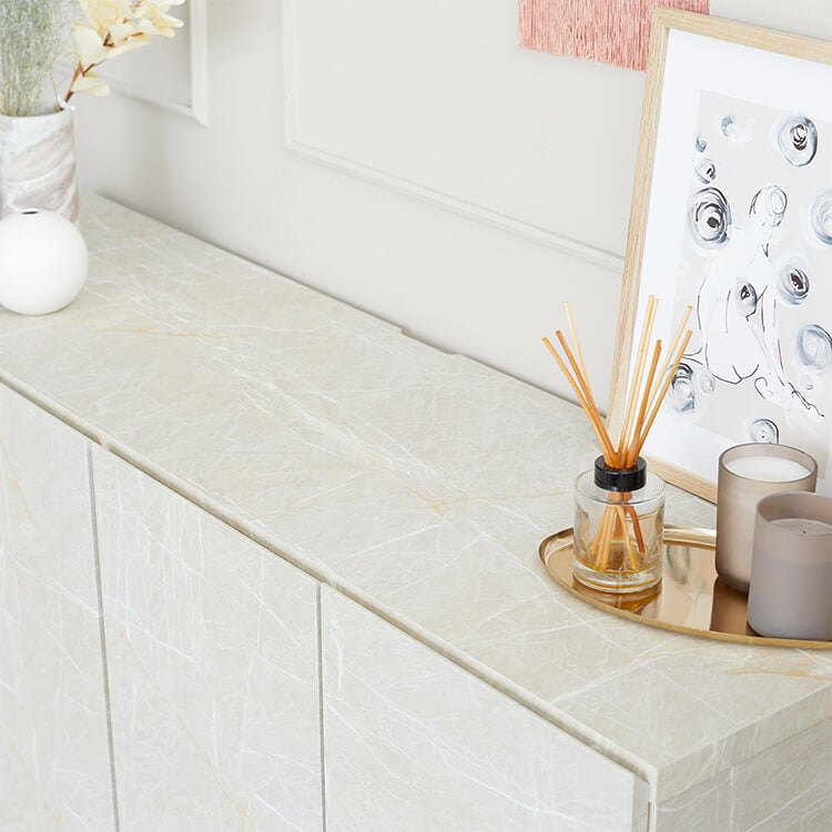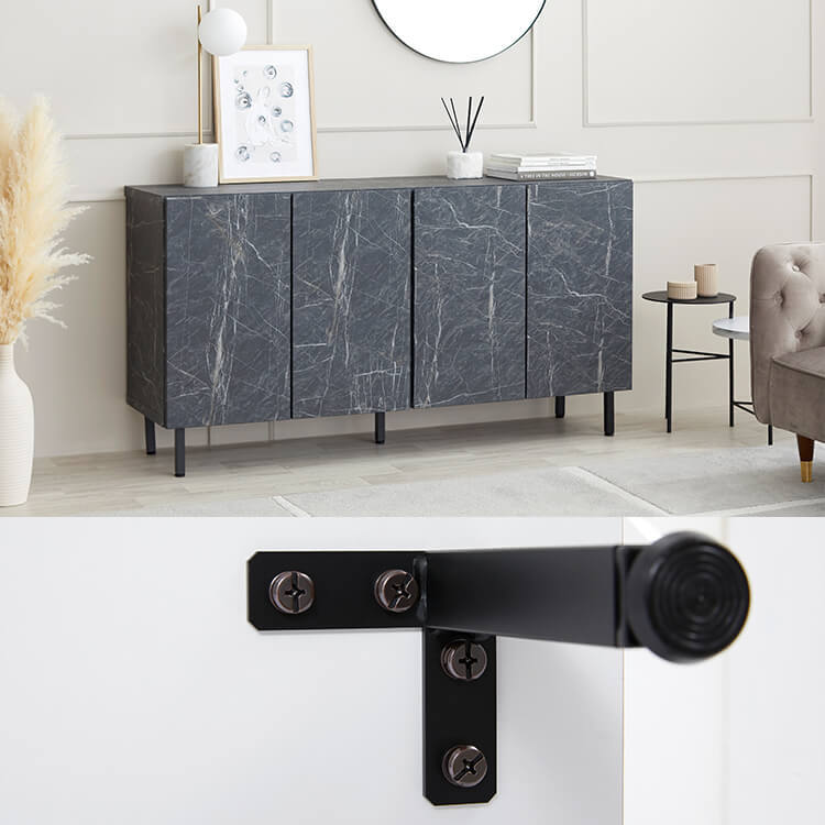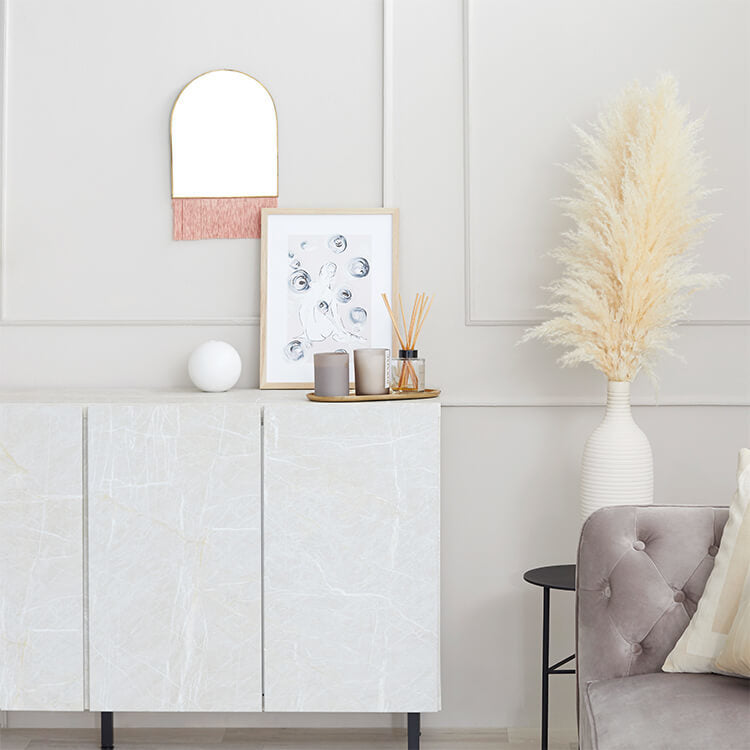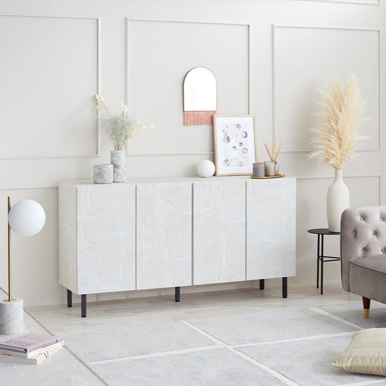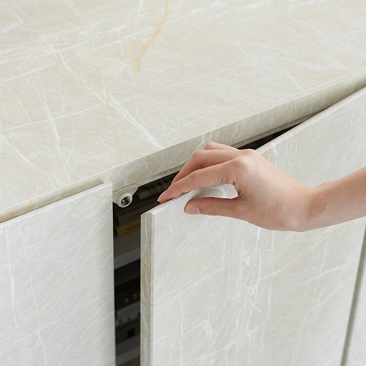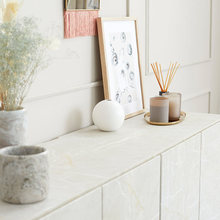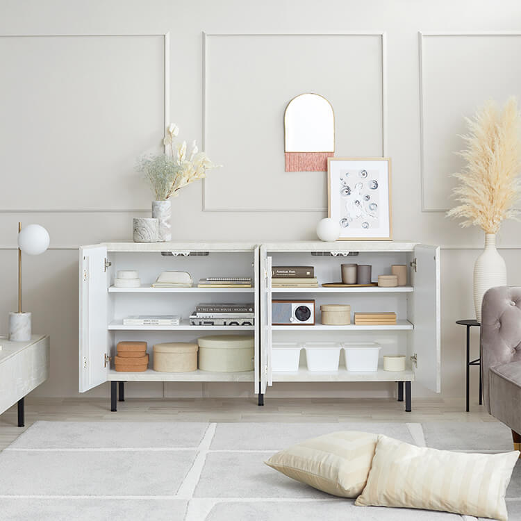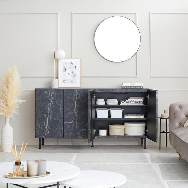 まるで本物の石のような「ストーン調」の素材と、すっきりとしたスチール脚。置くだけでお部屋をたちまちラグジュアリーな空間へと変身させる、ワンランク上のサイドボードが出来ました。美しいストーン柄を遮る取っ手をつけないことで、スタイルを選ばないシンプルなカタチに。インテリア性の高い美しいサイドボードに仕上がりました。シンプルなデザインを保つために、取っ手を無くしたフラットなデザインにこだわりました。扉の上部分を手掛かりにスムーズに開閉できます。高い技術を持つ職人がこだわりを持って作った「ストーン柄」は、まるで本物の石のようなリアルさが魅力の素材。ランダムに入り混じる躍動的な模様と自然を感じさせるカラーは、近くで見ても柄素材だと分からないほどの高いクオリティーです。