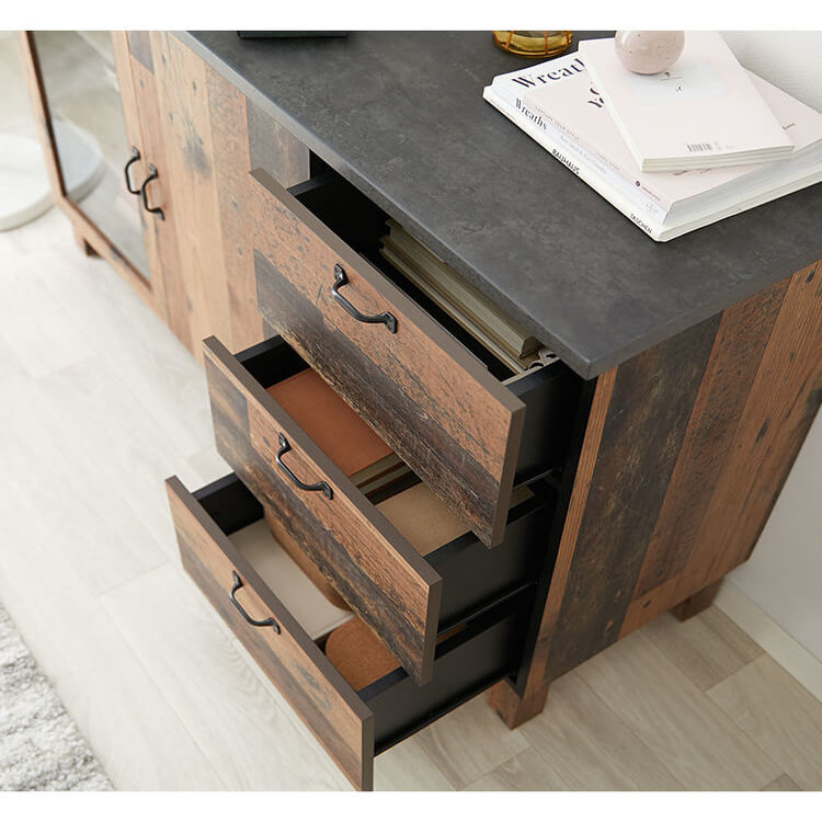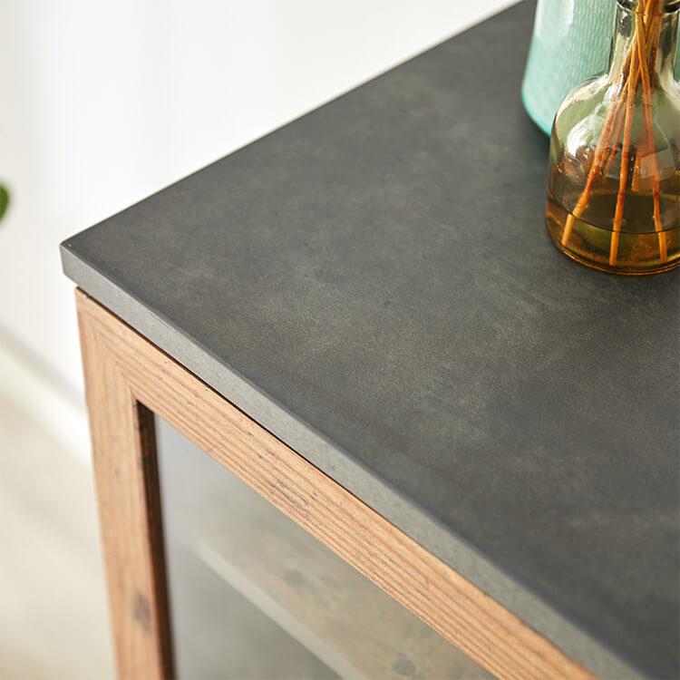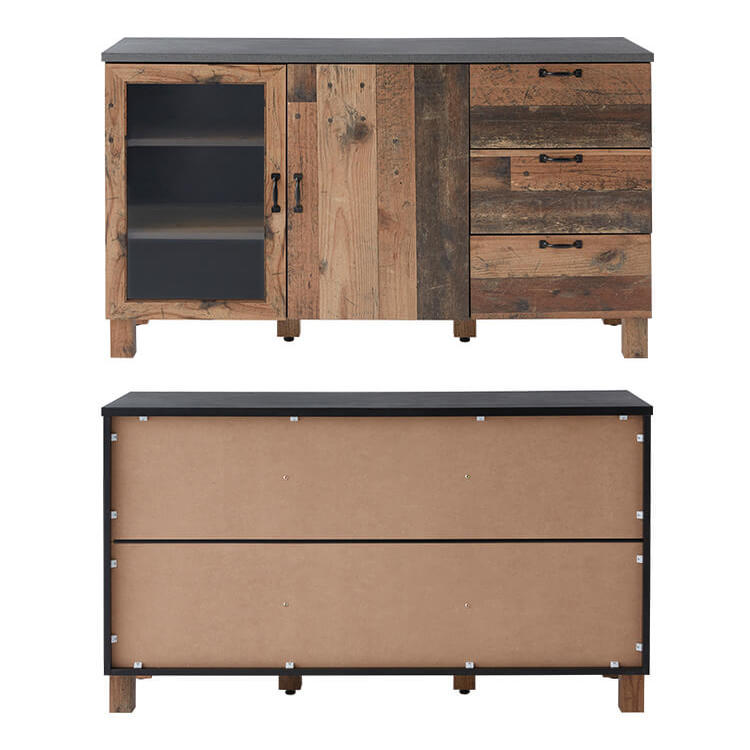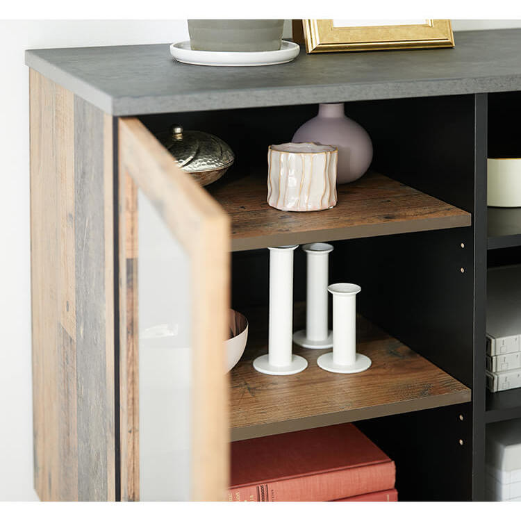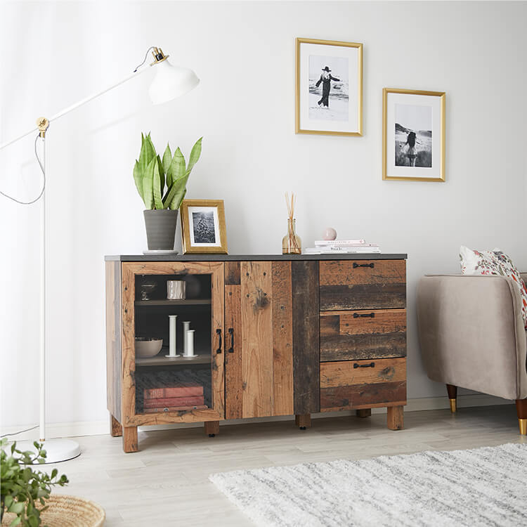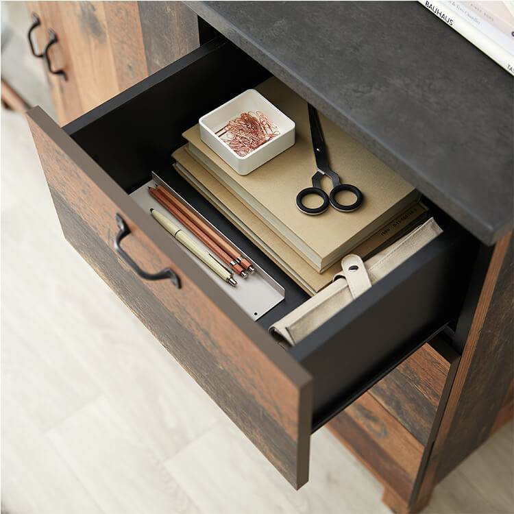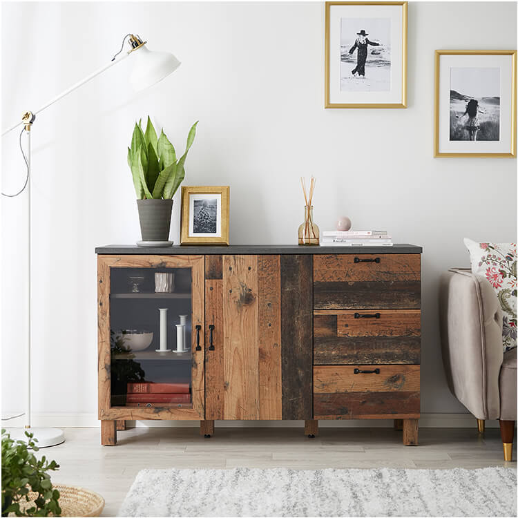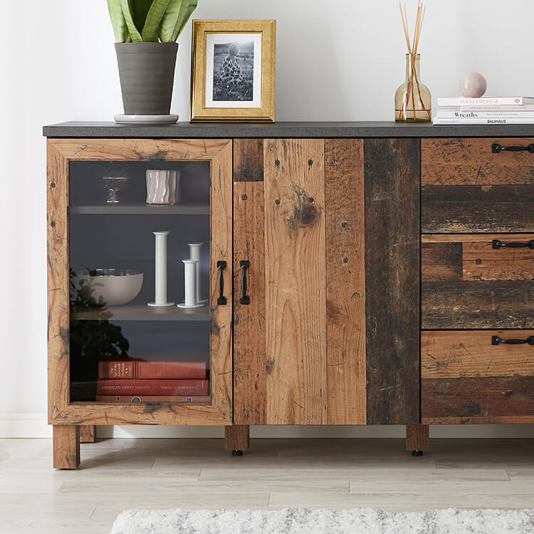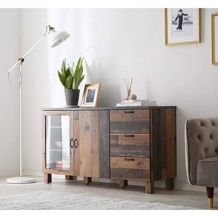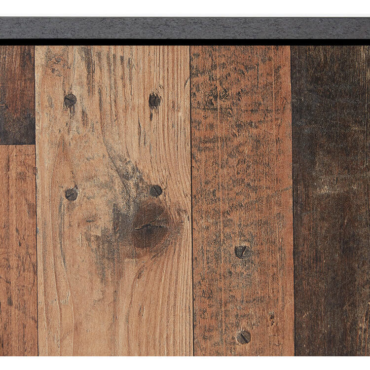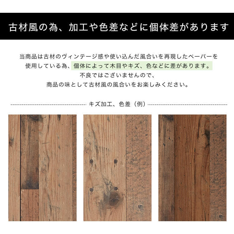 ただのキャビネットじゃつまらない、でも本格的なヴィンテージインテリアは気が引けちゃう・・・。そんな願いを叶えるリアル志向なデザインで、いつものお部屋が「ちょっと自慢したくなる」空間に。大事に使い込まれたからこそあらわれる木の表情って憧れませんか?でも本物のヴィンテージ家具はお手入れなどが気になって気軽に扱えないもの。そんな方にフランクに持ってほしい家具ができました。まるで本物の古材を使用したような木目調と流行りのコンクリート柄を組み合わせた異素材ミックス。ヴィンテージ調の風合いとトレンドを兼ね備えたデザインで、いつもの空間を特別なものに。長い年月を経て着いた味わいのある風合いを丁寧に再現した木目調です。そのため濃淡や節などの表情が一つ一つ異なっており、すべてオンリーワンの木目となっています。商品の個性として風合いをお楽しみください。