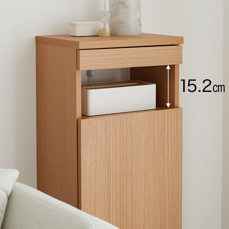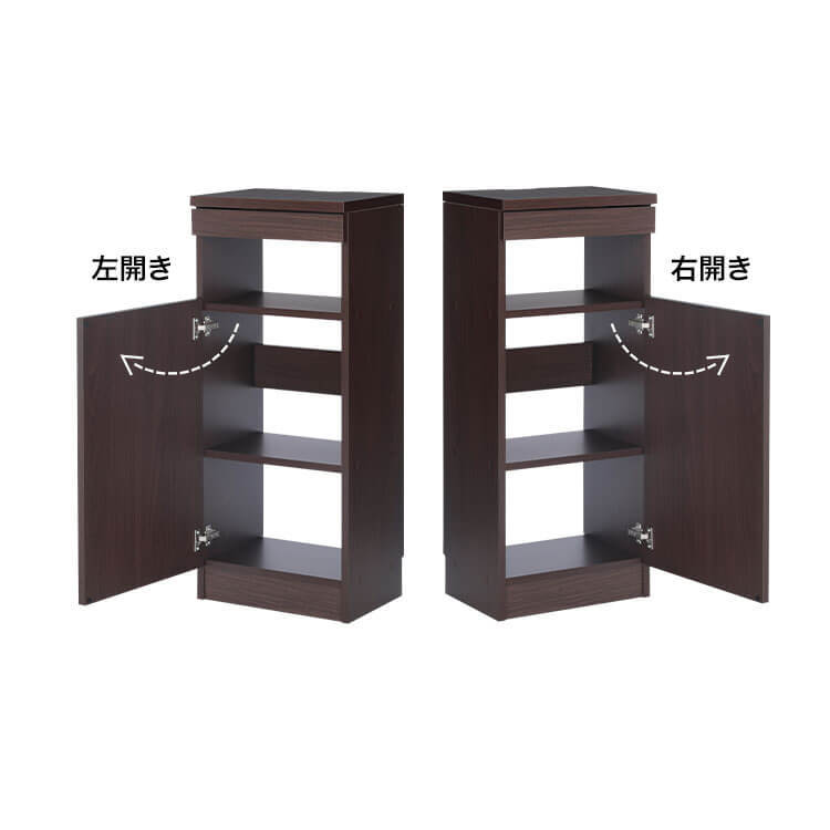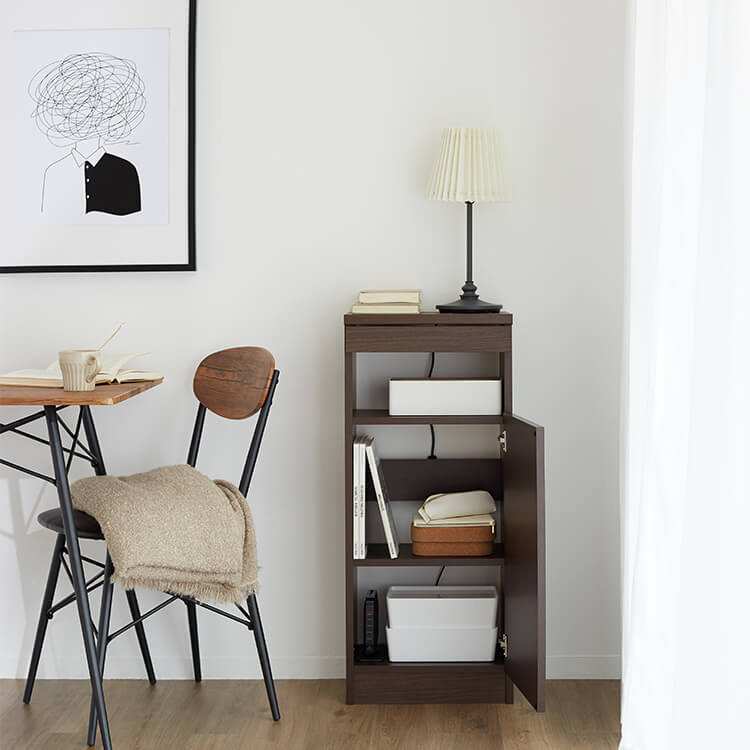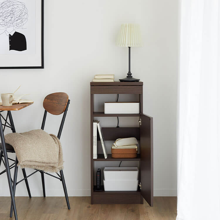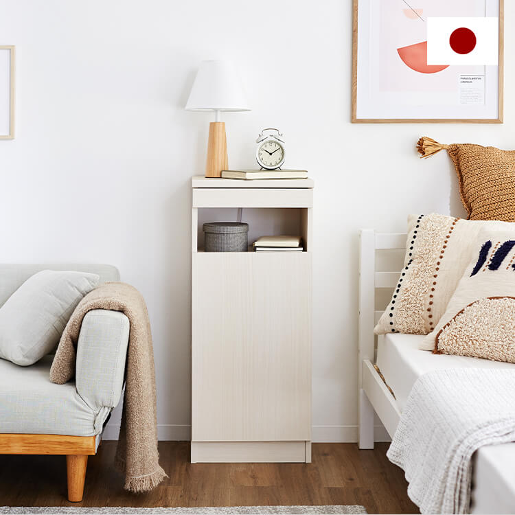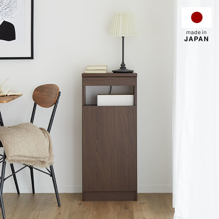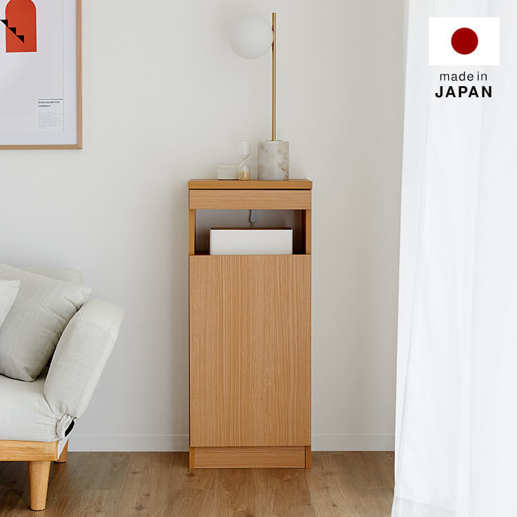 左右対称のデザインが美しい、国産のコンパクトキャビネット。FAXやモデムなどの電気機器から雑誌、雑貨などのあらゆる物を木目調のシンプルデザインですっきりと片付けます。場所を取りすぎないのにしっかり収納できる。そんな文字通りスマートなキャビネットの幅は40cmとコンパクト設計になっているので、ワンルームにもおすすめです。厚みのある板の重さを軽減し、持ち運びや組み立てがしやすい「フラッシュ加工」を採用。無垢材と違い、湿度や温度によっても反りの影響が出にくいのも特徴の一つです。熟練の家具職人が、一つ一つ丁寧に真心込めて作り上げました。安価な輸入品とは違い、日本製ならではの匠のプライドと情熱を詰め込んだ完成度の高い一品です。日本製をお求めやすく提供するため、「お客様組み立て式」でお届けします。