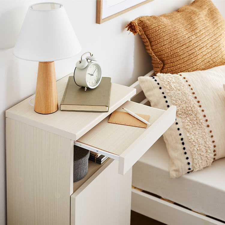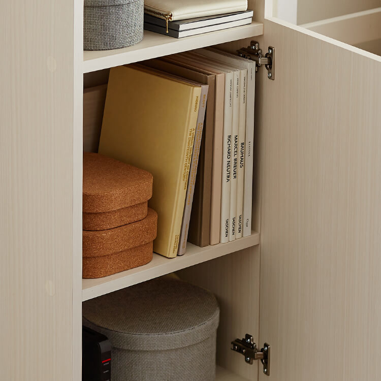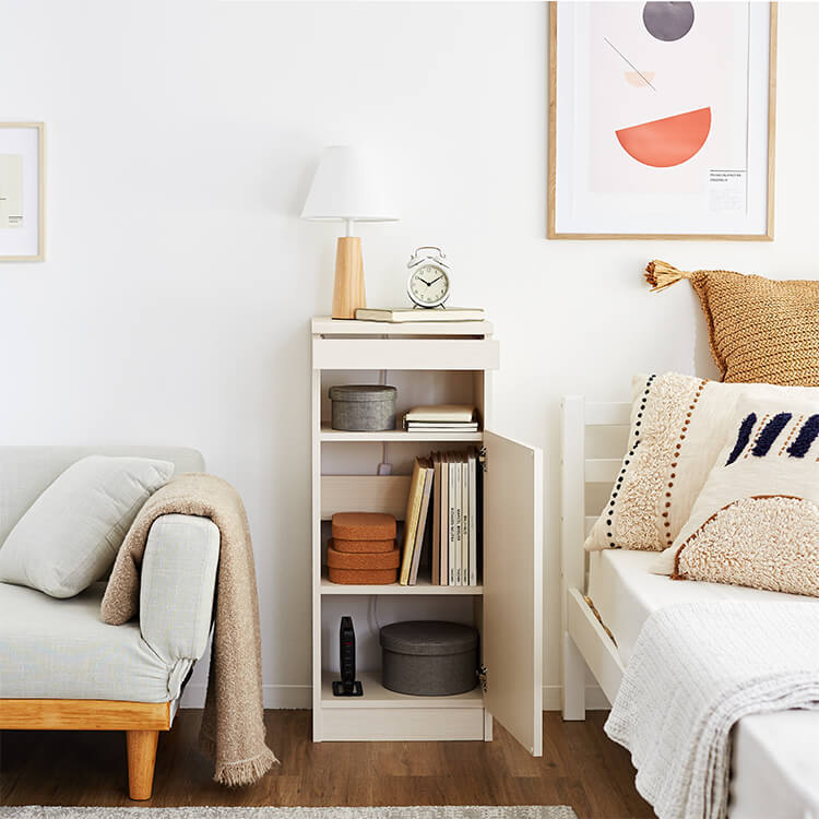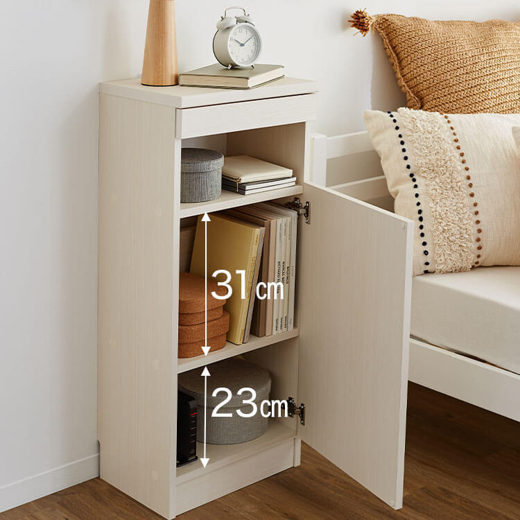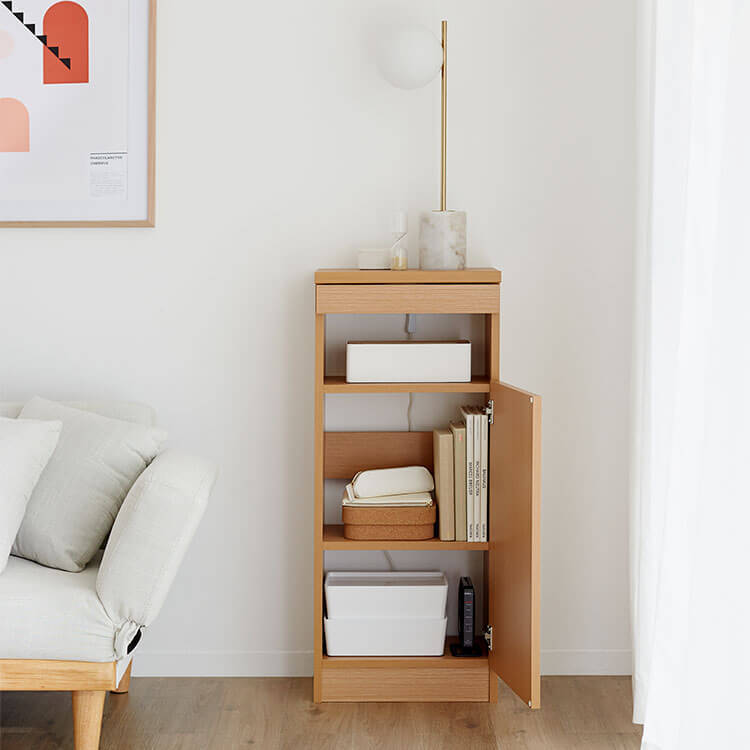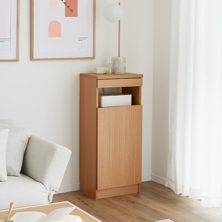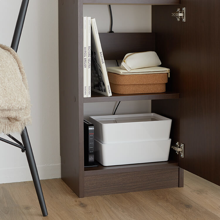 左右対称のデザインが美しい、国産のコンパクトキャビネット。FAXやモデムなどの電気機器から雑誌、雑貨などのあらゆる物を木目調のシンプルデザインですっきりと片付けます。場所を取りすぎないのにしっかり収納できる。そんな文字通りスマートなキャビネットの幅は40cmとコンパクト設計になっているので、ワンルームにもおすすめです。厚みのある板の重さを軽減し、持ち運びや組み立てがしやすい「フラッシュ加工」を採用。無垢材と違い、湿度や温度によっても反りの影響が出にくいのも特徴の一つです。熟練の家具職人が、一つ一つ丁寧に真心込めて作り上げました。安価な輸入品とは違い、日本製ならではの匠のプライドと情熱を詰め込んだ完成度の高い一品です。日本製をお求めやすく提供するため、「お客様組み立て式」でお届けします。