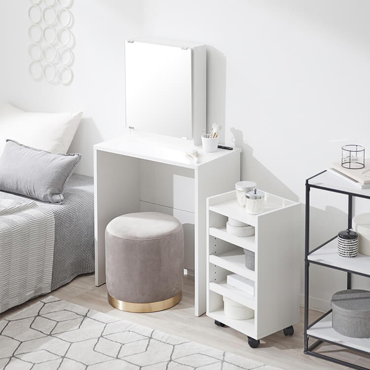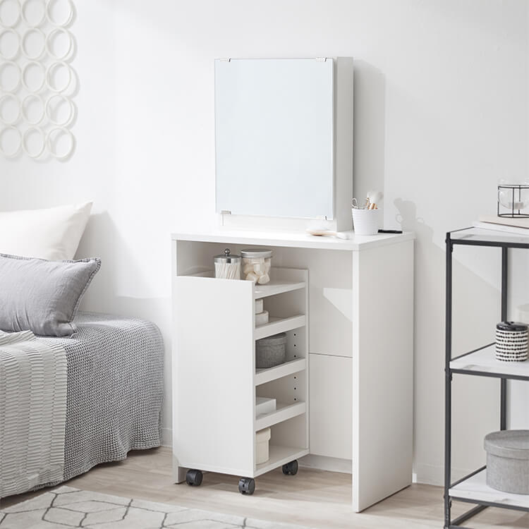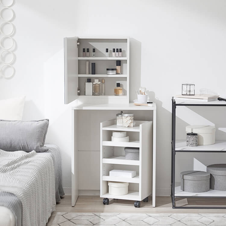 ついつい増えてごちゃつきがちなコスメ。便利で機能的な収納が付いた美しいドレッサーが生活感をすっきりと隠し、洗練されたメイクスペースを作ります。ミラーと収納を合体させることで、無駄のないスマートなデザインに。更に自由に動かせるワゴン収納付きで、あらゆるメイク道具がすっきり片付きます。