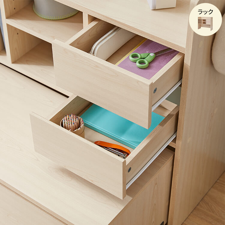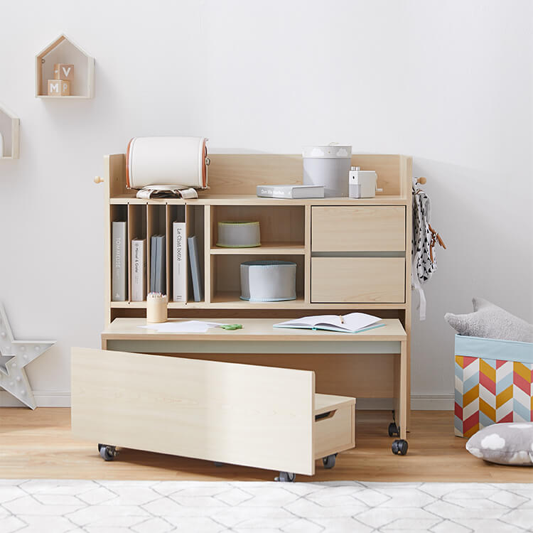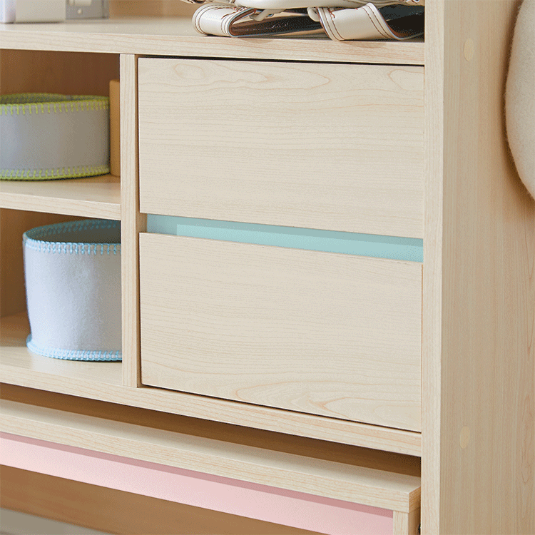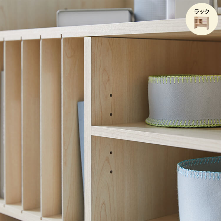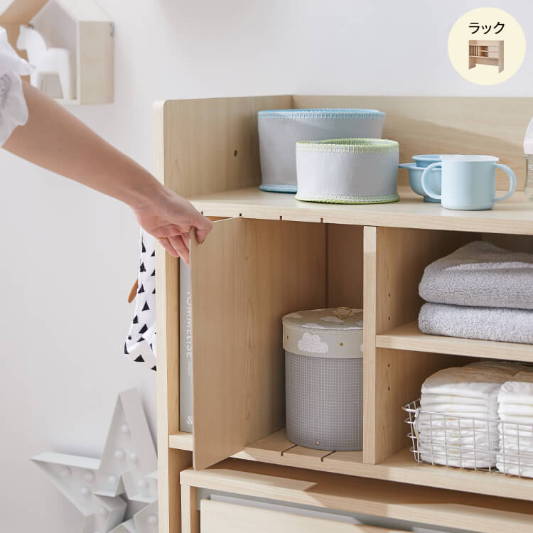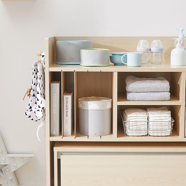 お子様の成長に合わせて様々な使い方ができる、成長ラック3点セット。長く使うからこそ、飽きのこないデザインと機能性にこだわりました。成長に合わせて使えるよう「長く使えるラック」を目指して作りました。赤ちゃんの時から成長するに従って、使う用途も違ってきます。そこで「その時に合わせた使い方」ができるデザインをカタチにしました。かさばりがちなおむつ類や赤ちゃんの身の回りグッズを収納するのにピッタリな収納として活躍。このラックがあれば、必要なアイテムがすっきりと片付いてすっきりとしたベビー空間に。