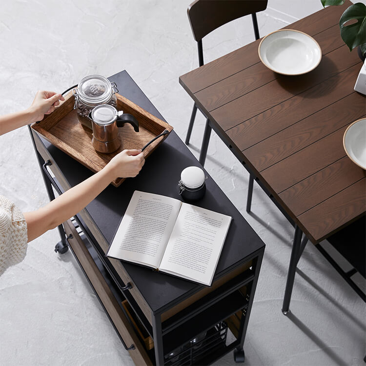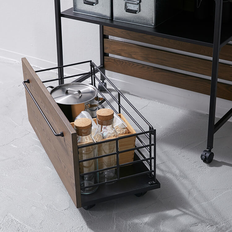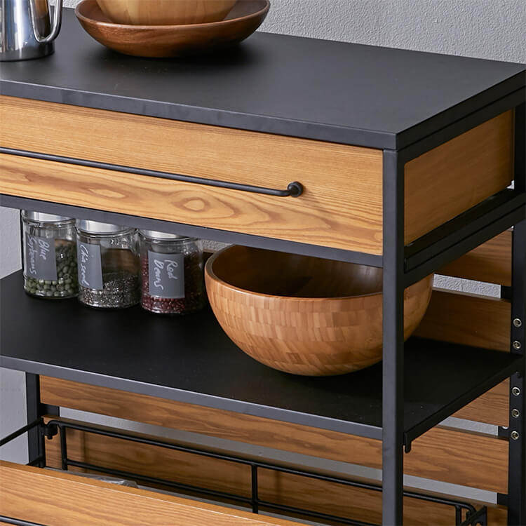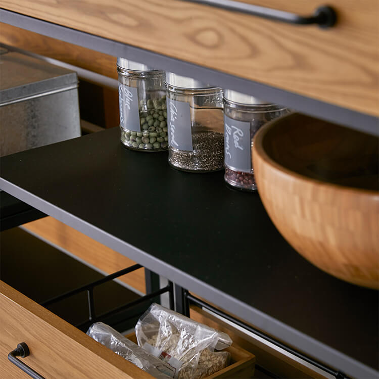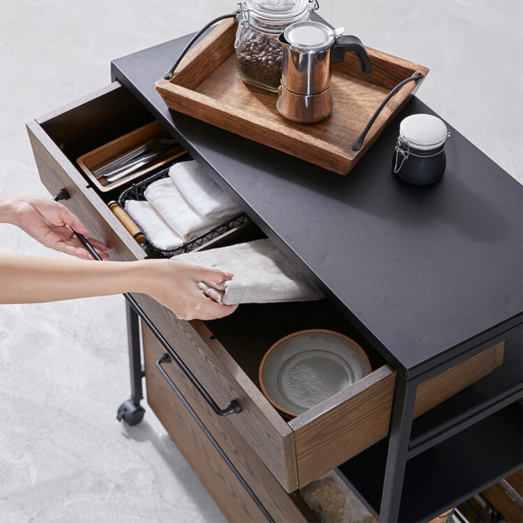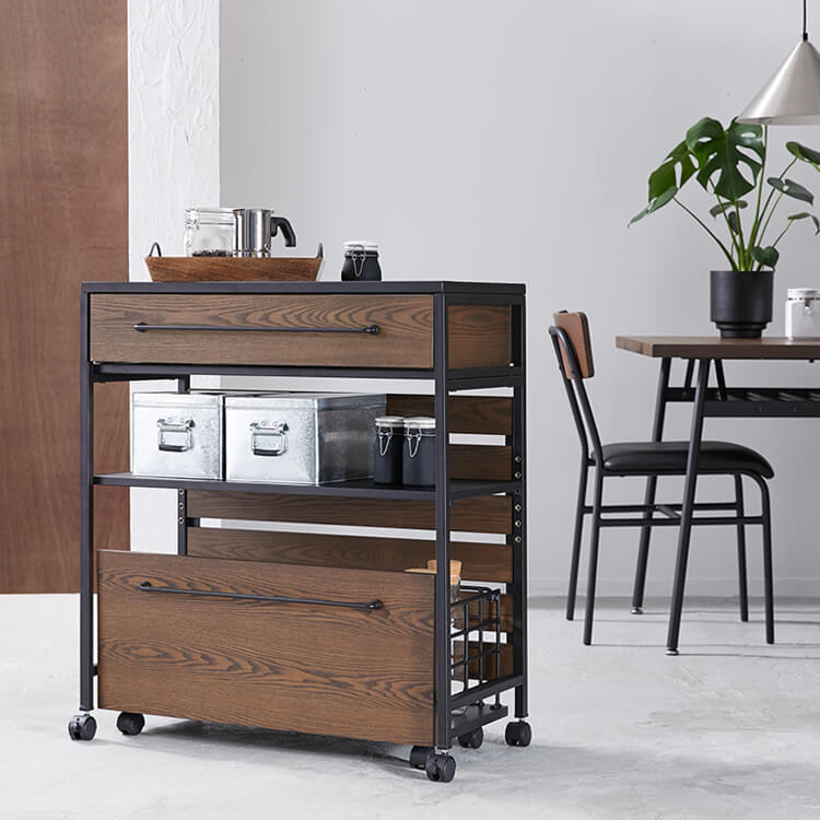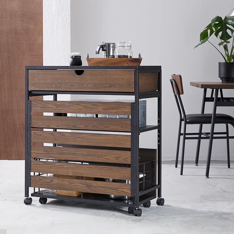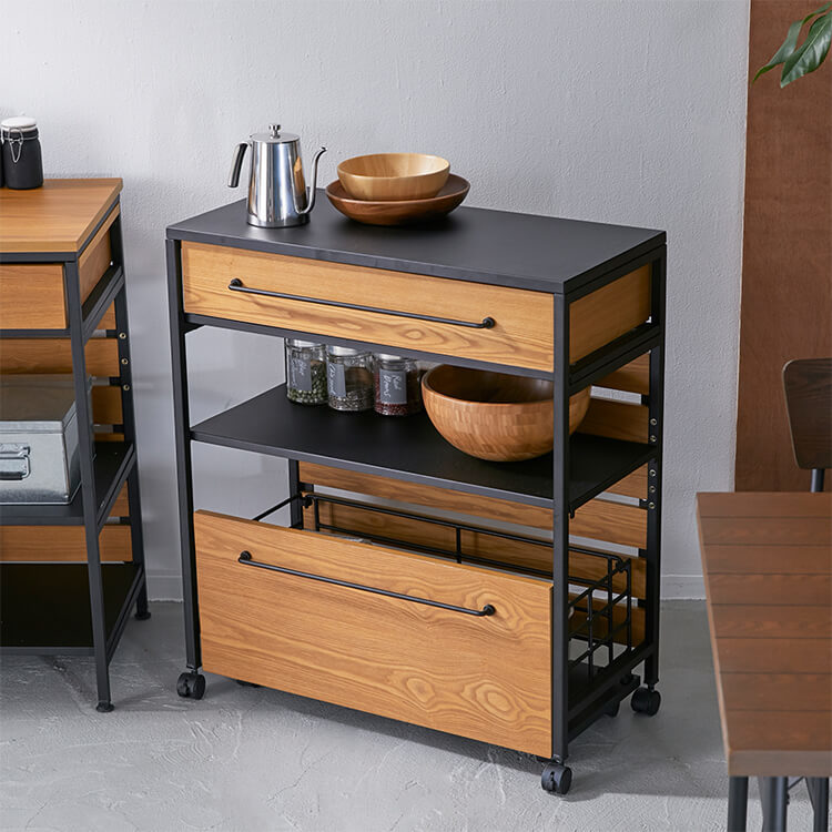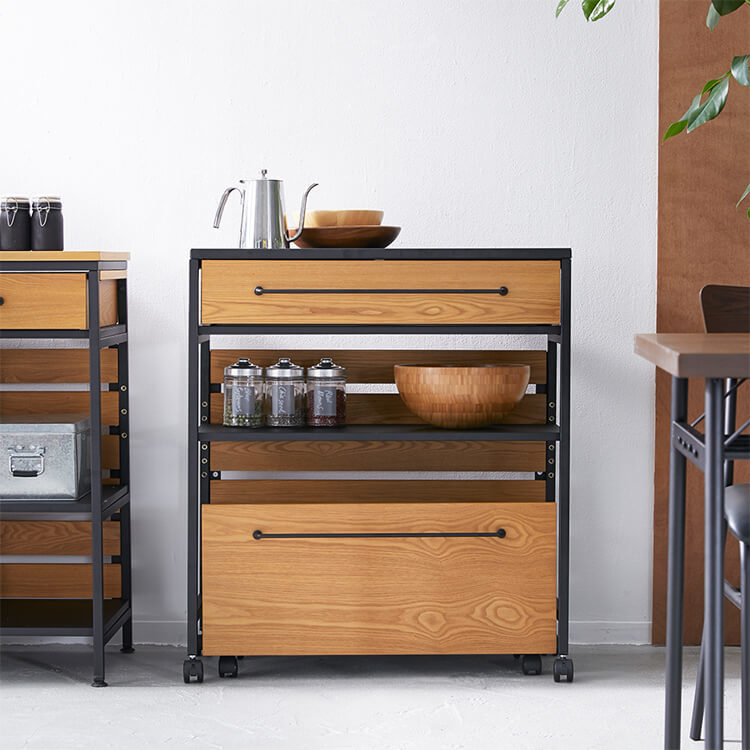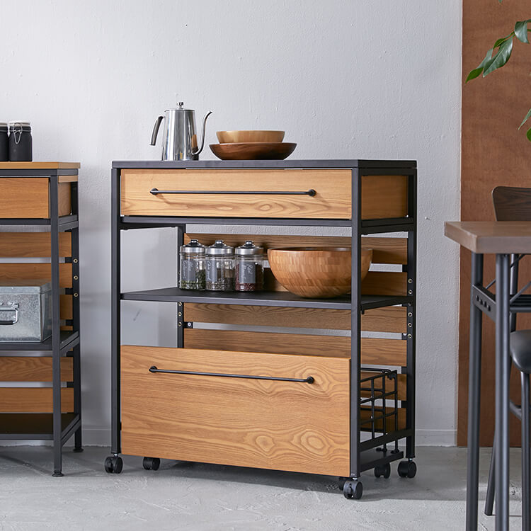 好きな場所で料理がはかどる、ゆったりスペースのキャスター付きキッチンワゴン。異素材MIXで、対面でも使えるスタイリッシュな外見と、移動ができる使い勝手のよい収納力が魅力のヴィンテージシリーズです。毎日触れるインテリアにこだわりを。自然の木目と絶妙な異素材が生み出すこなれたムードは、他のインテリアでは、なかなか真似できません。安価な化粧紙を貼っただけのプリント化粧板とは違い、天然木の突板を贅沢に使用しているため高級感が違います。使用したのは大柄で繊細な木目が人気のタモ材。1点1点木目や風合いが異なり、木本来のあたたかみある風合いや重厚感を存分に堪能できます。