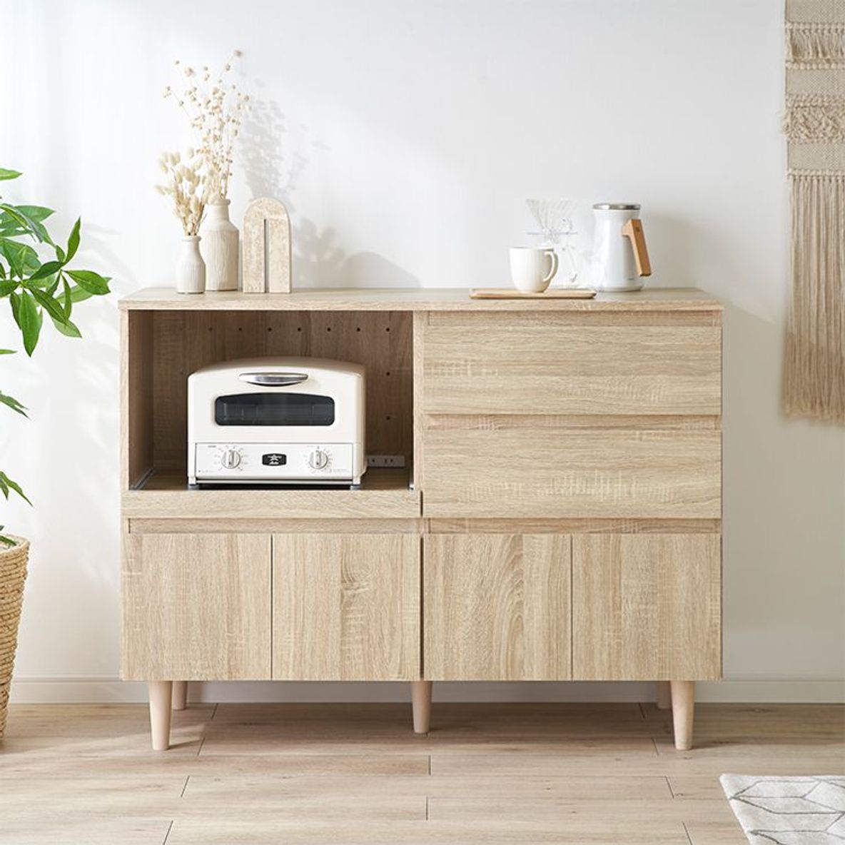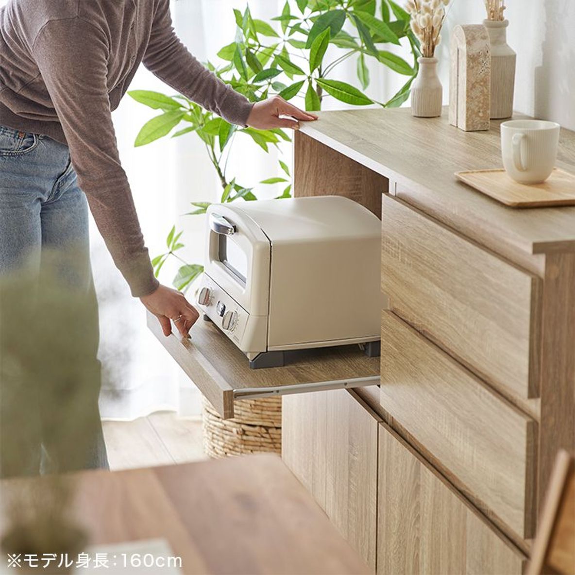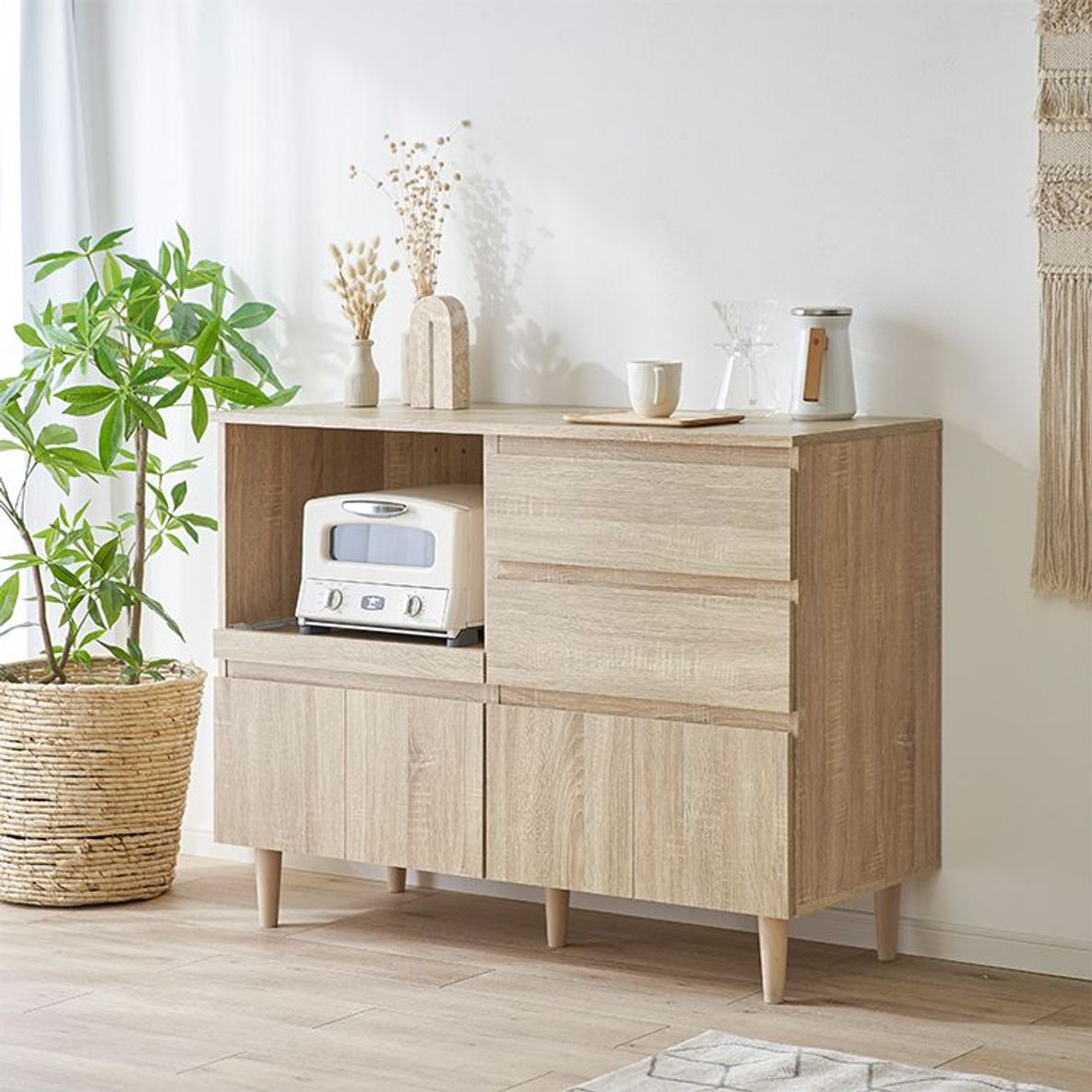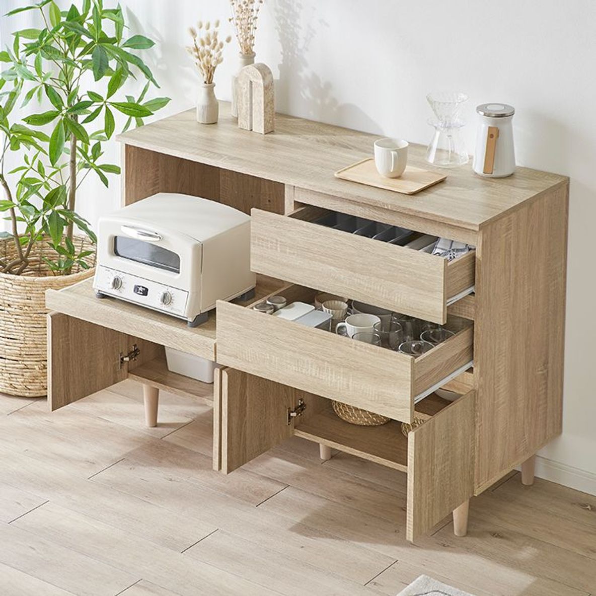 おしゃれな見た目はもちろん、機能だって収納力だって何一つ譲れない。そんな欲ばりさんにオススメしたい「デザイン・機能・収納力」の全てが詰まったキッチン収納です。選べるタイプが人気のキッチン収納をワイドタイプに!2タイプの商品の長所を凝縮して、いいとこどりしました!こちらは当社デザイナーが独自のこだわりをもって完成させたオリジナル商品です。キッチンやリビング、一人暮らしのお部屋でも使いやすいデザインを目指しました!キッチン家電を置くのに便利なスライド収納に、食器やキッチンツールなど細々したものをスッキリとまとめられる収納棚が加わり、キッチンに溢れる様々なものをスッキリとまとめられます。