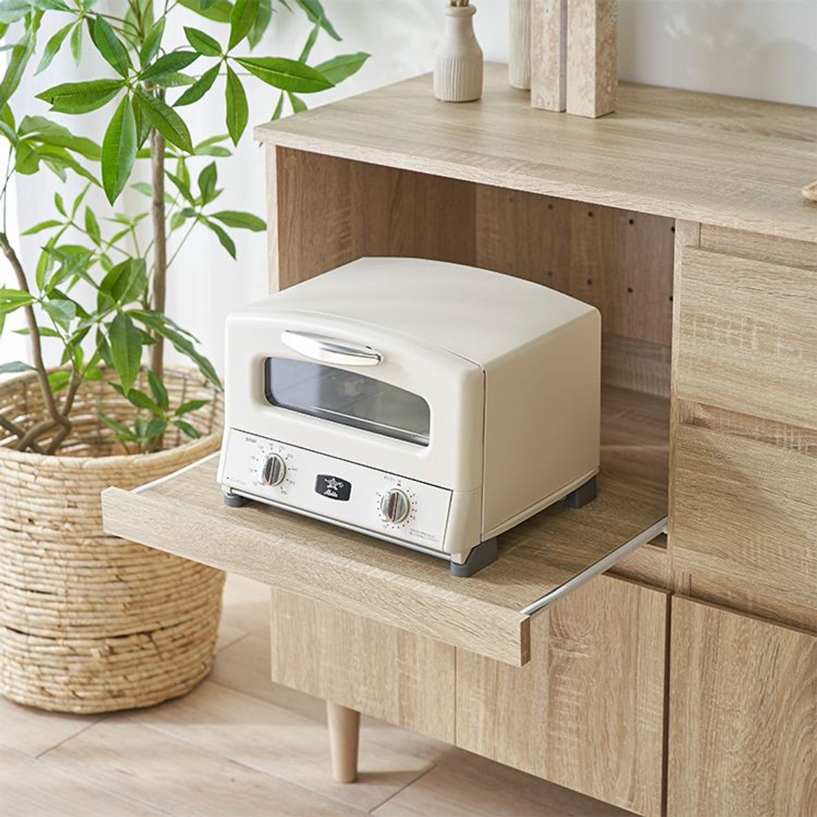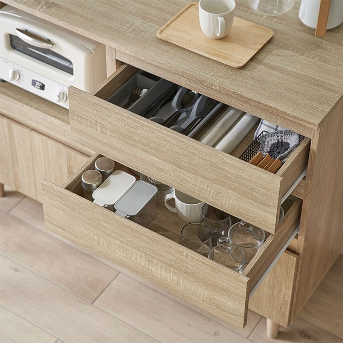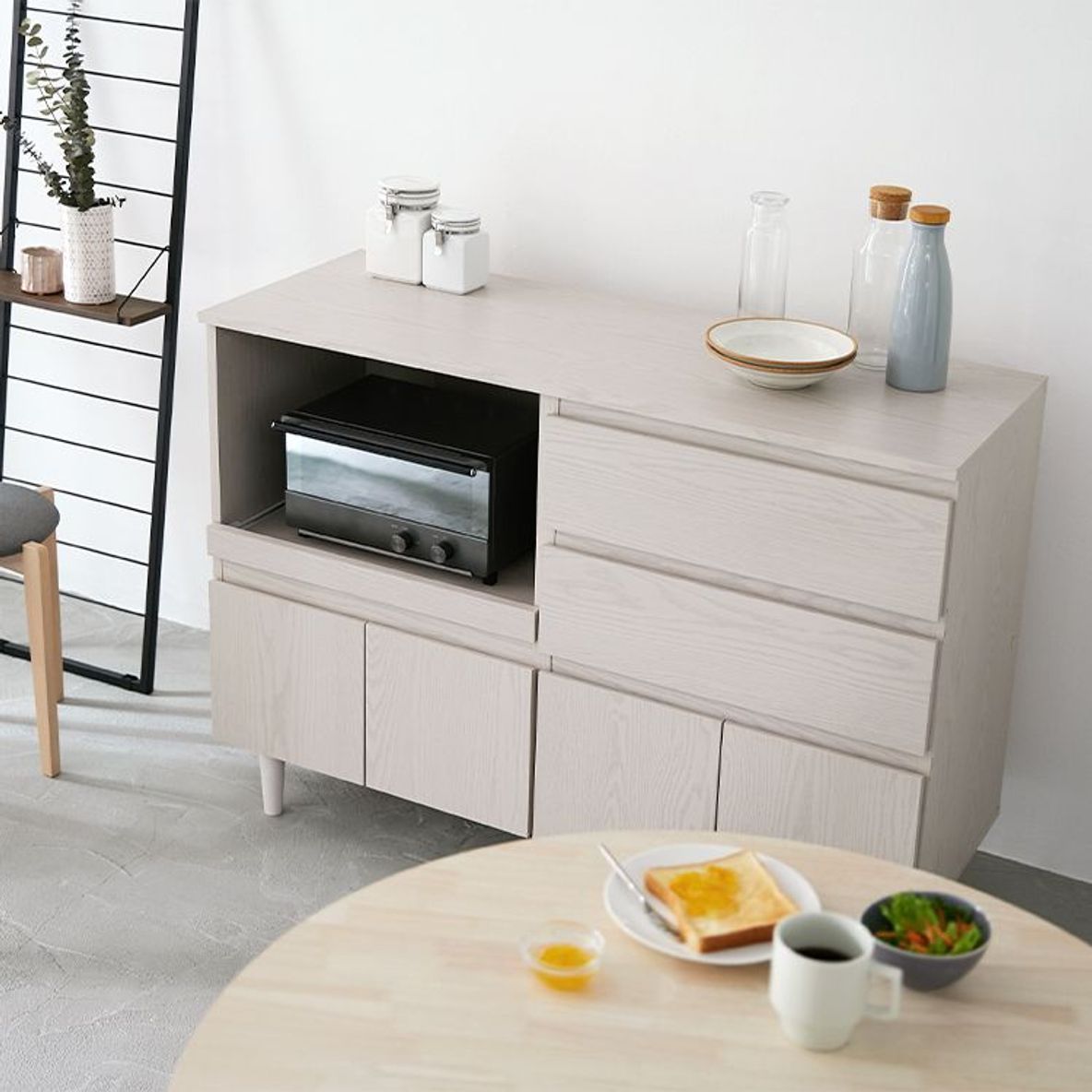 おしゃれな見た目はもちろん、機能だって収納力だって何一つ譲れない。そんな欲ばりさんにオススメしたい「デザイン・機能・収納力」の全てが詰まったキッチン収納です。選べるタイプが人気のキッチン収納をワイドタイプに!2タイプの商品の長所を凝縮して、いいとこどりしました!こちらは当社デザイナーが独自のこだわりをもって完成させたオリジナル商品です。キッチンやリビング、一人暮らしのお部屋でも使いやすいデザインを目指しました!キッチン家電を置くのに便利なスライド収納に、食器やキッチンツールなど細々したものをスッキリとまとめられる収納棚が加わり、キッチンに溢れる様々なものをスッキリとまとめられます。