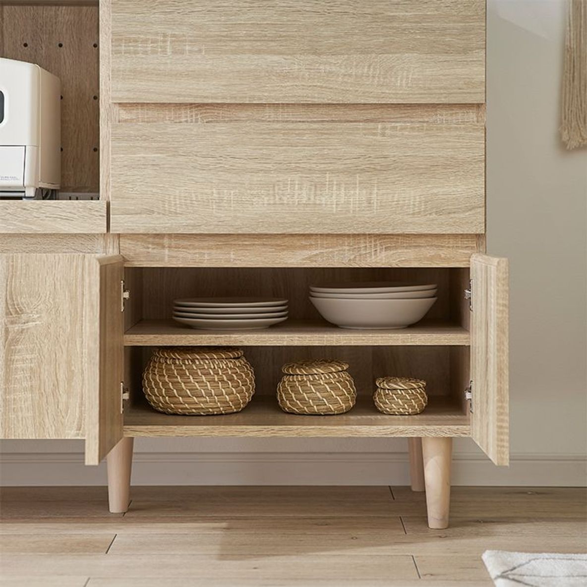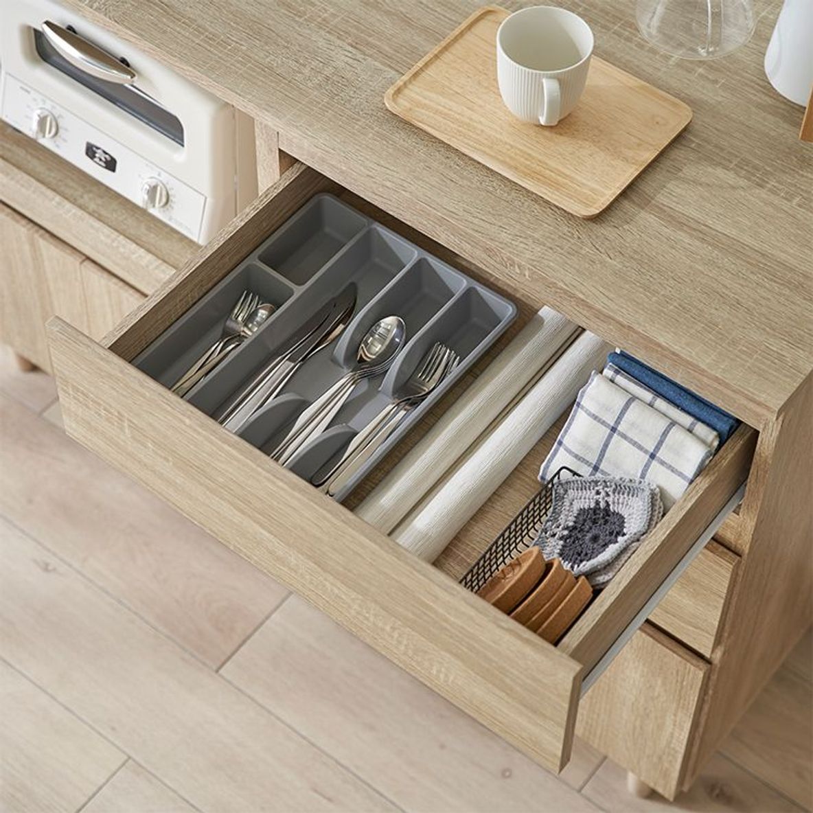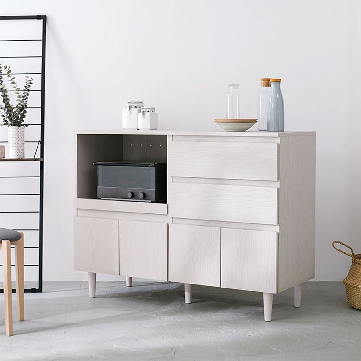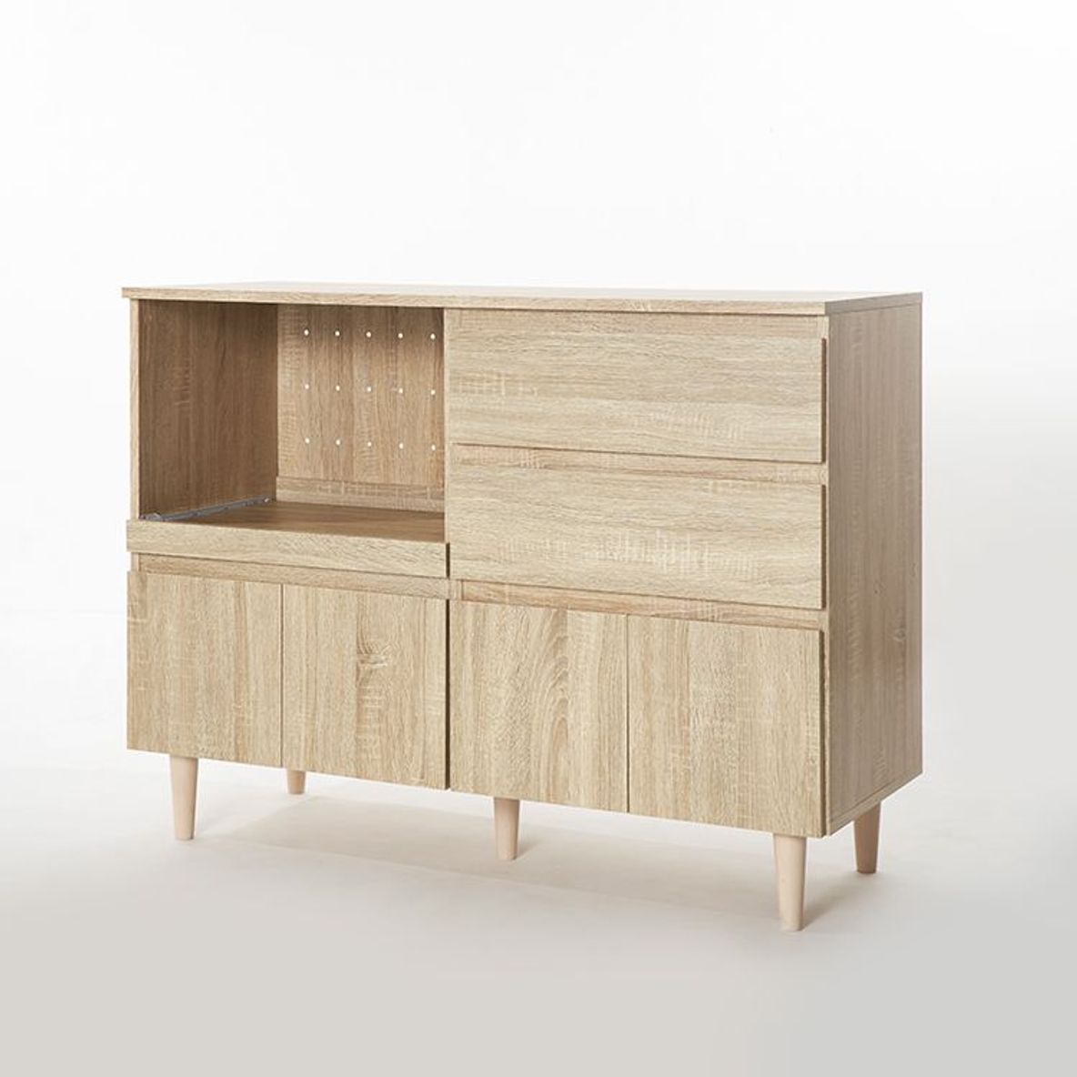 おしゃれな見た目はもちろん、機能だって収納力だって何一つ譲れない。そんな欲ばりさんにオススメしたい「デザイン・機能・収納力」の全てが詰まったキッチン収納です。選べるタイプが人気のキッチン収納をワイドタイプに!2タイプの商品の長所を凝縮して、いいとこどりしました!こちらは当社デザイナーが独自のこだわりをもって完成させたオリジナル商品です。キッチンやリビング、一人暮らしのお部屋でも使いやすいデザインを目指しました!キッチン家電を置くのに便利なスライド収納に、食器やキッチンツールなど細々したものをスッキリとまとめられる収納棚が加わり、キッチンに溢れる様々なものをスッキリとまとめられます。