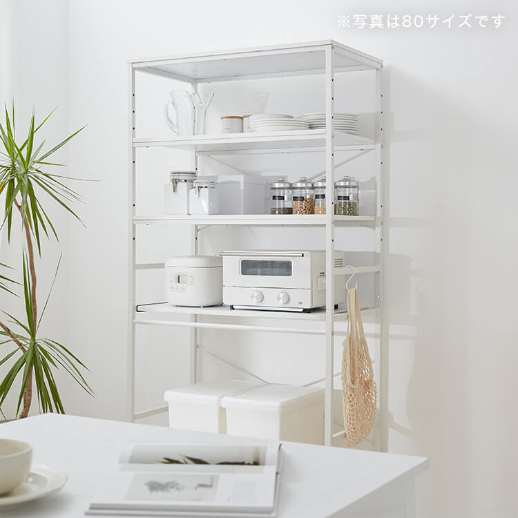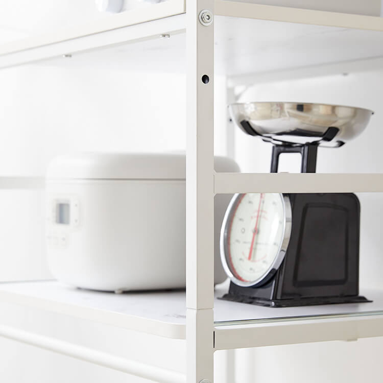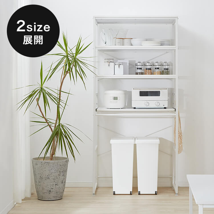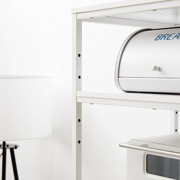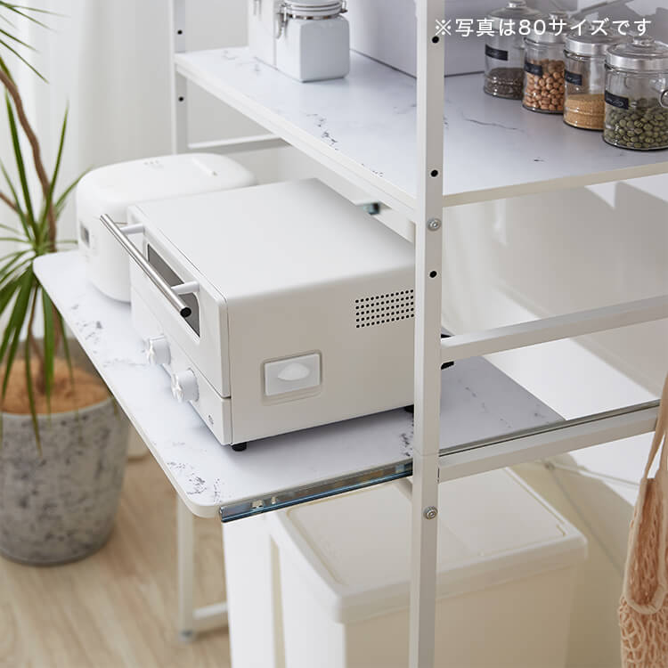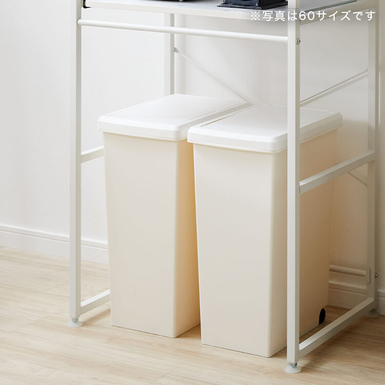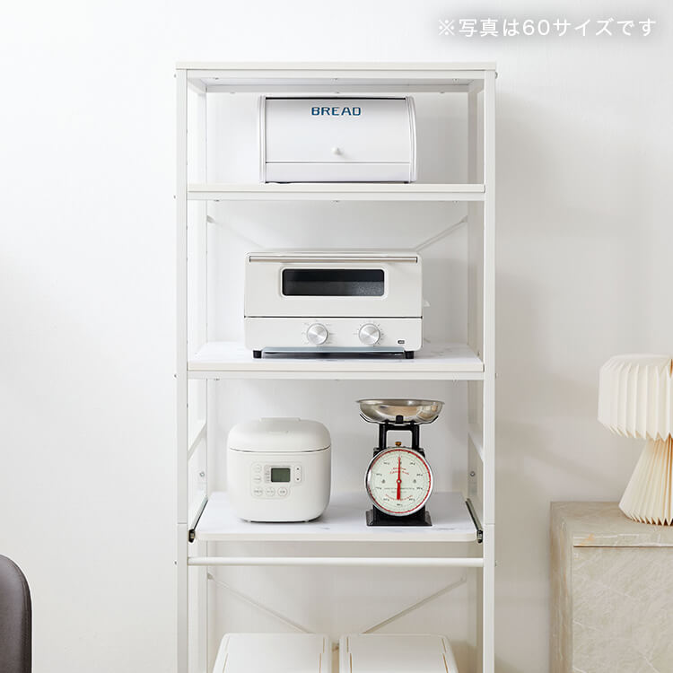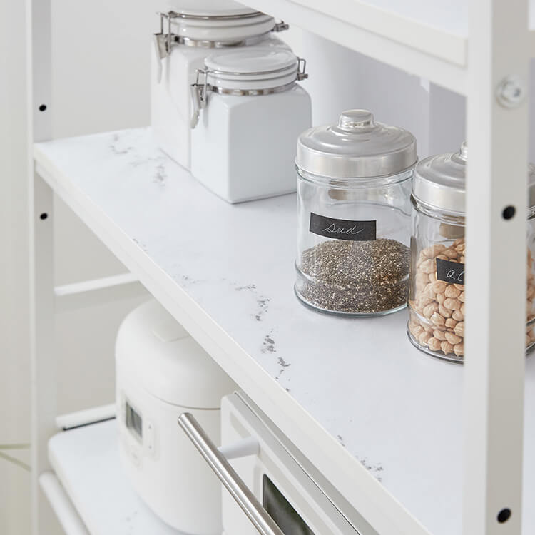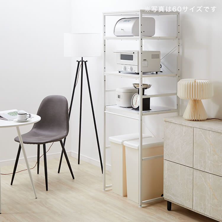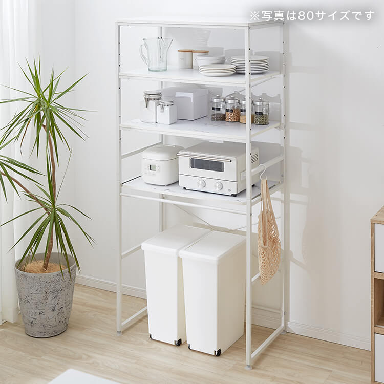 空いてしまいがちなダストボックスの上のスペースも、有効活用できるキッチンラック。限られたスペースを無駄なく使え、すっきりと片付いたおしゃれなキッチンスペースを作ります。憧れの海外風インテリアのような、大理石柄の棚板と細いスチール脚の組み合わせ。シンプルで洗練された美しいデザインがキッチンをより理想の空間へと導きます。横幅は収納力をキープしつつも、スペースをとりすぎない2サイズをご用意。1人暮らしでもファミリーでもお使いいただける賢いサイズ感です。物が片付くだけでなく、気になる隙間もカバーでき、スッキリとしたキッチンに!ダストボックスの上にできがちなもったいないスペース。この収納が使っていなかった空間の使い方を変え、お使いのキッチンスペースの可能性を広げます。ゆとりある高さ設計や、使い勝手を考えた機能が付いています。