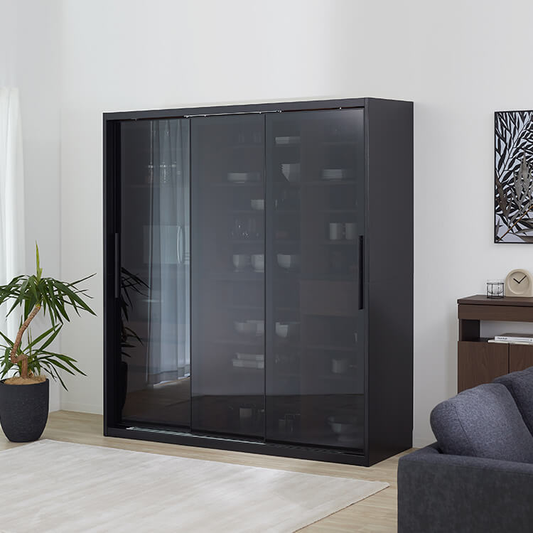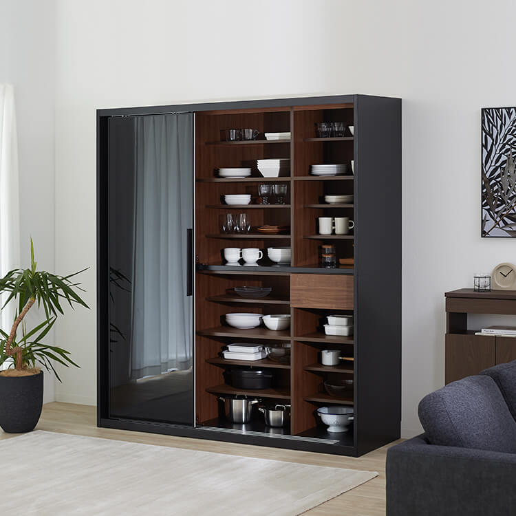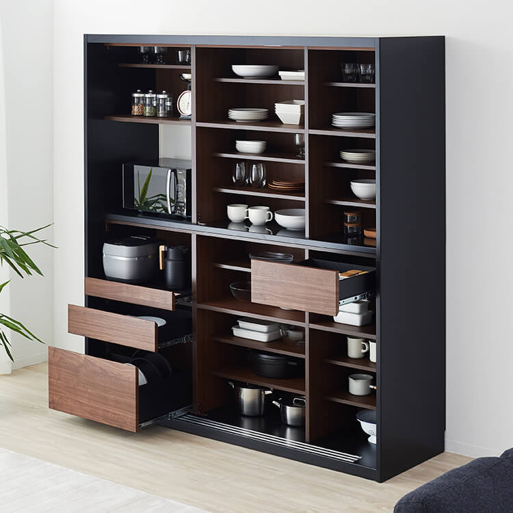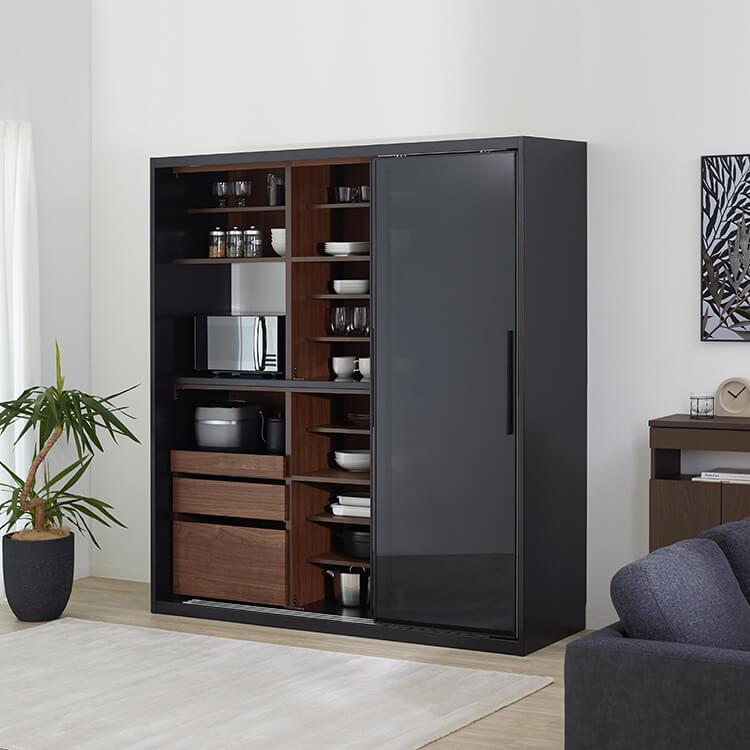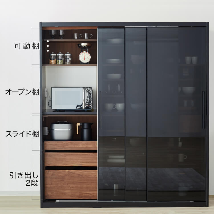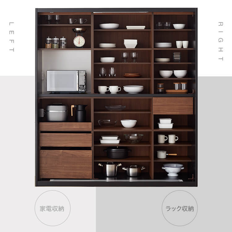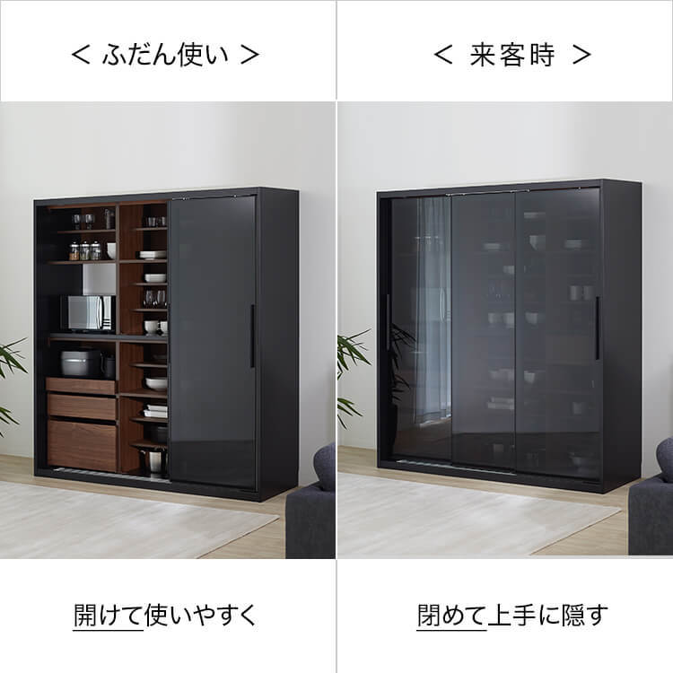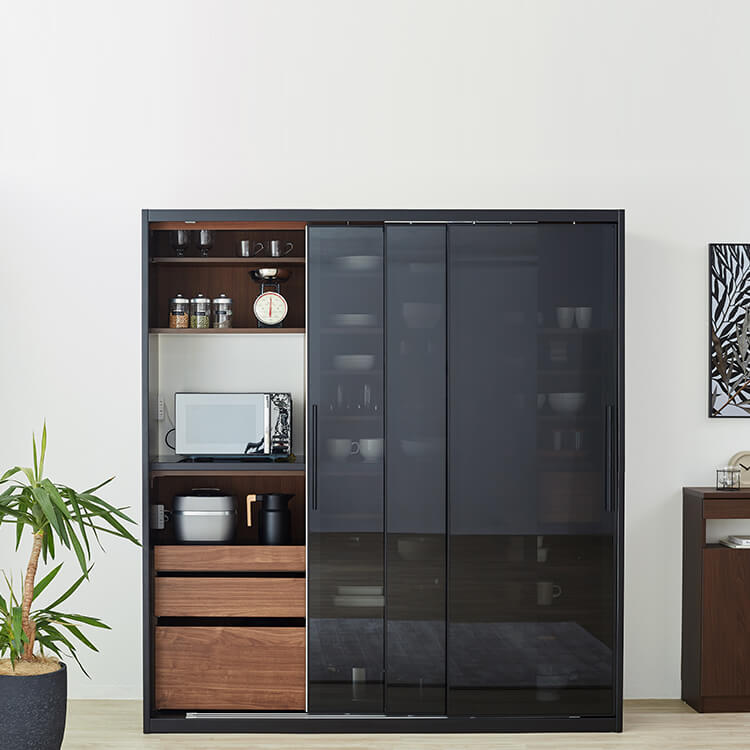 「幅180cmキッチン収納は、オーダーメイドになる…。」「もっと手軽に買えたら…。」そんなお客様のお声からできたのが、このキッチン収納。欲しかった幅180cmがオーダーメイドでなくても手に入ります。よくある幅160cmのキッチン収納よりも、さらに幅が20cm大きい幅180cmは、キッチンに無駄なスペースをつくることなく置けるサイズです。約幅180cmだからできる大量の収納力で、ごちゃつくキッチン周りをスッキリと美しく整頓。使い勝手のよいスモークガラスの3連引き戸がさらりとスタイリッシュに生活感を隠します。キッチン家電がまとまる家電収納と、食器類やストック品がまとまるラック収納。2タイプの収納を一つにすることで、使い勝手のいいキッチン収納に仕上がりました。
