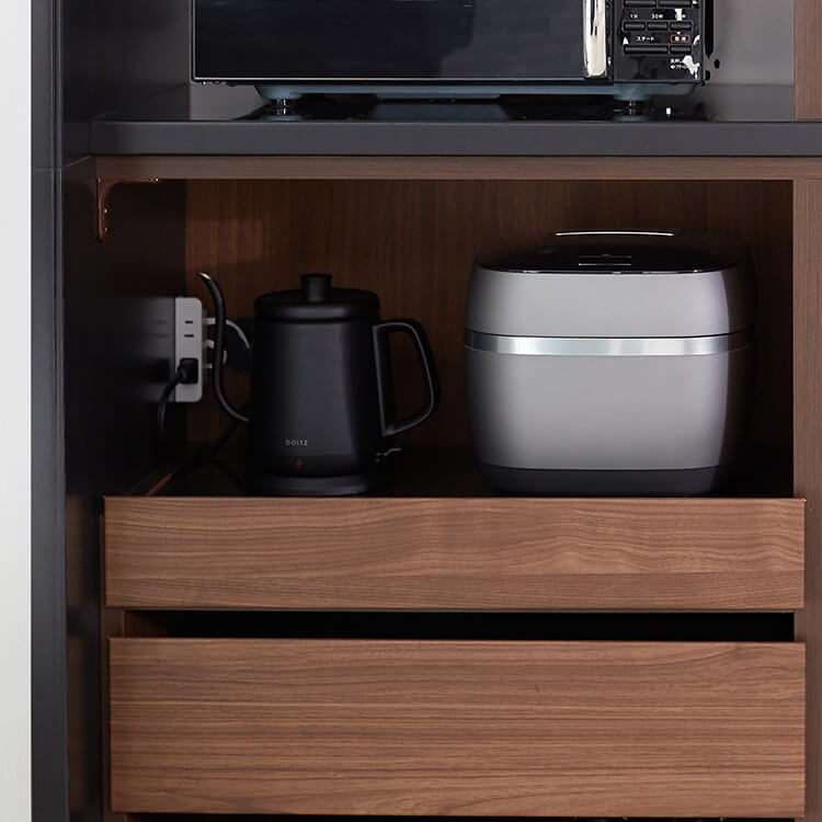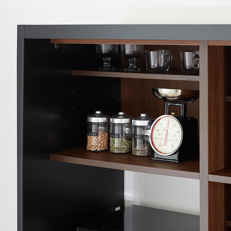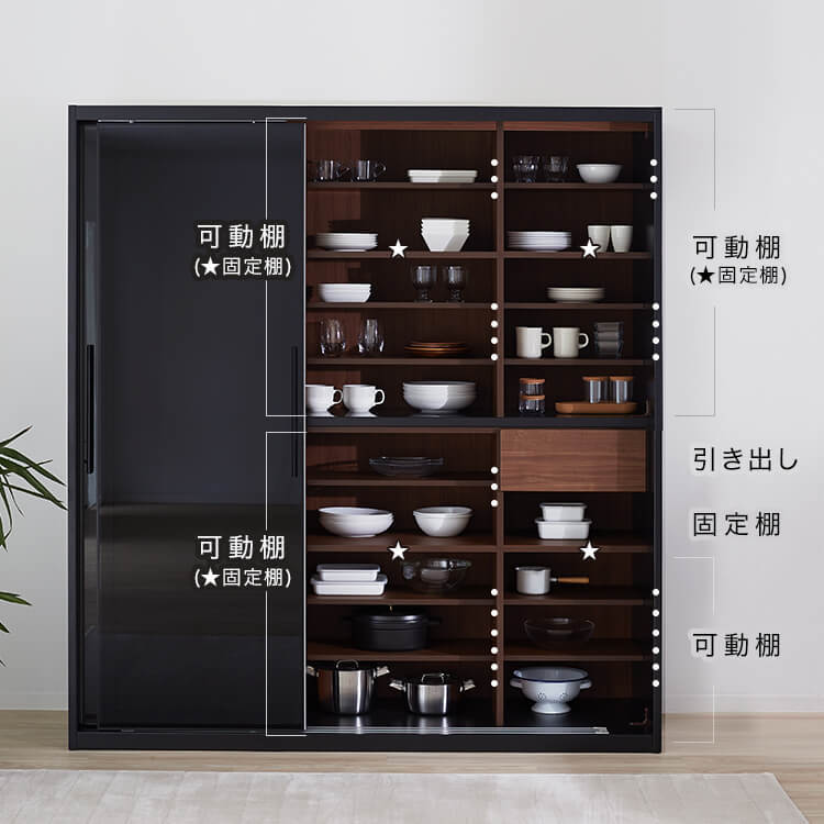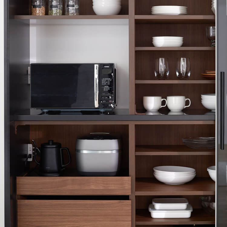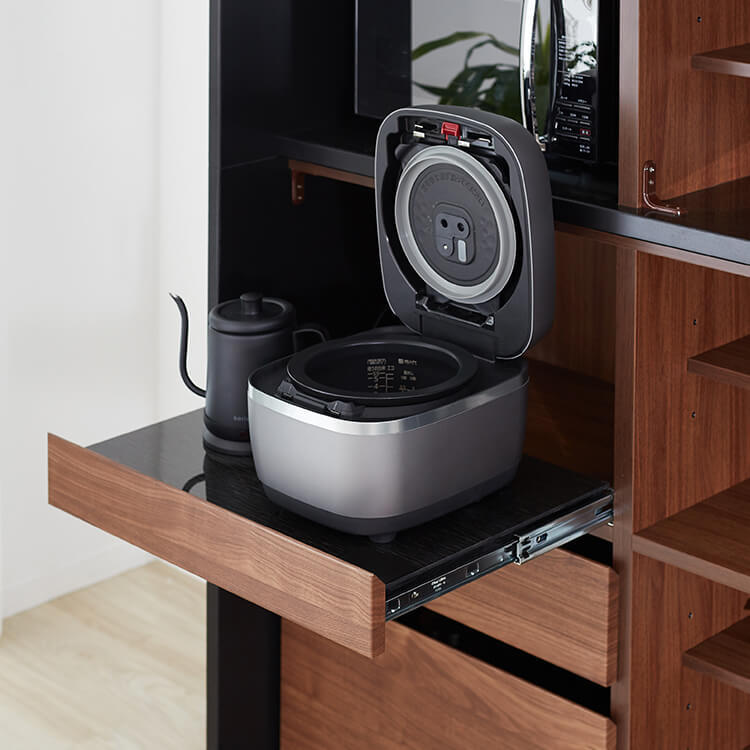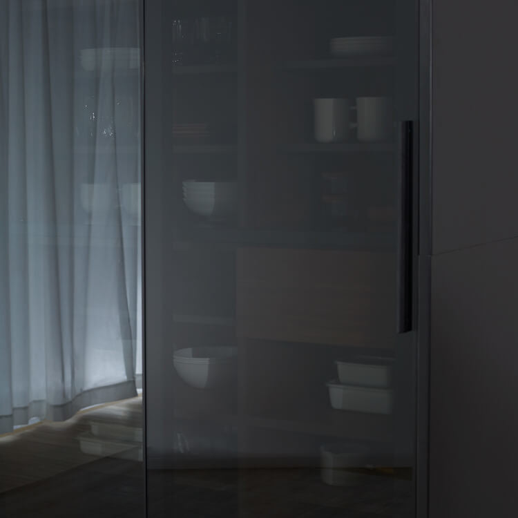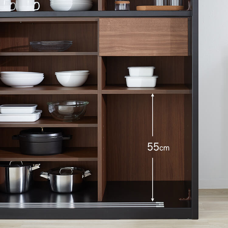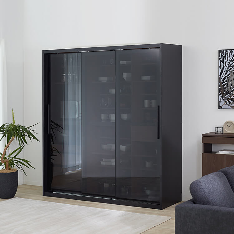 「幅180cmキッチン収納は、オーダーメイドになる…。」「もっと手軽に買えたら…。」そんなお客様のお声からできたのが、このキッチン収納。欲しかった幅180cmがオーダーメイドでなくても手に入ります。よくある幅160cmのキッチン収納よりも、さらに幅が20cm大きい幅180cmは、キッチンに無駄なスペースをつくることなく置けるサイズです。約幅180cmだからできる大量の収納力で、ごちゃつくキッチン周りをスッキリと美しく整頓。使い勝手のよいスモークガラスの3連引き戸がさらりとスタイリッシュに生活感を隠します。キッチン家電がまとまる家電収納と、食器類やストック品がまとまるラック収納。2タイプの収納を一つにすることで、使い勝手のいいキッチン収納に仕上がりました。