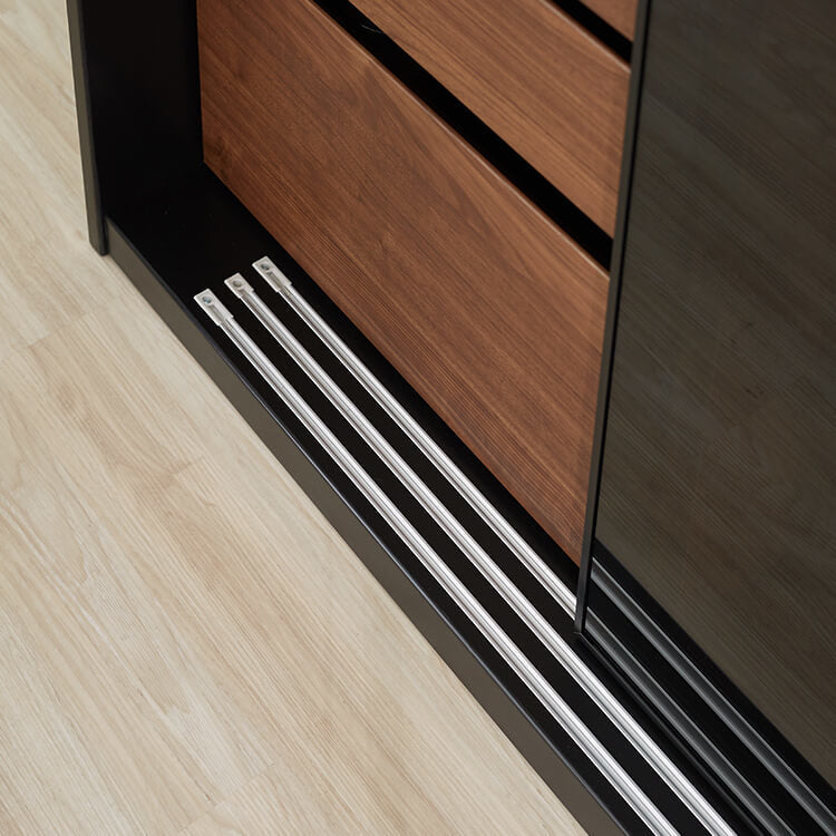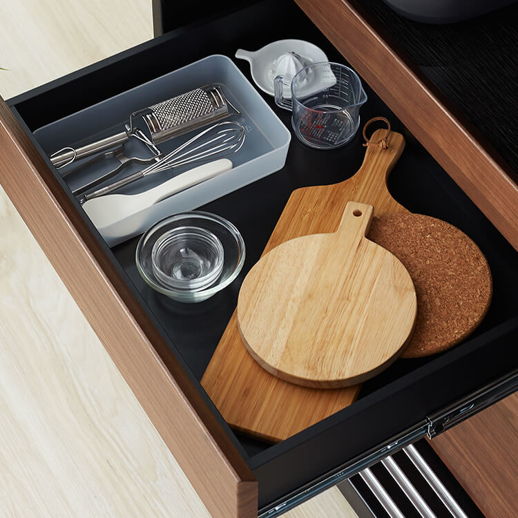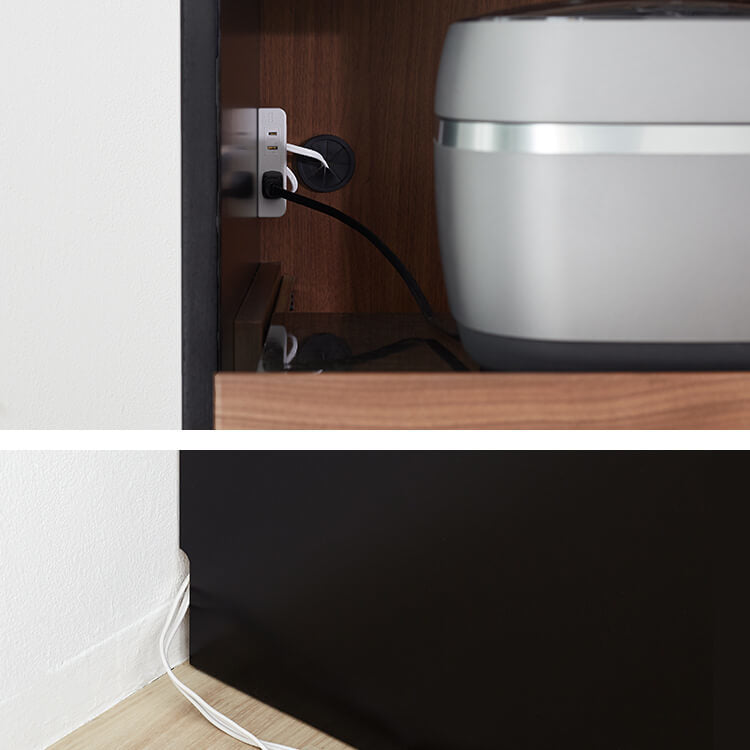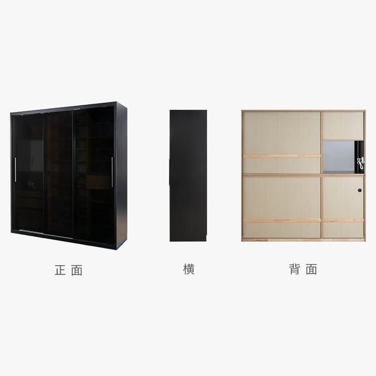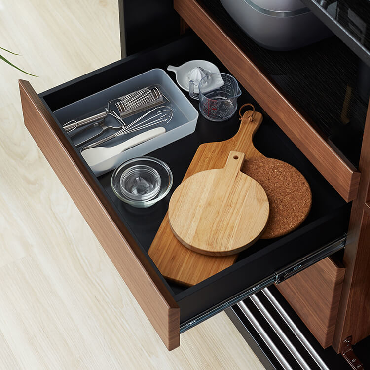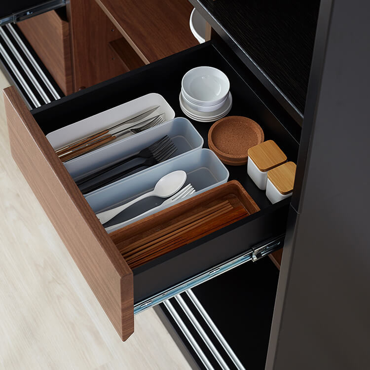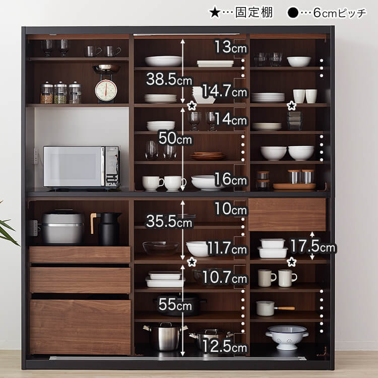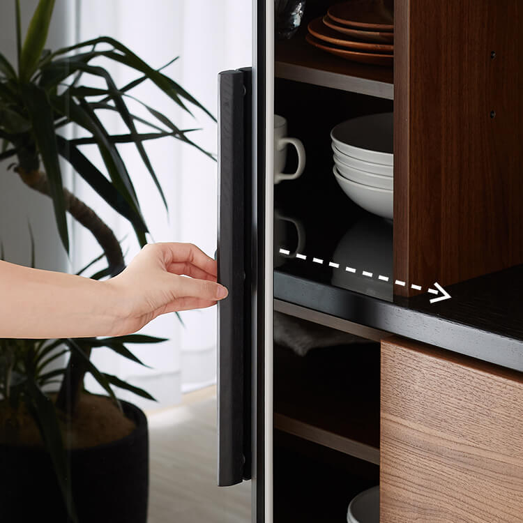 「幅180cmキッチン収納は、オーダーメイドになる…。」「もっと手軽に買えたら…。」そんなお客様のお声からできたのが、このキッチン収納。欲しかった幅180cmがオーダーメイドでなくても手に入ります。よくある幅160cmのキッチン収納よりも、さらに幅が20cm大きい幅180cmは、キッチンに無駄なスペースをつくることなく置けるサイズです。約幅180cmだからできる大量の収納力で、ごちゃつくキッチン周りをスッキリと美しく整頓。使い勝手のよいスモークガラスの3連引き戸がさらりとスタイリッシュに生活感を隠します。キッチン家電がまとまる家電収納と、食器類やストック品がまとまるラック収納。2タイプの収納を一つにすることで、使い勝手のいいキッチン収納に仕上がりました。
