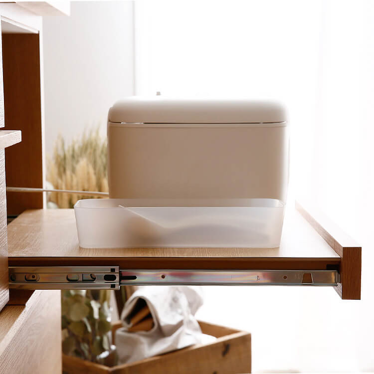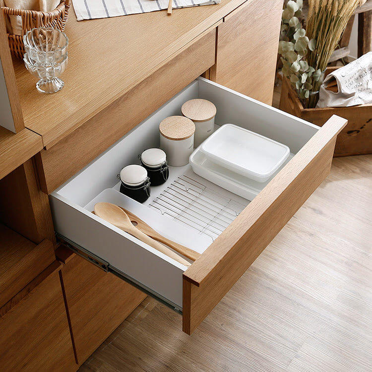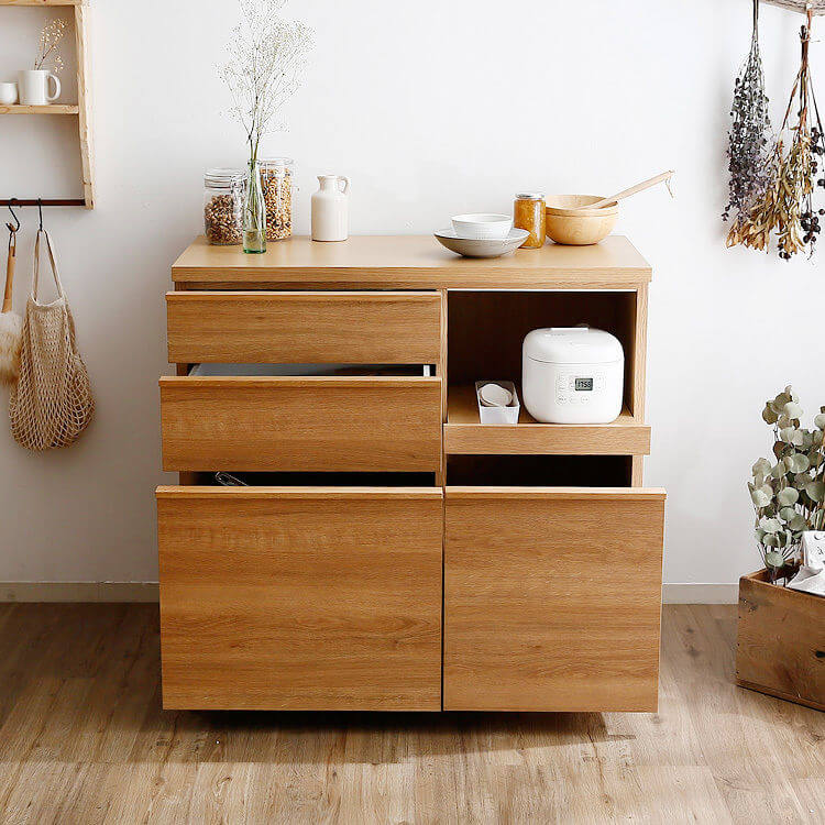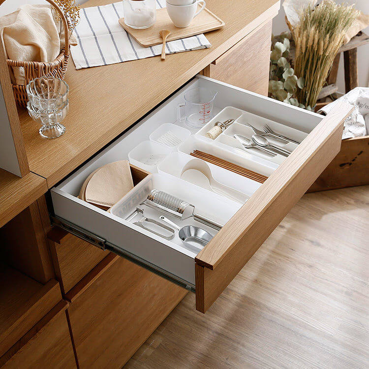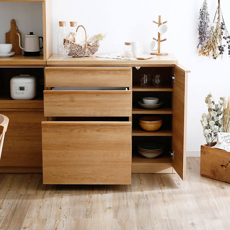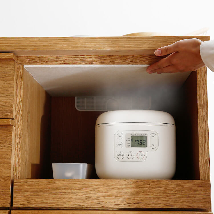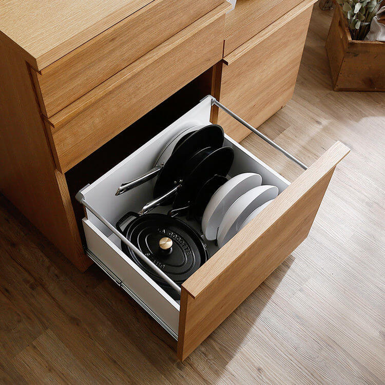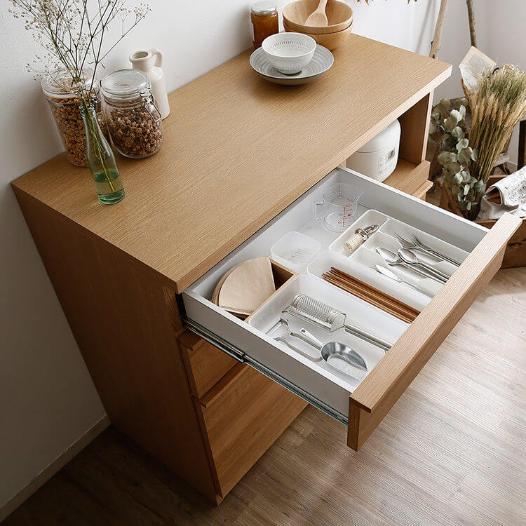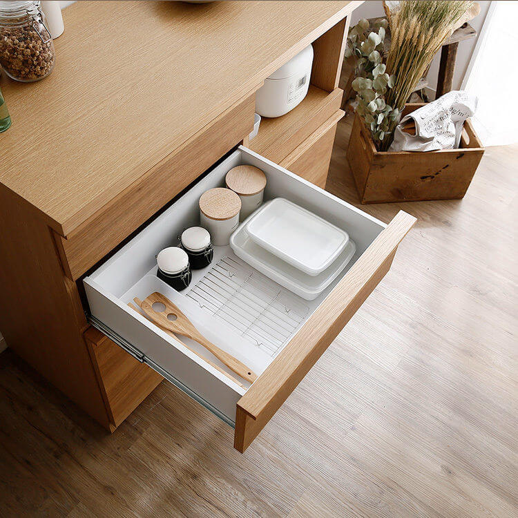 オーク材モチーフの温かな風合いが魅力、繊細で優しげなあこがれの大人カフェを。圧迫感が少なくお部屋に設置しやすいカウンタータイプが登場。 使い方に合わせて2タイプからお選びいただけます。収納するものに合わせて高さを使い分けられる便利な引き出し。金属製のフルスライドレールで、たくさんものを入れても一番奥までスムーズに引き出せます。