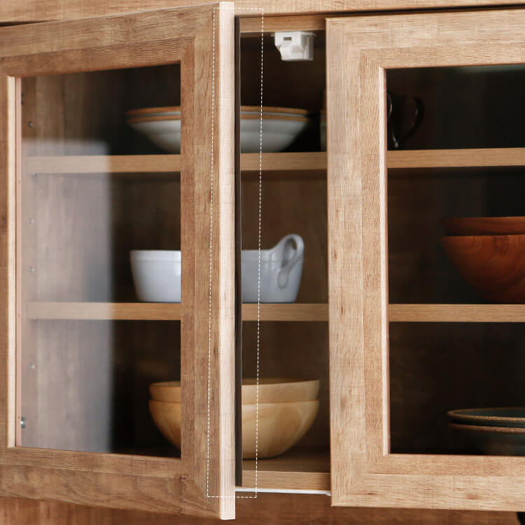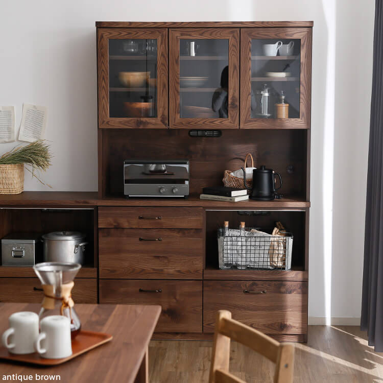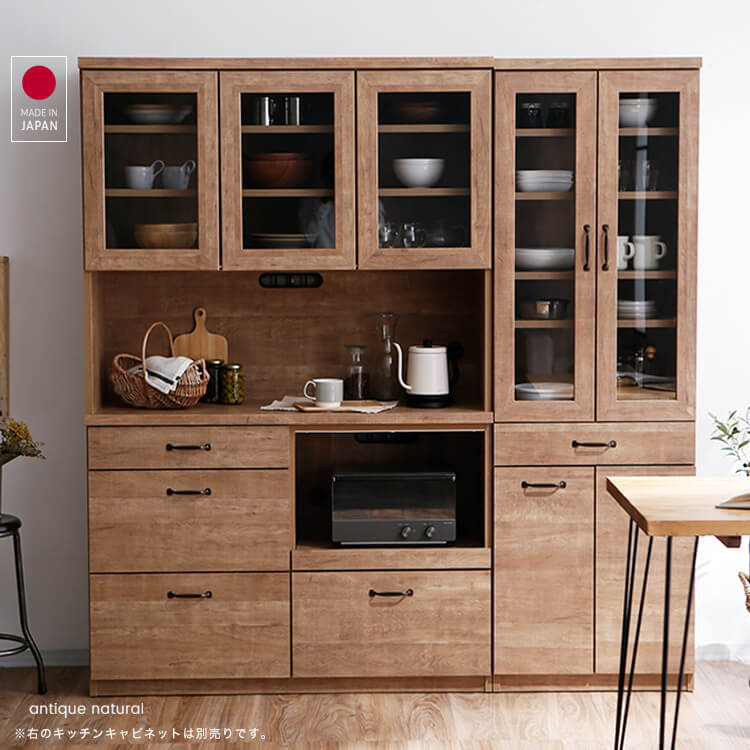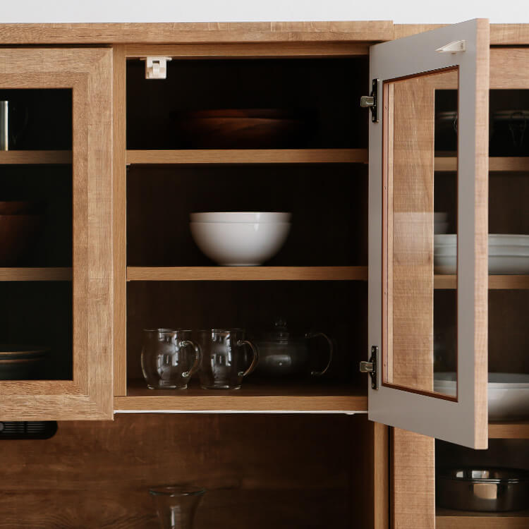 木目を楽しむ、アンティーク調のキッチンキャビネットができました。ダメージ感のある加工を施した、乾いた風合いのアンティークナチュラル。ラフな質感が、肩の力を抜いたエフォートレスな魅力を感じさせます。浮き立つ木目が美しい、コーヒーのような深みのあるアンティークブラウン。艶のある上品な雰囲気が、落ち着きのある大人の空間を作り出します。取っ手は、全体の雰囲気をぐっと高めてくれる大切なポイントです。