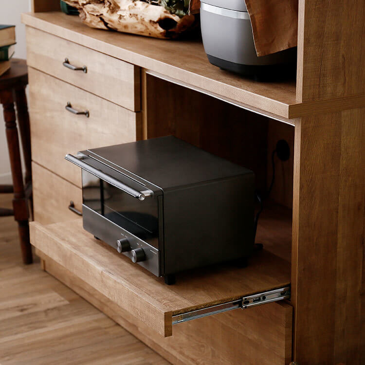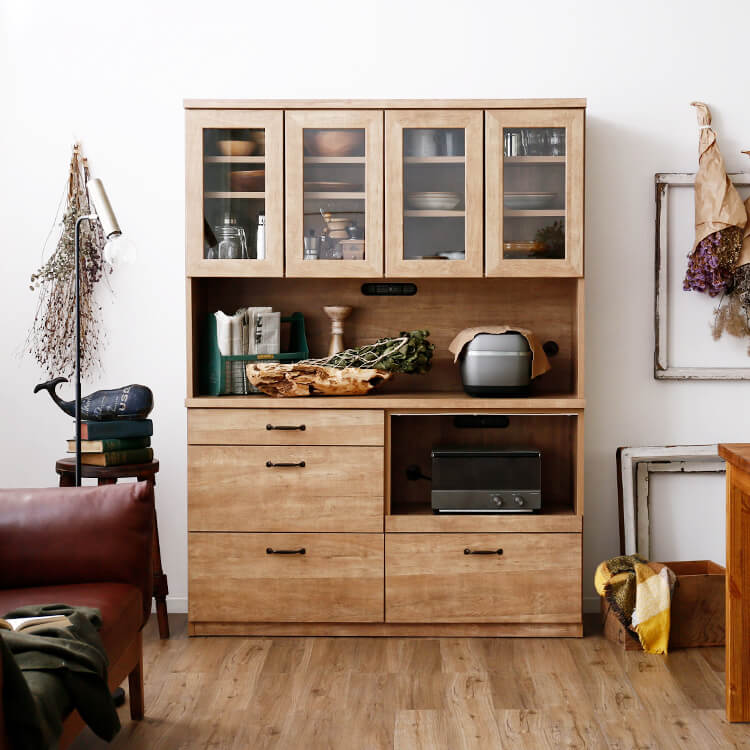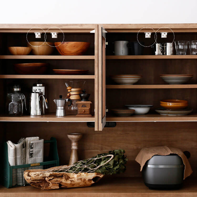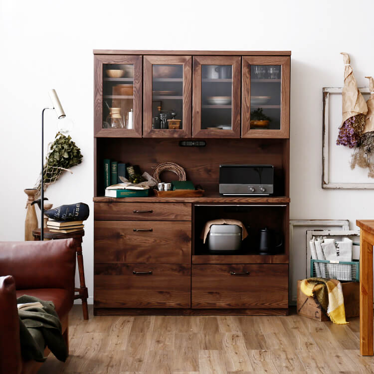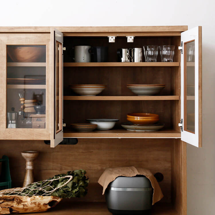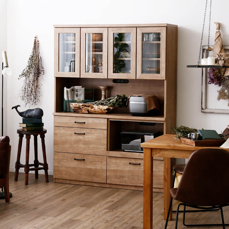 時が作る質感を。木目を楽しむ、アンティーク調キッチンキャビネット。ダメージ感のある加工を施した、乾いた風合いのアンティークナチュラル。 ラフな質感が、肩の力を抜いたエフォートレスな魅力を感じさせます。浮き立つ木目が美しい、コーヒーのような深みのあるアンティークブラウン。 艶のある上品な雰囲気が、落ち着きのある大人の空間を作り出します。取っ手は、全体の雰囲気をぐっと高めてくれる大切なポイントです。