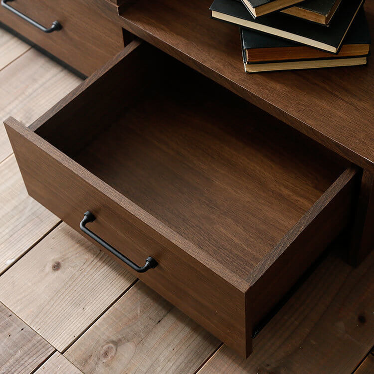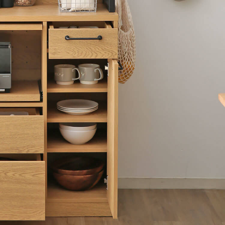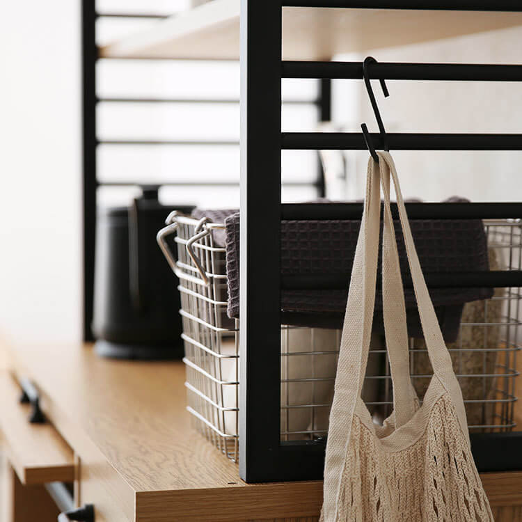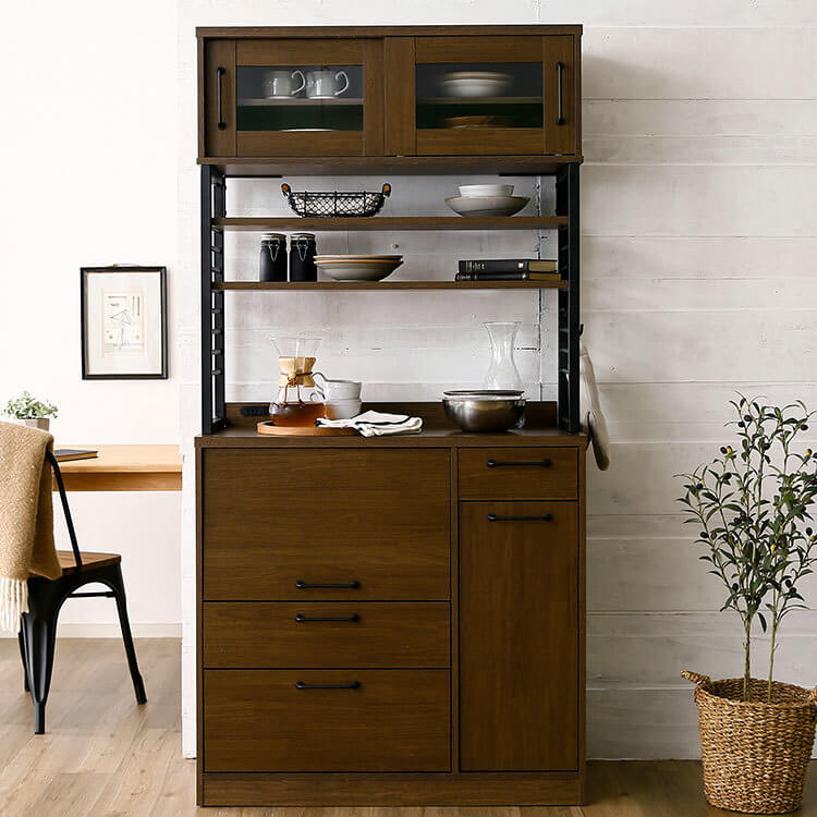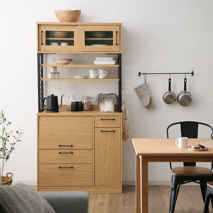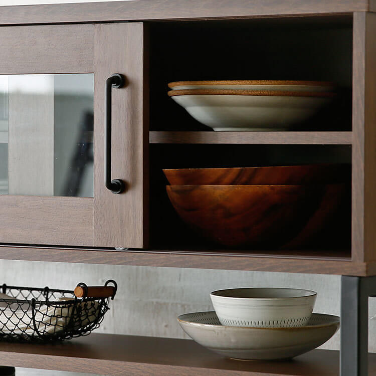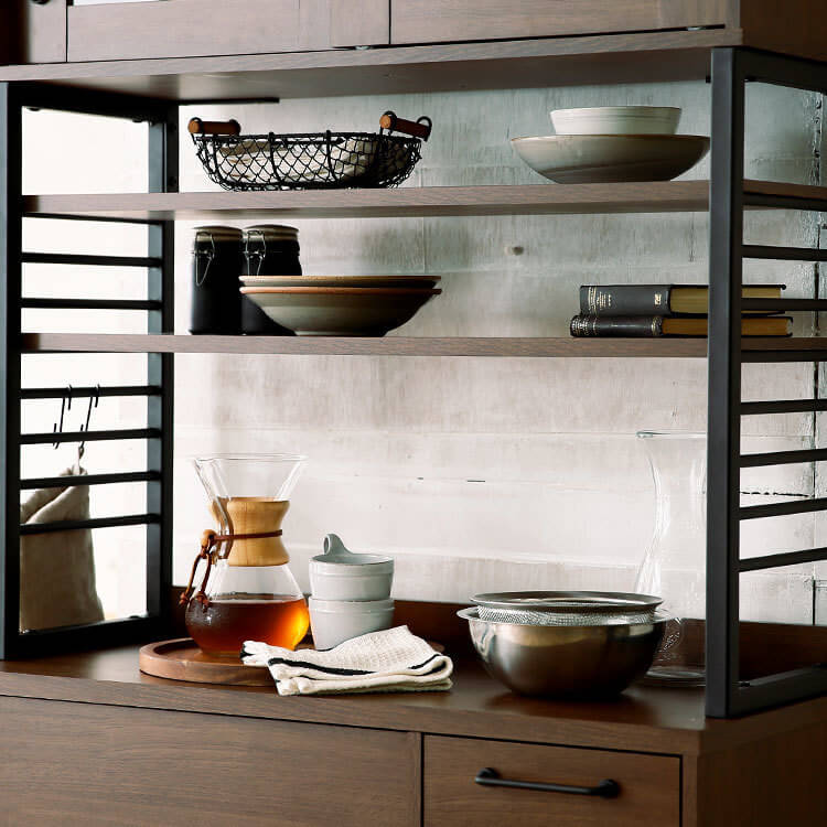 スチールと木目調の異素材のバランス。インダストリアル調が引き立つ洗練されたデザイン。収納充実のキッチンキャビネット。カトラリー等の小物から食材のストック、家電機器まで収納できる大容量。生活感もスッキリ隠せます。棚板にはカップ等の小物や、調味料・ナプキンなど頻繁に使うものを置いたり、天板には家電機器を置いたり、使い勝手に優れたオープン収納スペース。2枚の棚板は可動式。取り外し、高さ調整も簡単だから、背の高いものもラクラク収納。