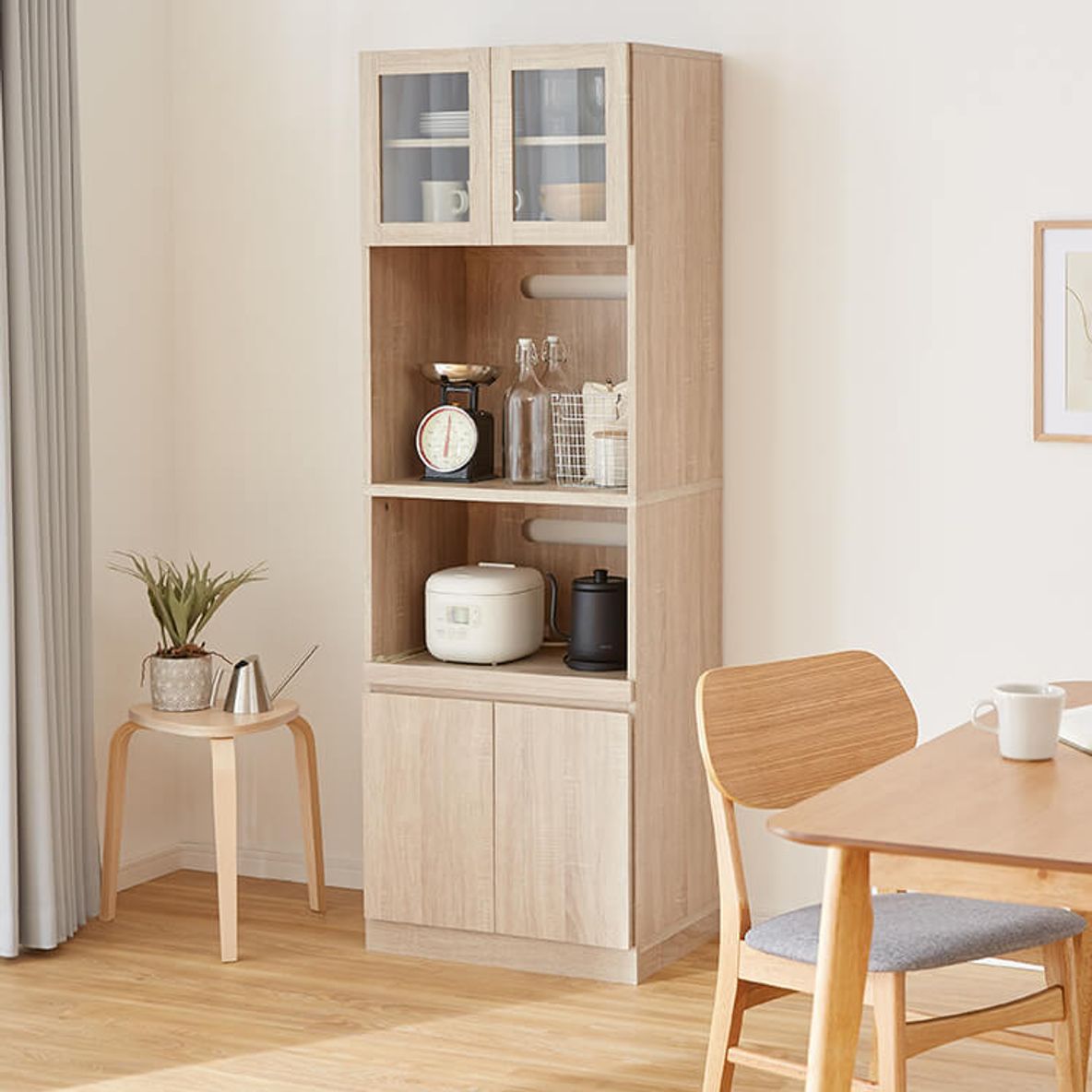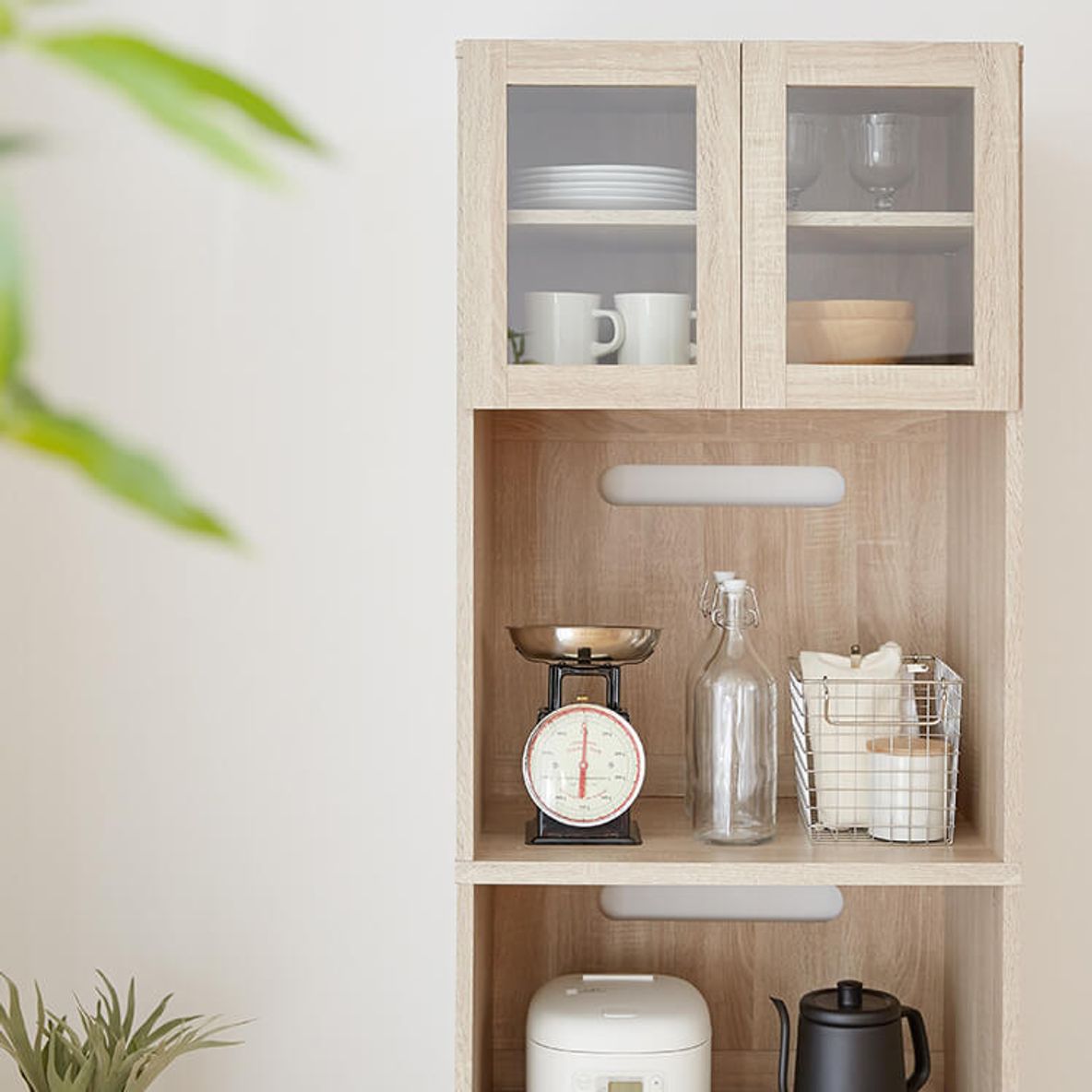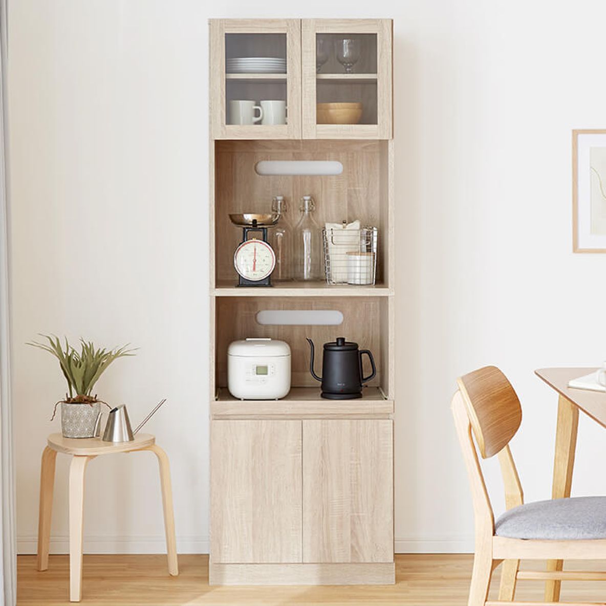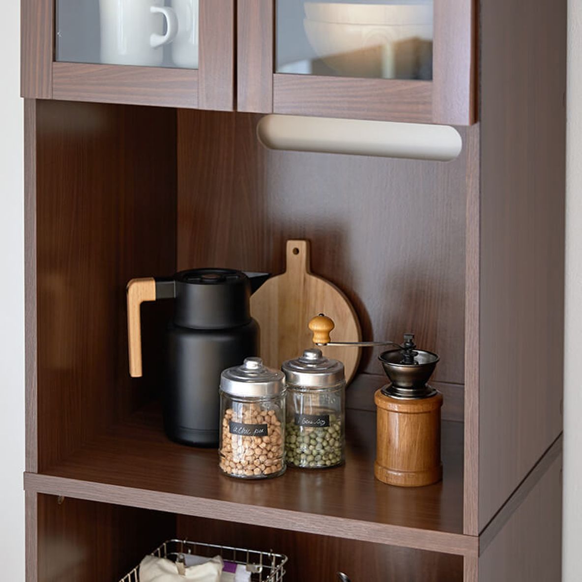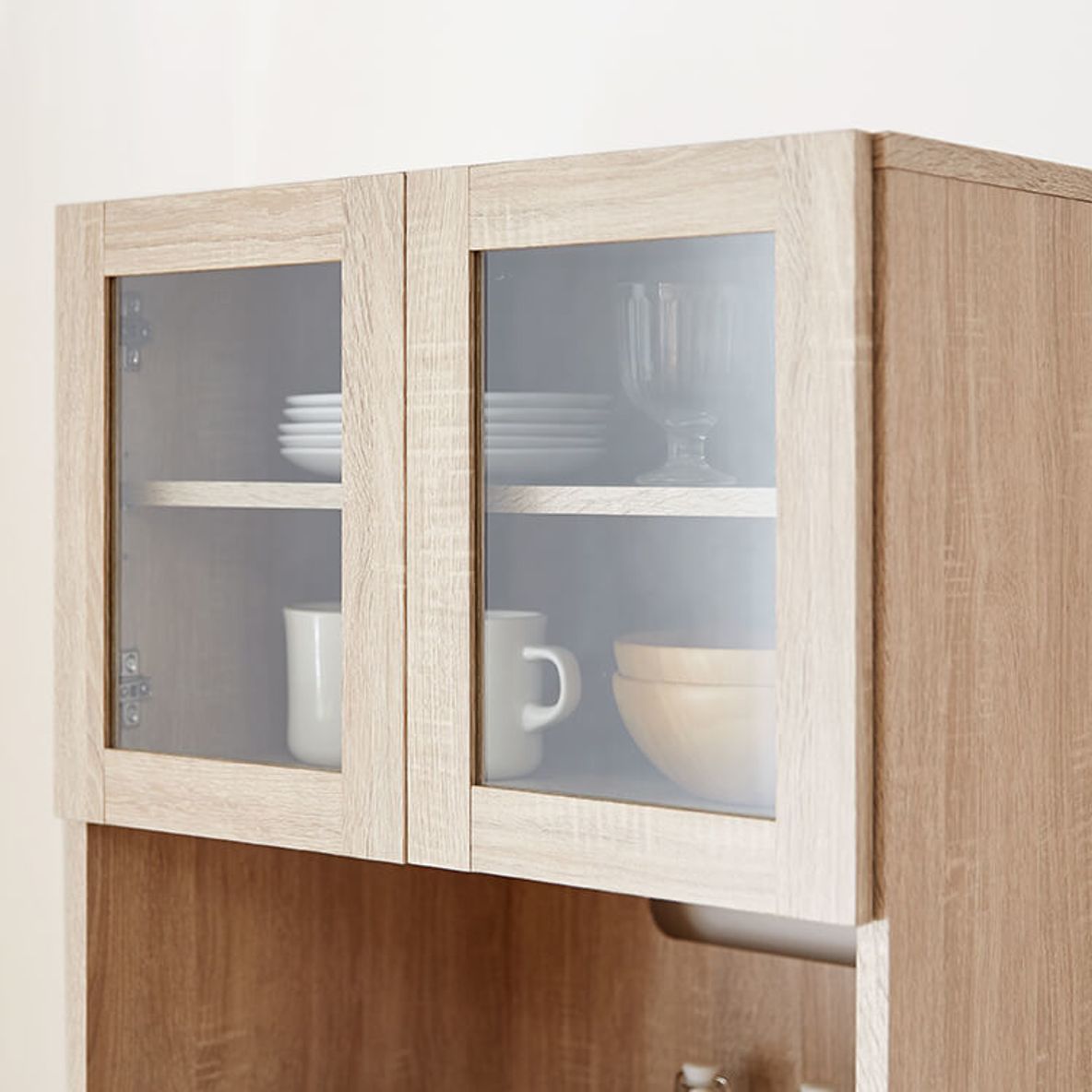 幅をとりすぎない丁度良い大きさとキッチンアイテムがすっきり片付く収納力。機能とムードにこだわったキッチンボードで、毎日のお料理がはかどる使いやすいキッチンへ。レンジ、ポット、炊飯ジャー、コーヒーメーカー…毎日使う家電製品がスッキリ片付きます。さらに豊富な収納スペースで、食器から鍋など大きなものまで収納可能です。幅はコンパクトな59cm、さらに上の空間を利用したハイタイプなので、あらゆる広さのお部屋で活躍してくれます。置く食器類を美しく見せてくれるガラス扉収納。扉のガラスにはキレイな透明感を誇る強化ガラスを使用しました。一般的なガラス(フロート板ガラス)に比べると3~5倍程度の強度があるガラスです。